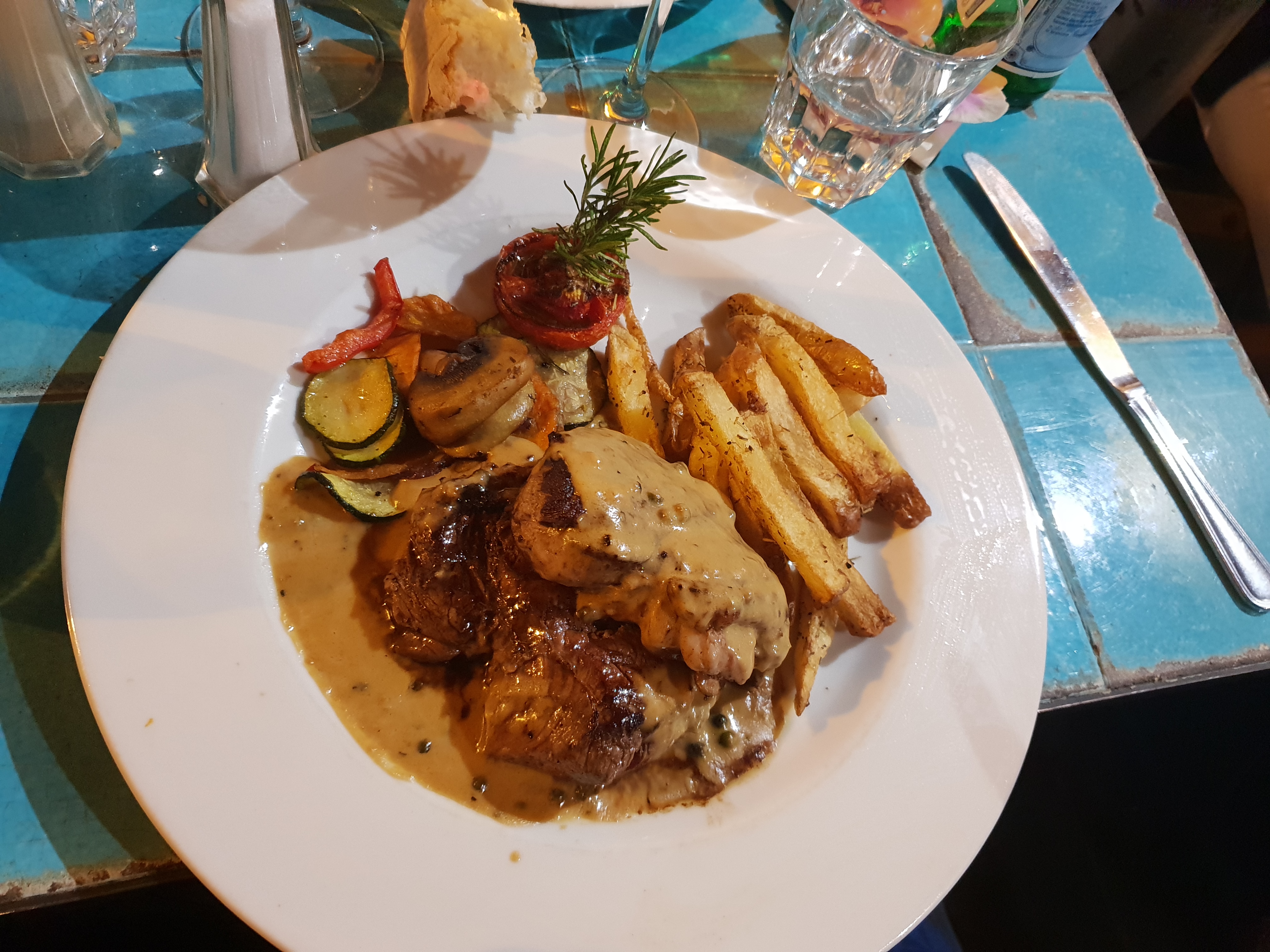 Nous avons mangé ici le dernier soir des vacances. Sauf pour la soupe à l'oignon française qui était un peu décevante. Tout était délicieux. Mon steak au poivre était parfait et à un prix correct. Je le recommande vivement.