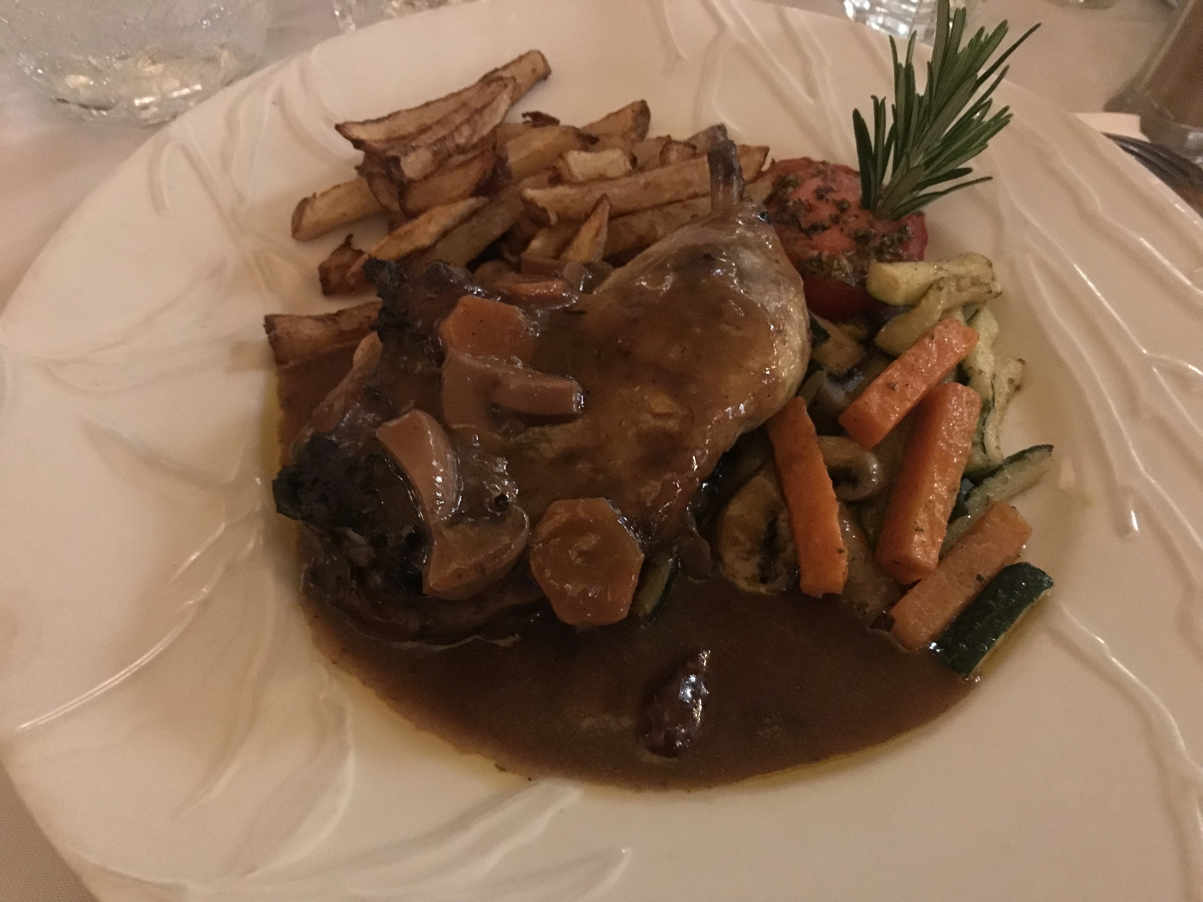Nos entrées ont mis une heure et 20 minutes pour arriver. La soupe à l'oignon française n'était pas bonne. Le plat principal de canard était bon bien qu'un peu dur. Le coq au vin était sec.