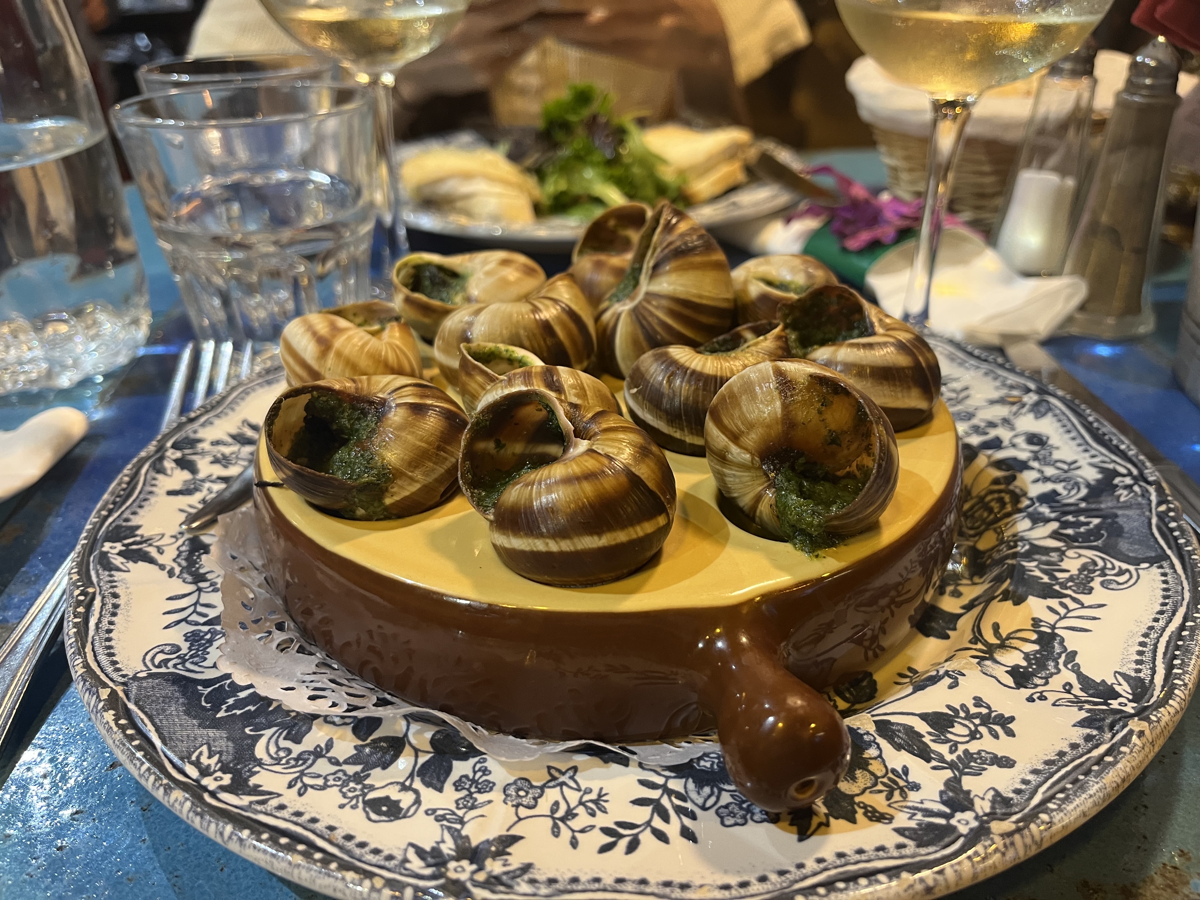 Les escargots ne sont pas savoureux, tout comme la soupe à l'oignon et le foie gras à la poire.