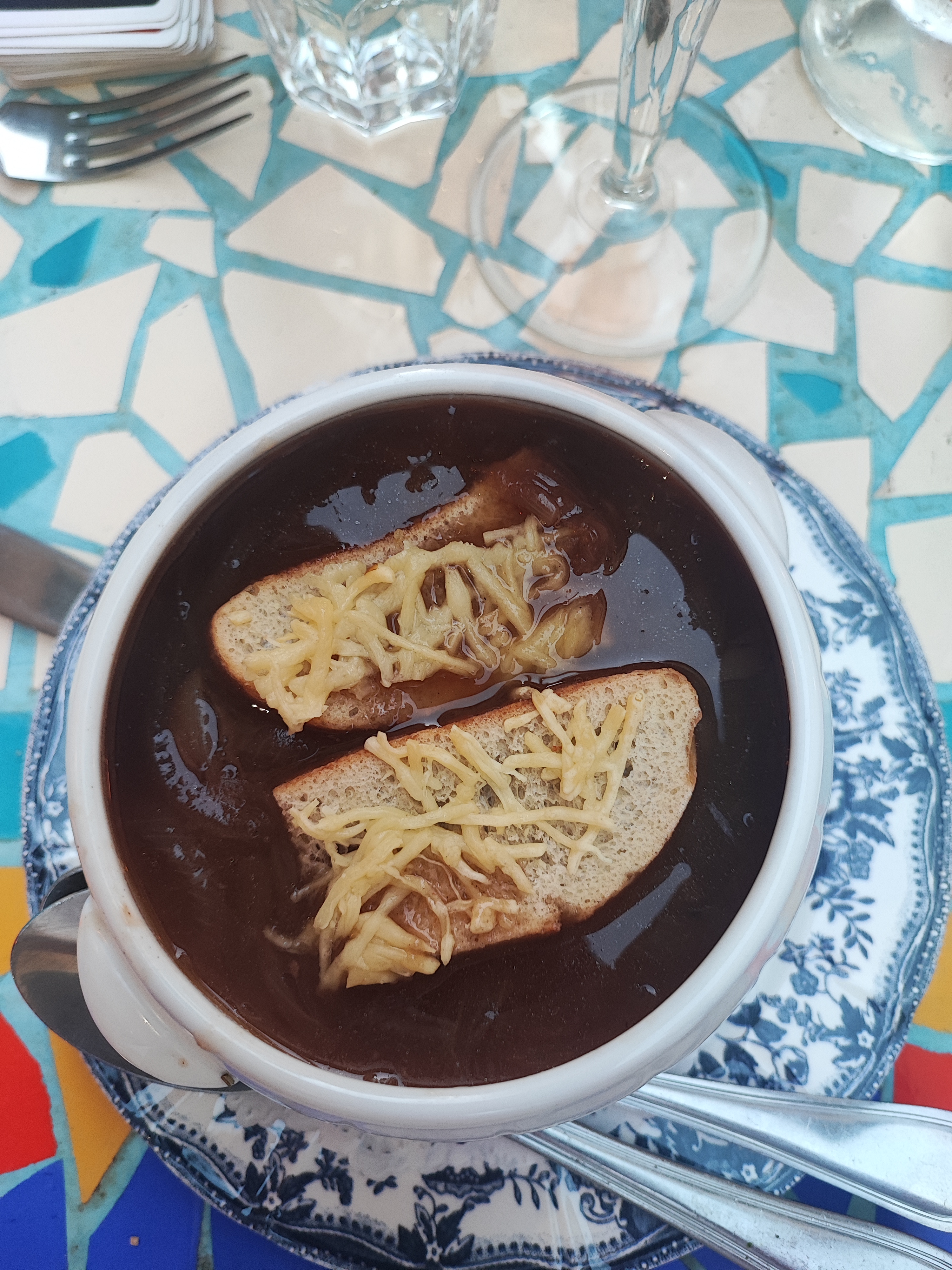 Nous avons apprécié notre repas ici, nous avons eu la salade d'artichauts, la salade de camembert et la soupe à l'oignon pour commencer, puis le coq au vin et la salade de fleurs de courgettes en plat principal. Nous recherchions de la cuisine française plutôt que beaucoup de pâtes et de pizzas à proximité ! Cet endroit n'a pas été déçu et nous avons apprécié un délicieux repas dans un bon emplacement.