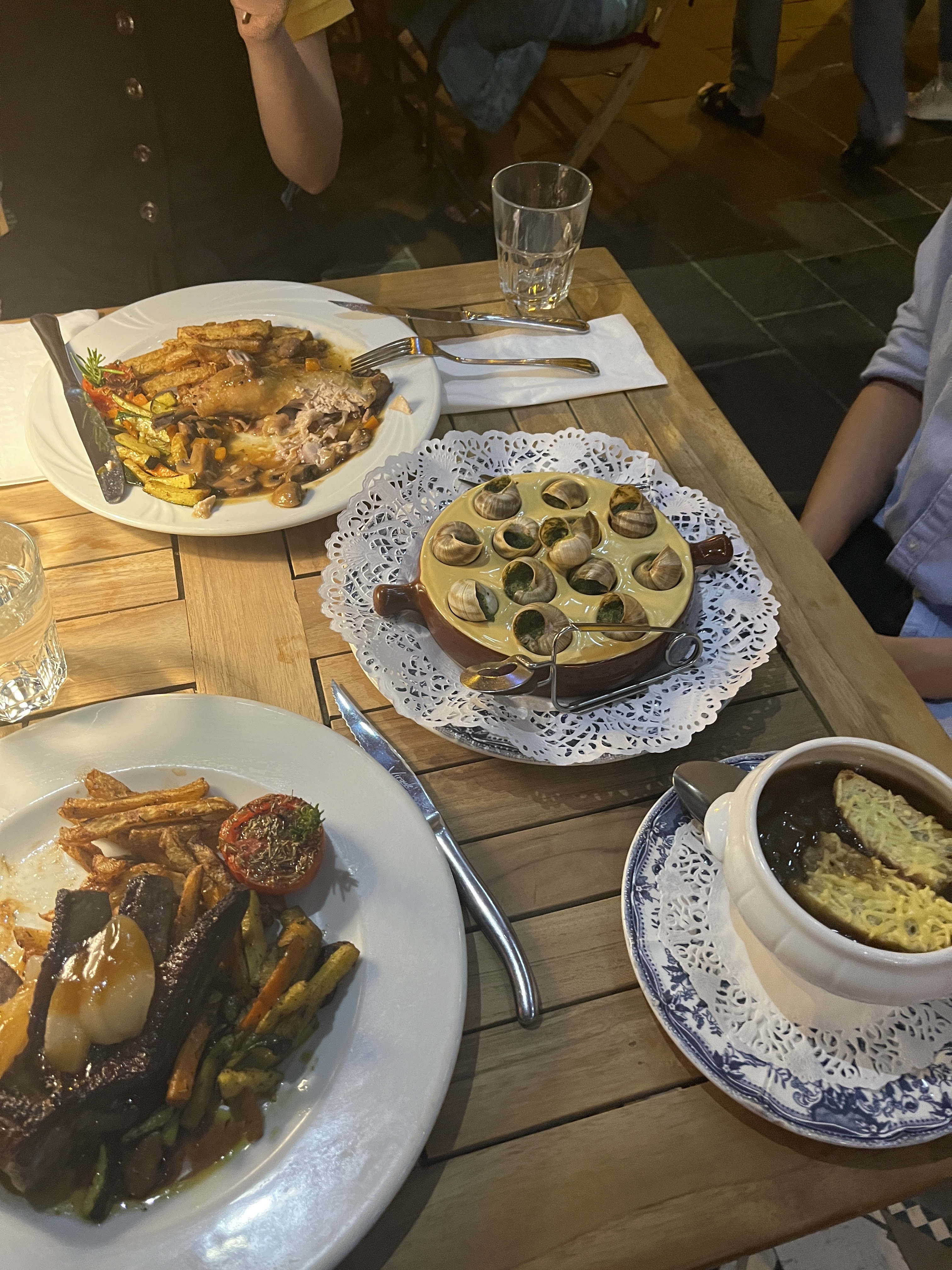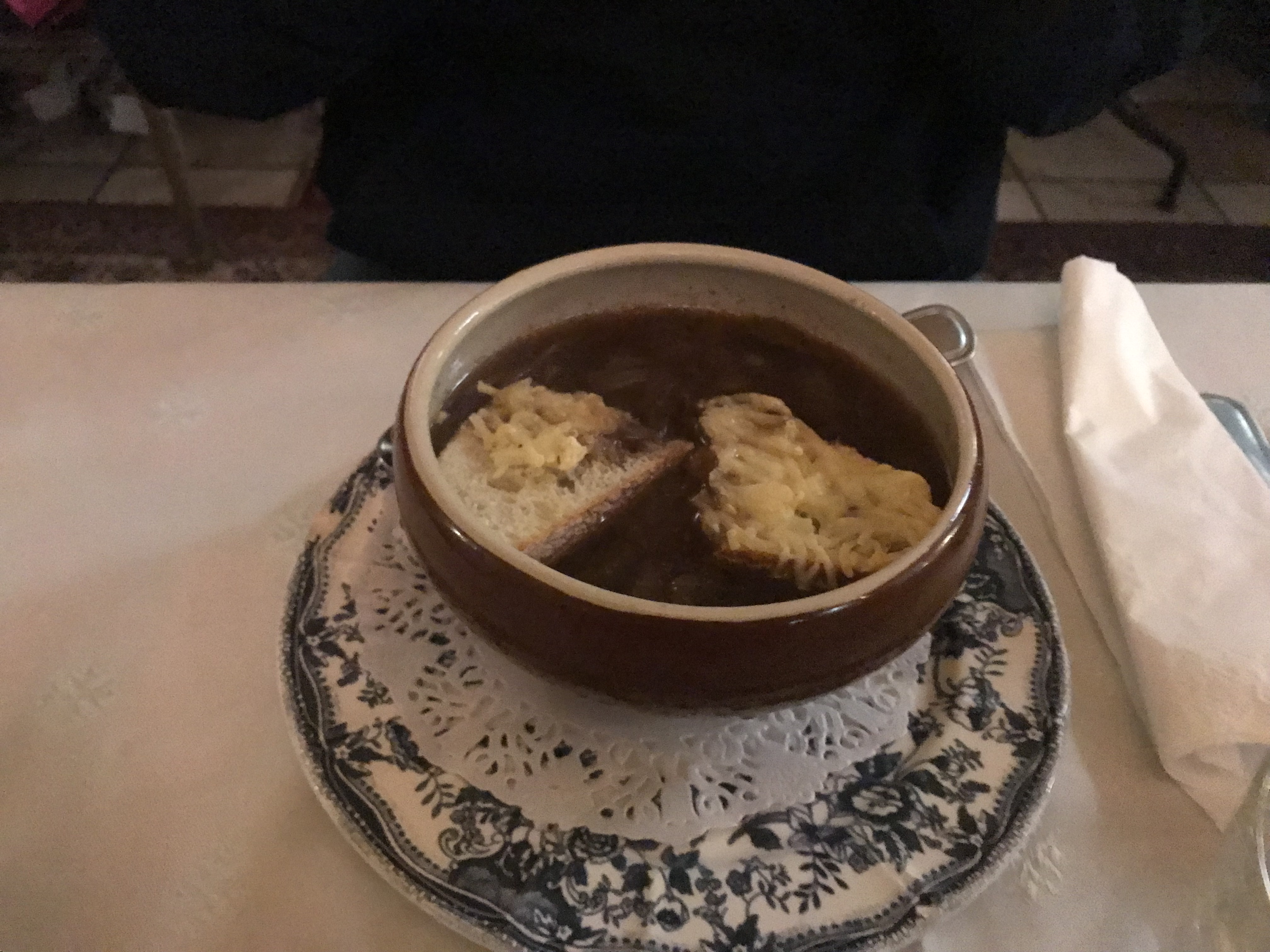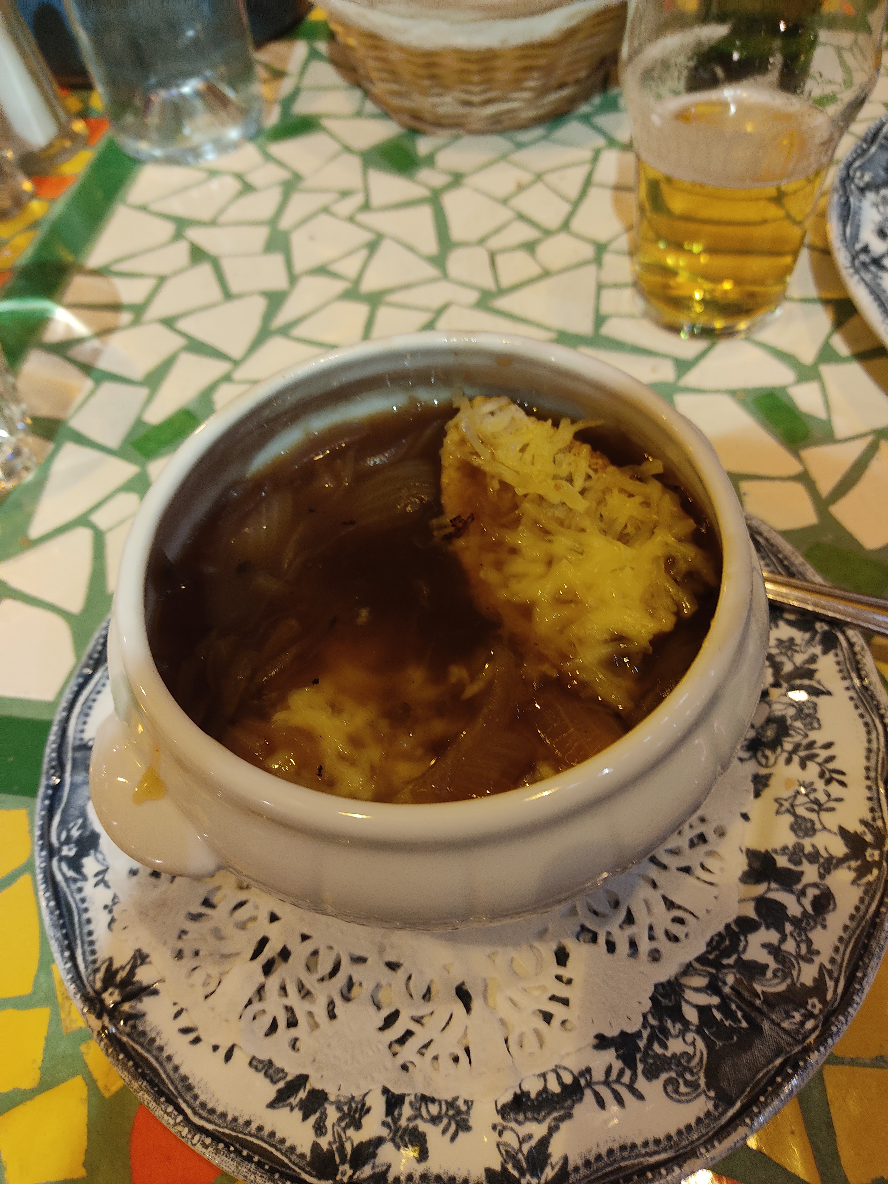 Donc… honnêtement, je ne le recommanderais pas Soupe à l'oignon, escargots, foie gras - tout était à niveau moyen ou même inférieur à mon humble avis Jetez un oeil autour