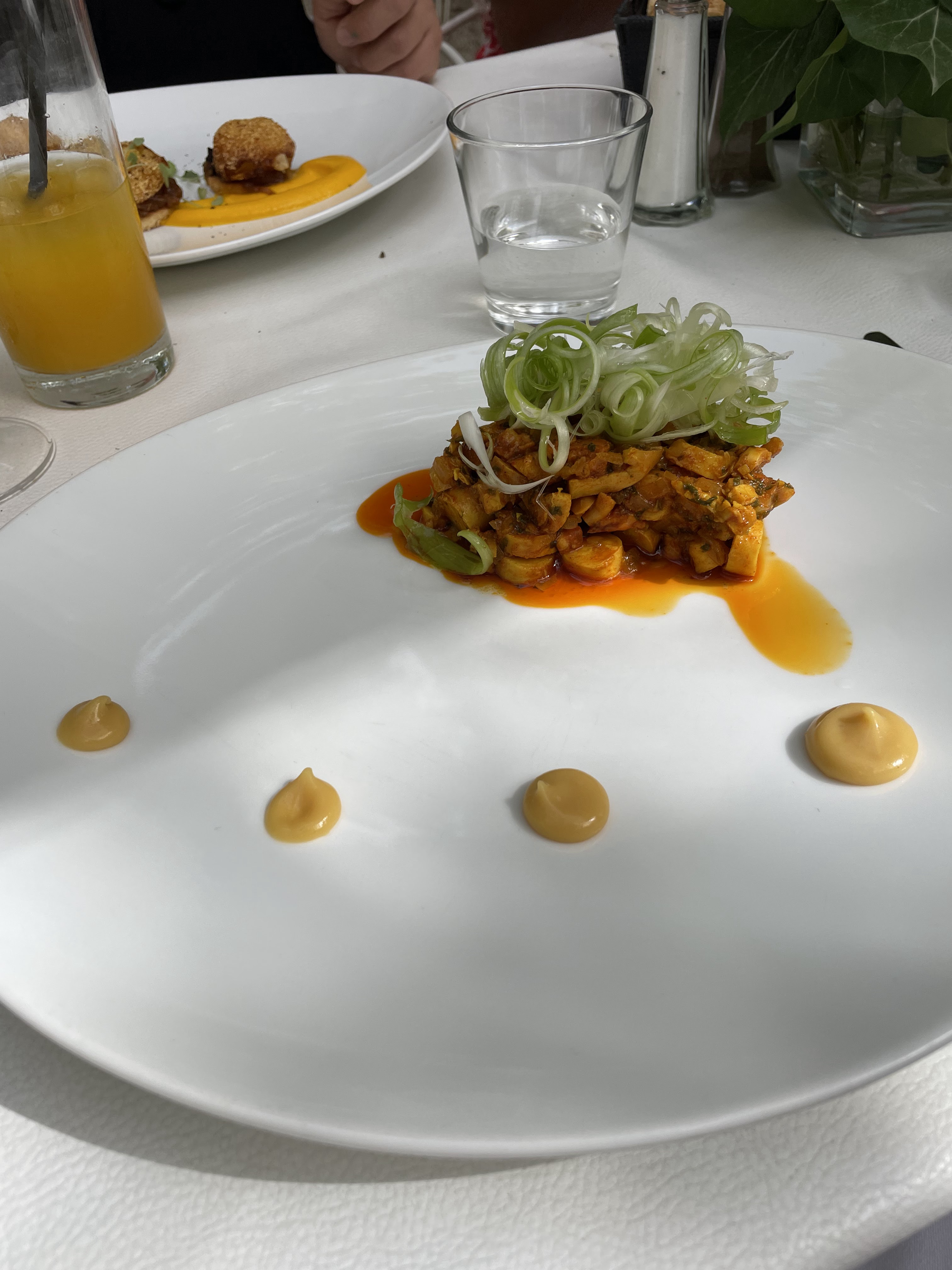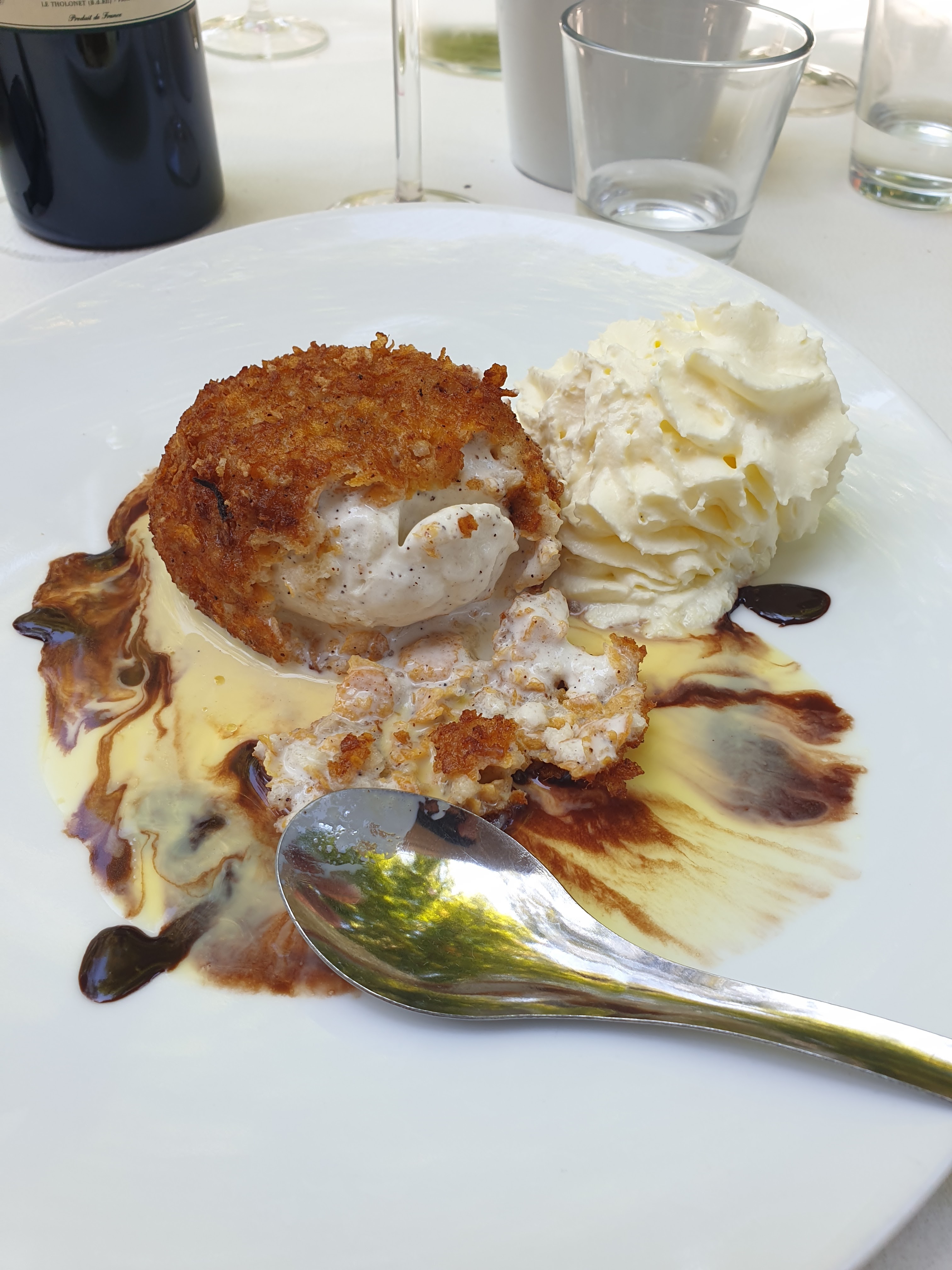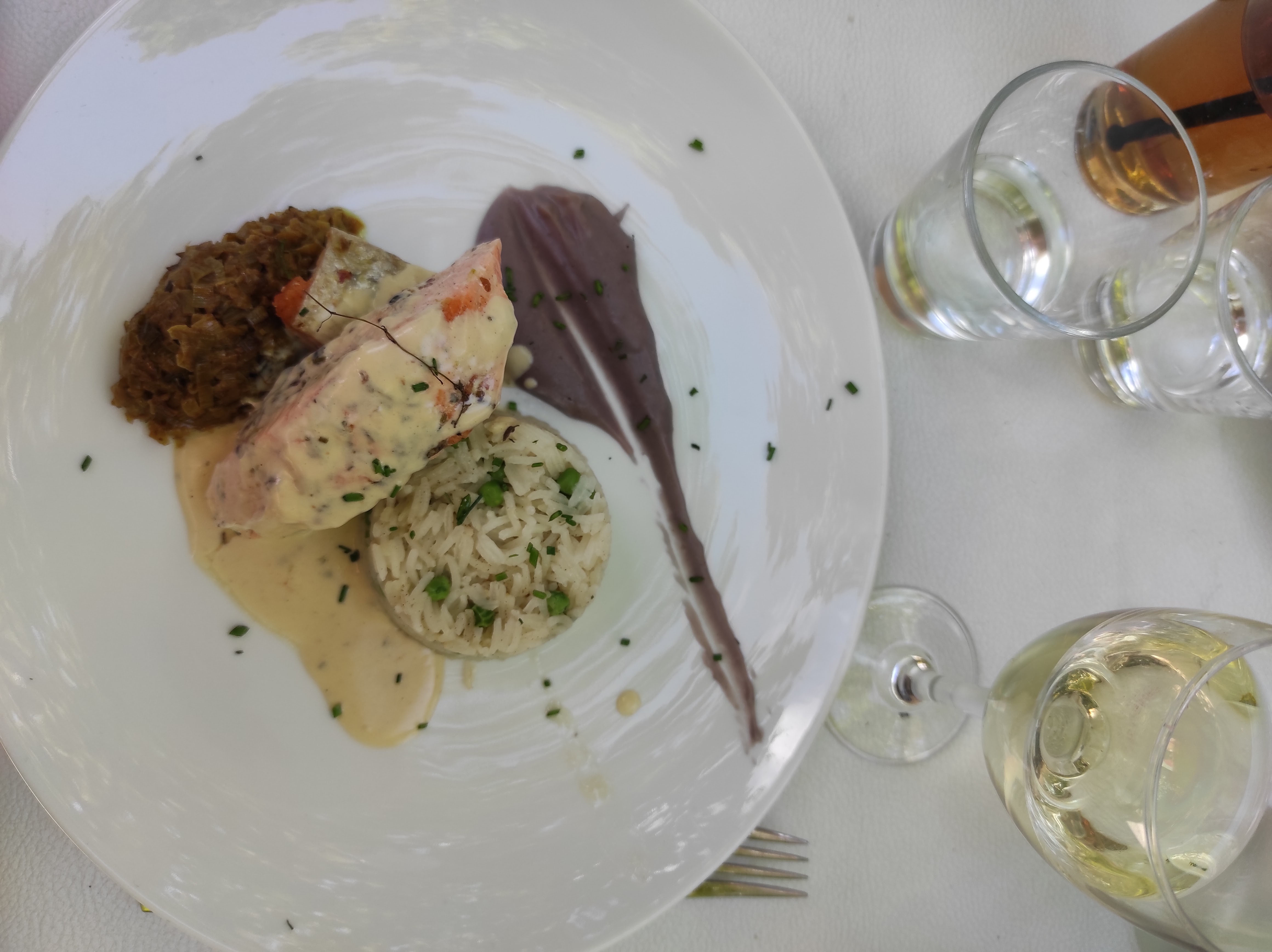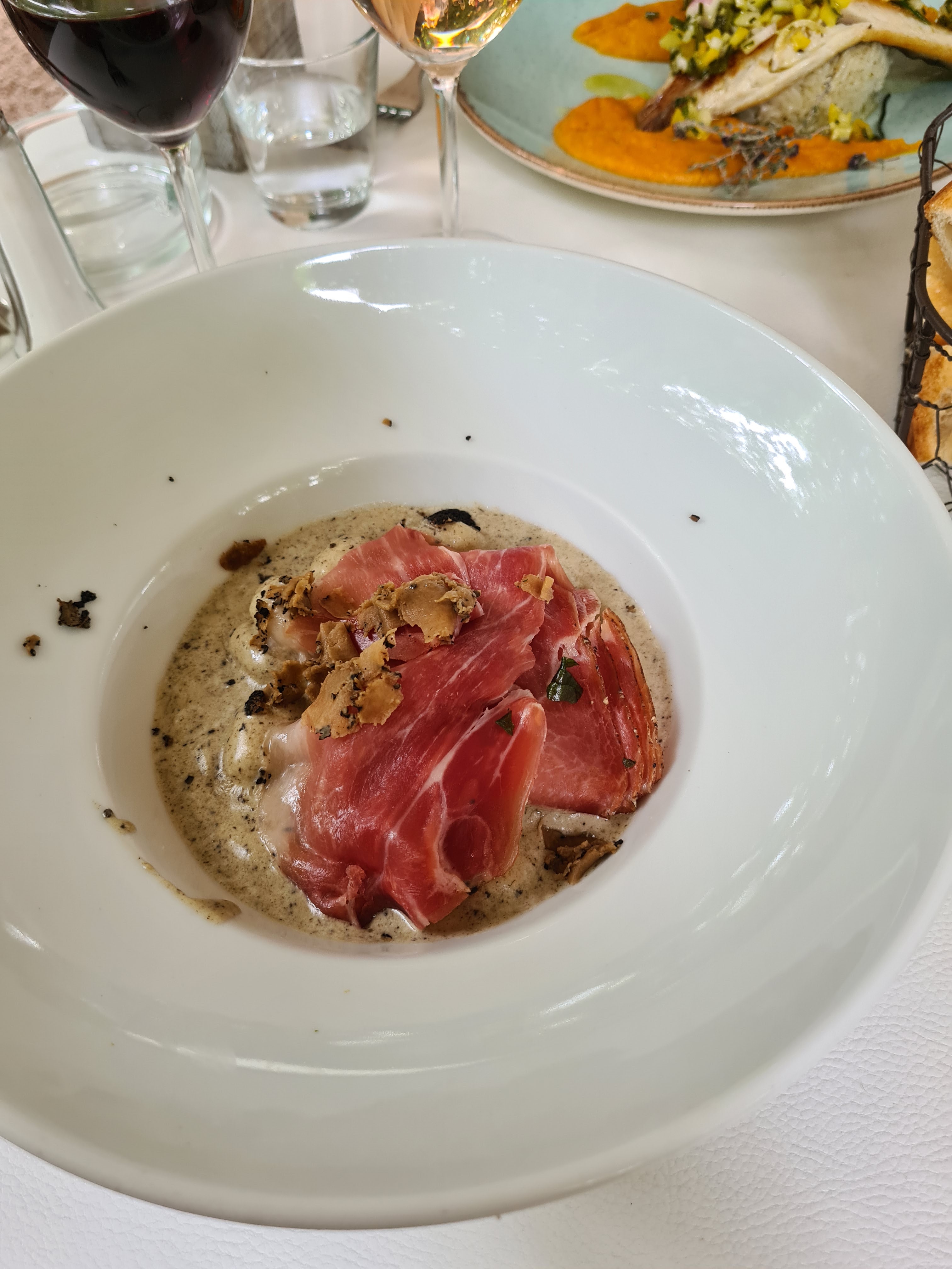 Absolument délicieux. On a pris une tartelette tomate burrata avec la burrata fouettée (je savais pas que c'était possible) : à se damner. Puis le risotto aux truffes, très bon également. Le service était un peu lent, mais l'atmosphère est tellement agréable avec la terrasse sous les arbres, les tourterelles qui roucoulent, la petite brise, que ça ne dérange pas de passer un peu plus longtemps que prévu à profiter.