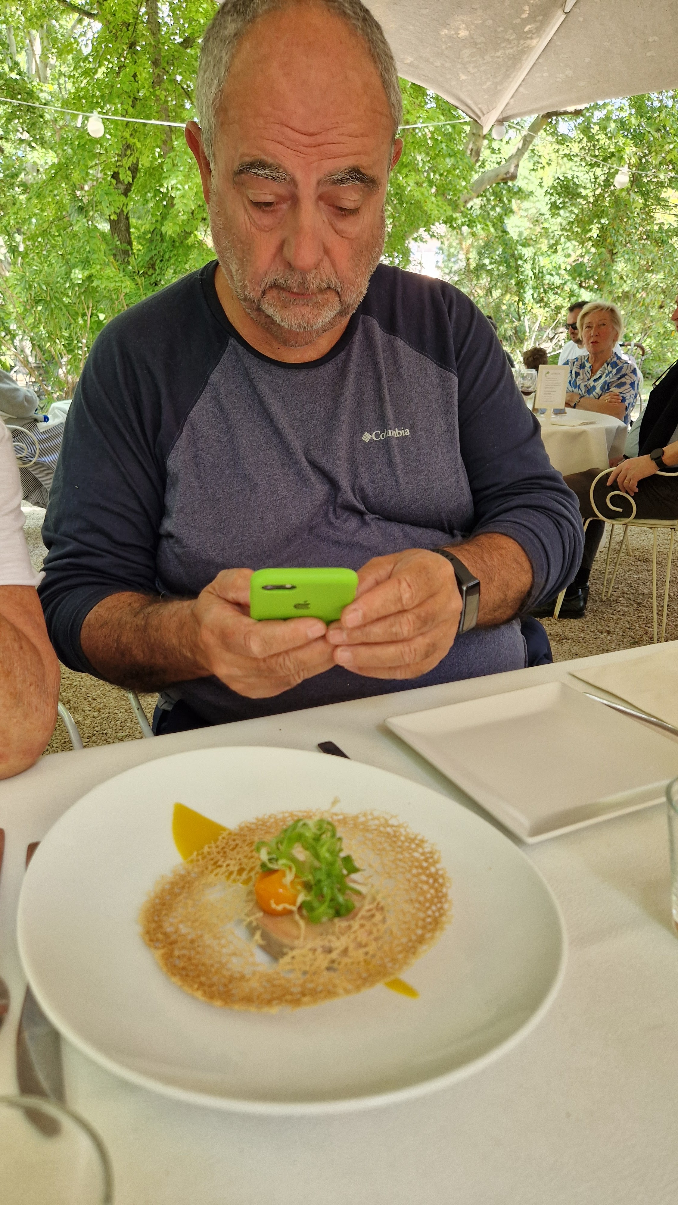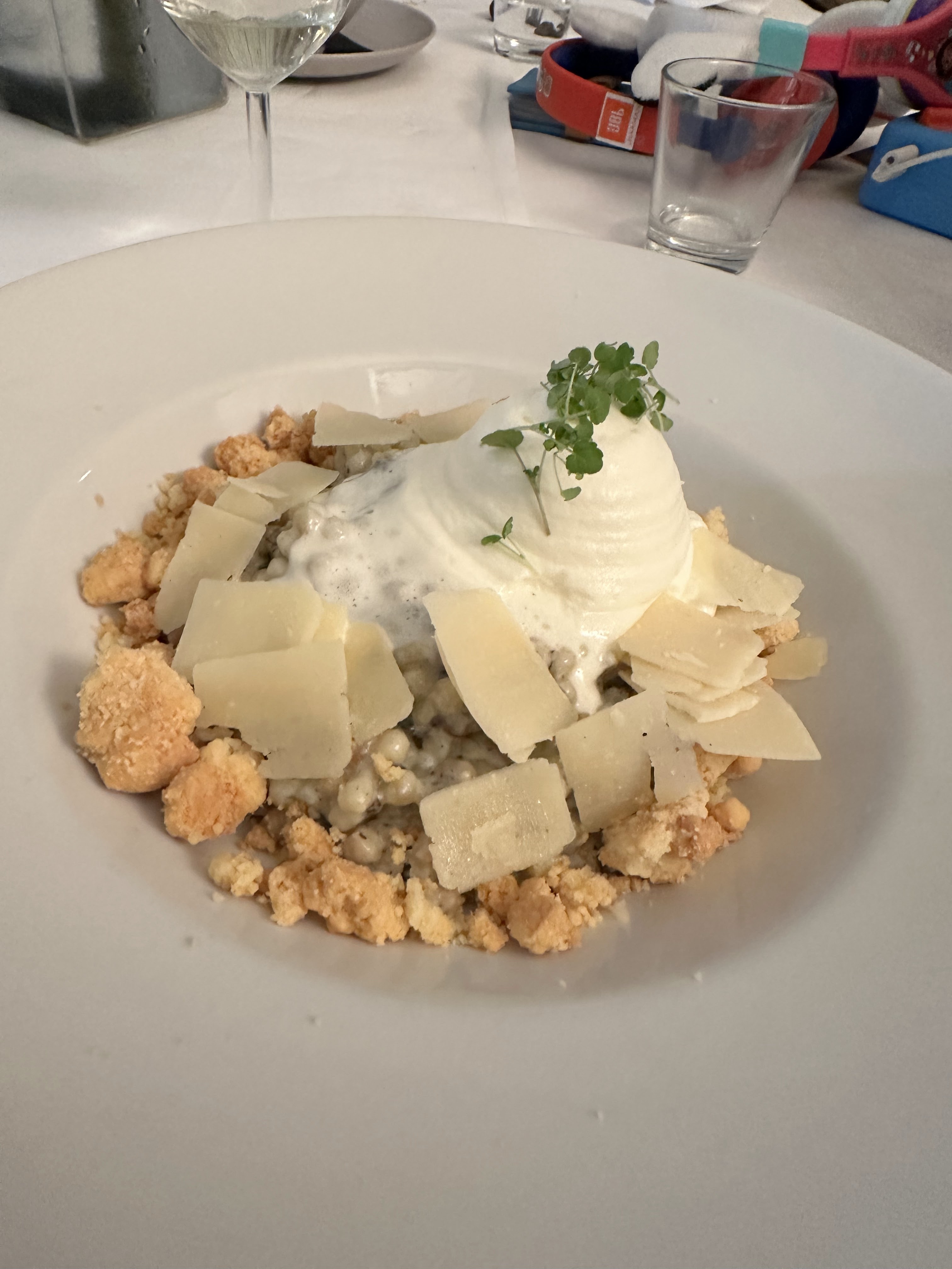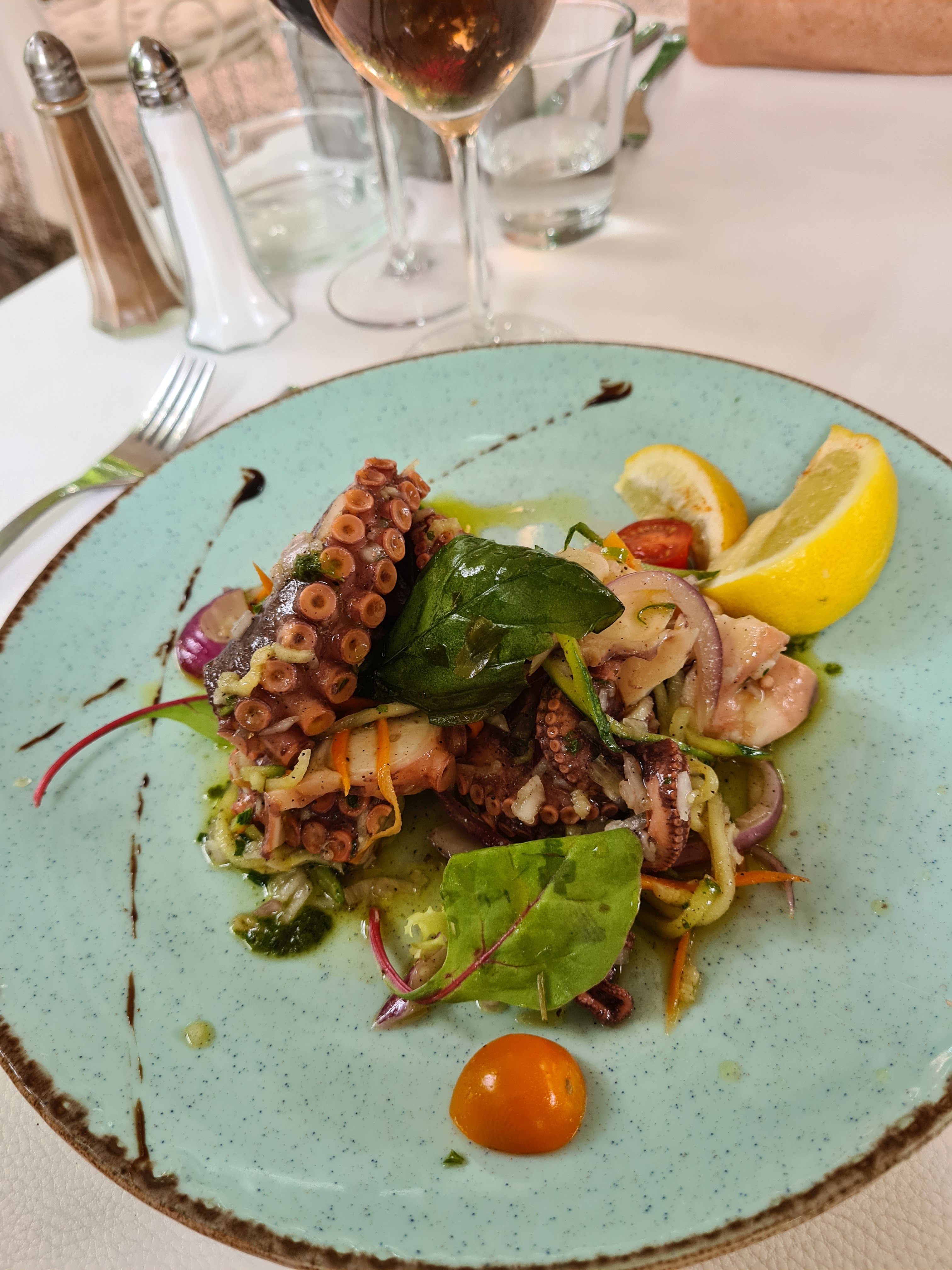 Absolument délicieux. On a pris une tartelette tomate burrata avec la burrata fouettée (je savais pas que c'était possible) : à se damner. Puis le risotto aux truffes, très bon également. Le service était un peu lent, mais l'atmosphère est tellement agréable avec la terrasse sous les arbres, les tourterelles qui roucoulent, la petite brise, que ça ne dérange pas de passer un peu plus longtemps que prévu à profiter.