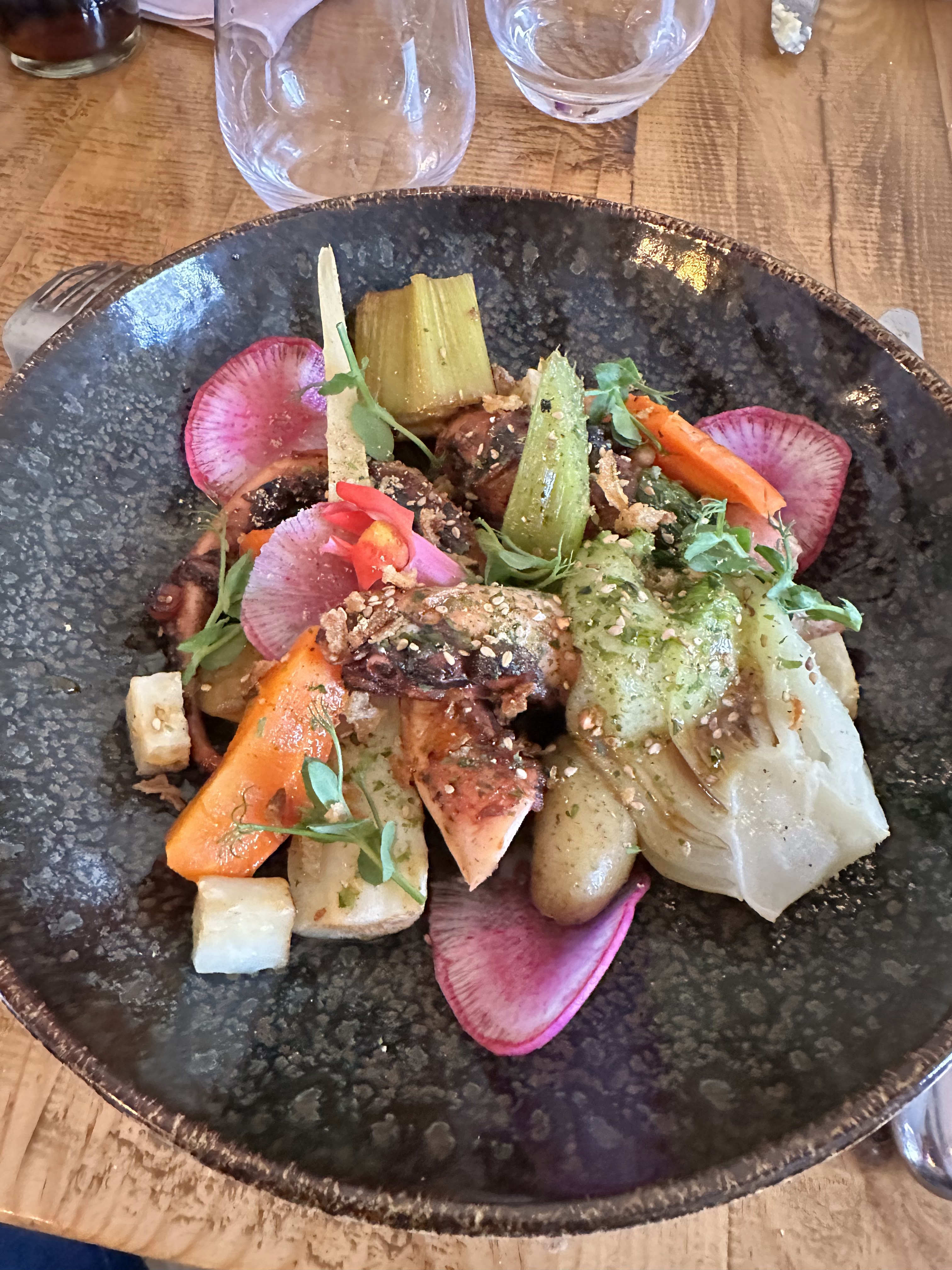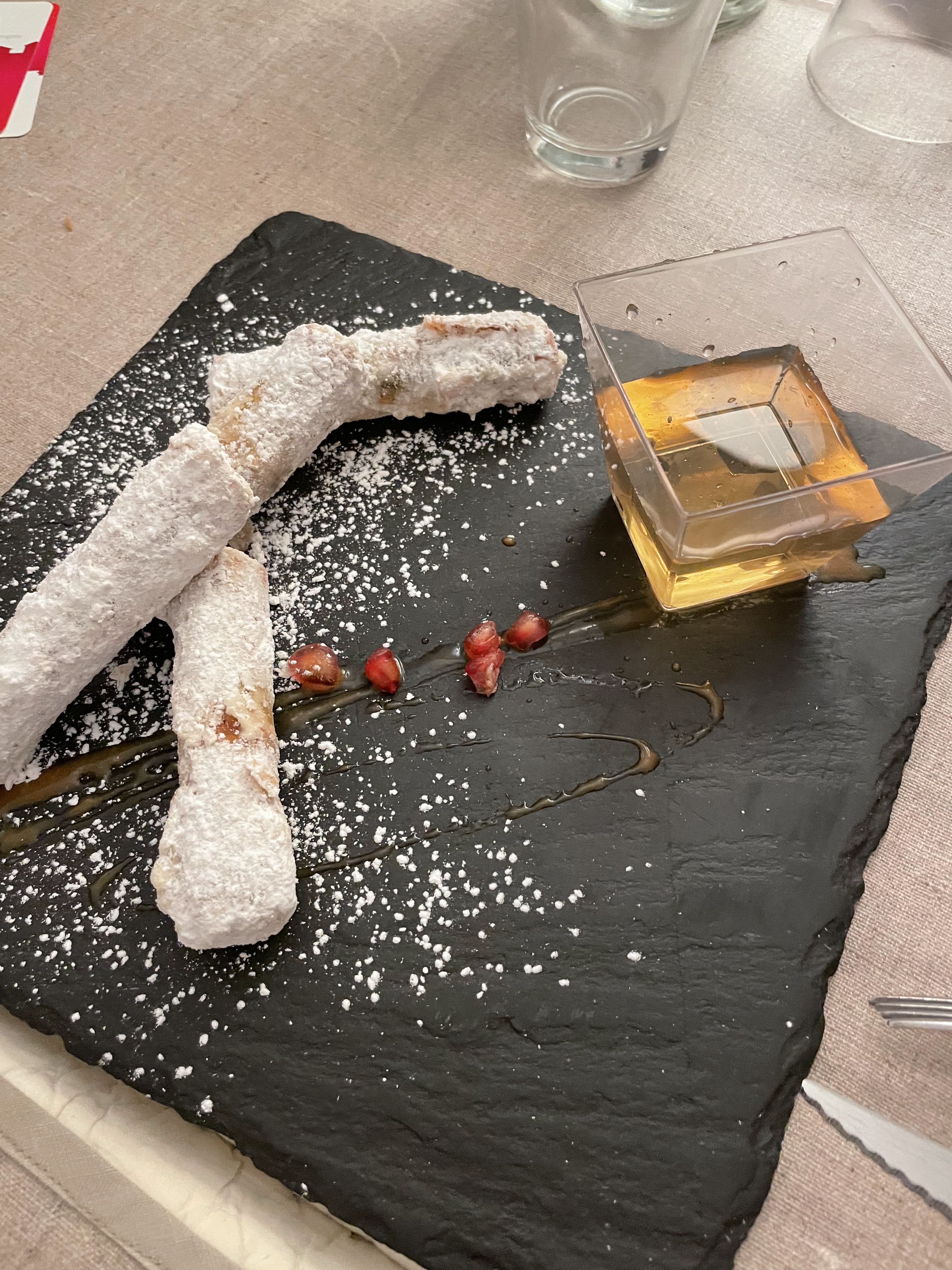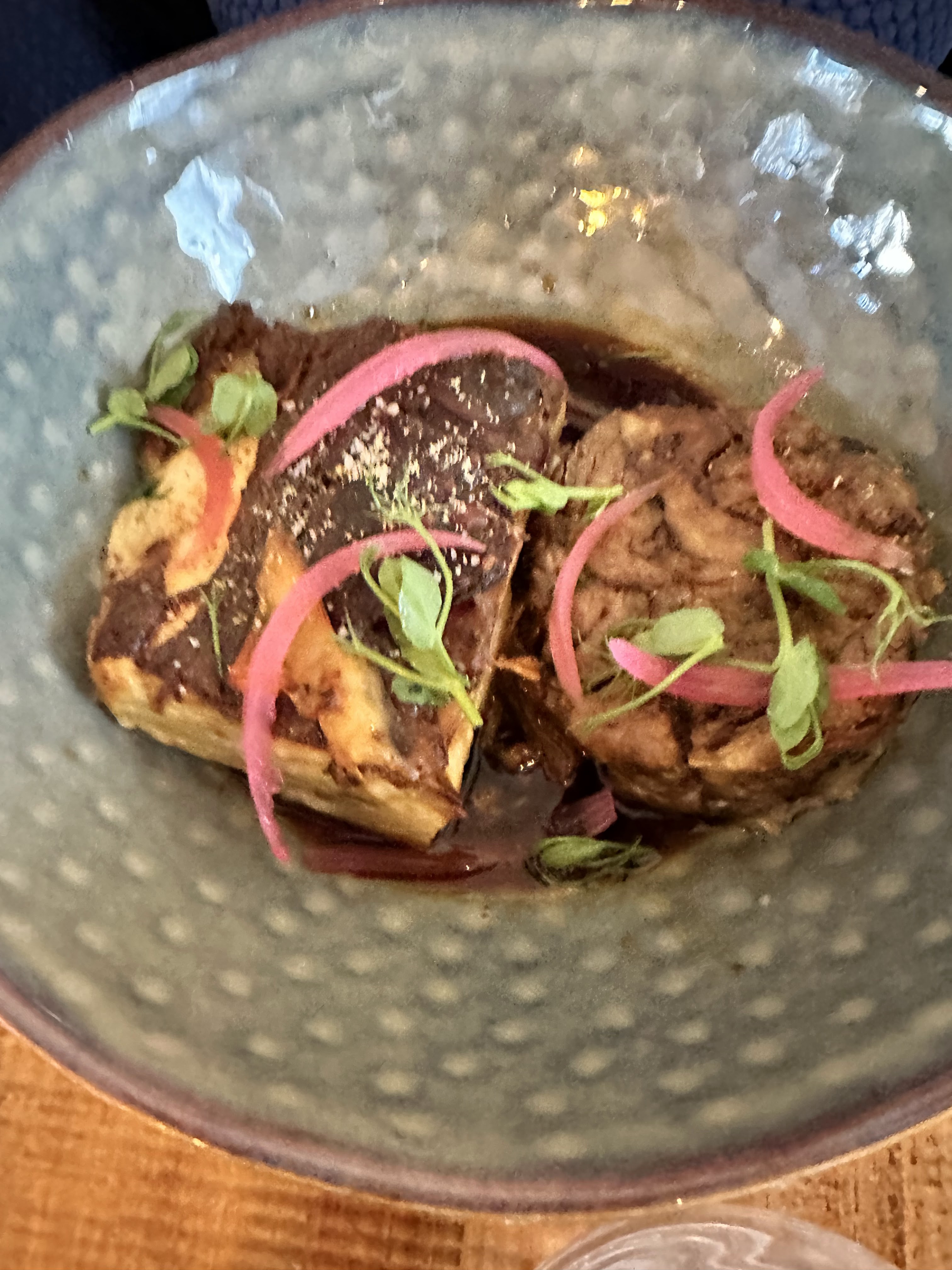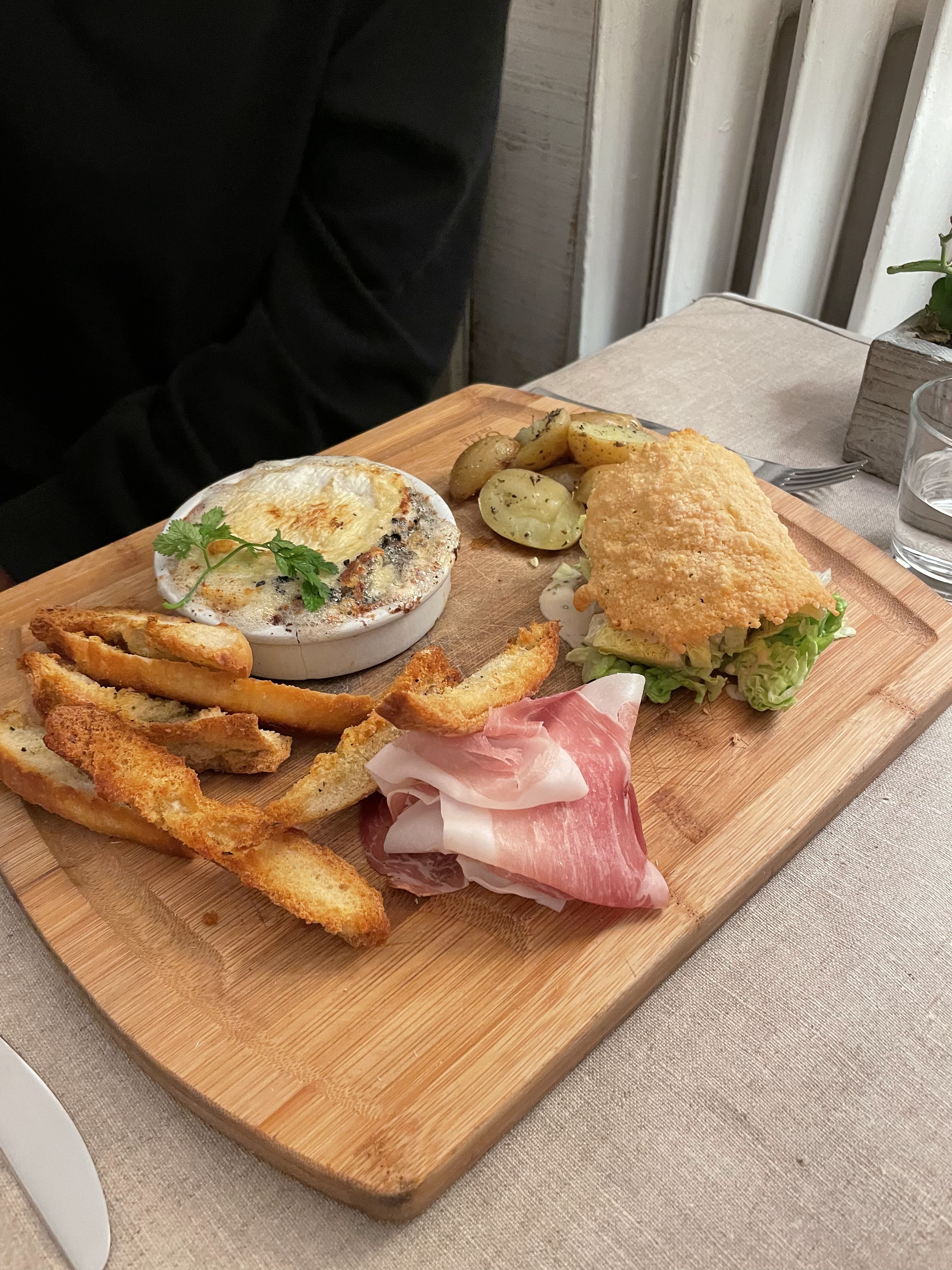 Absolument délicieux. On a pris une tartelette tomate burrata avec la burrata fouettée (je savais pas que c'était possible) : à se damner. Puis le risotto aux truffes, très bon également. Le service était un peu lent, mais l'atmosphère est tellement agréable avec la terrasse sous les arbres, les tourterelles qui roucoulent, la petite brise, que ça ne dérange pas de passer un peu plus longtemps que prévu à profiter.