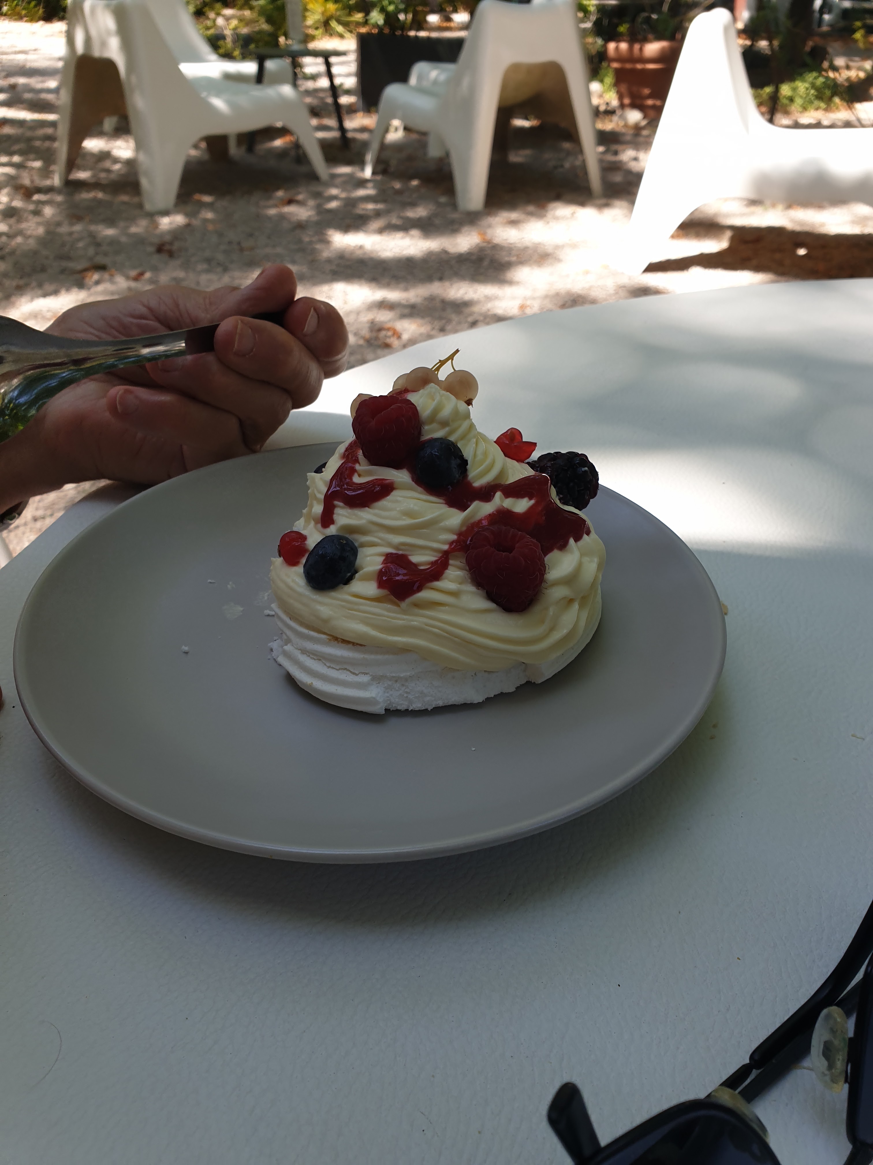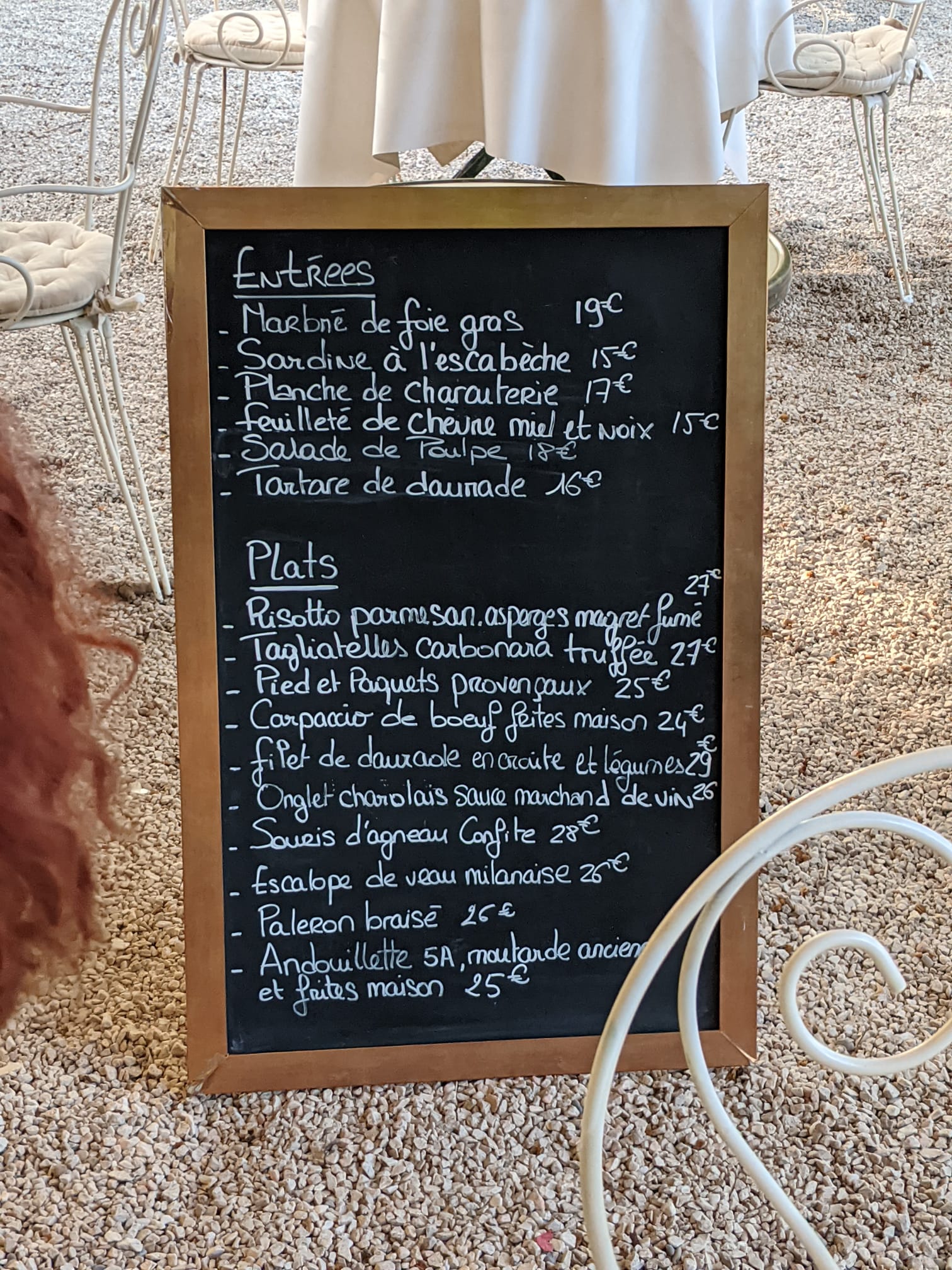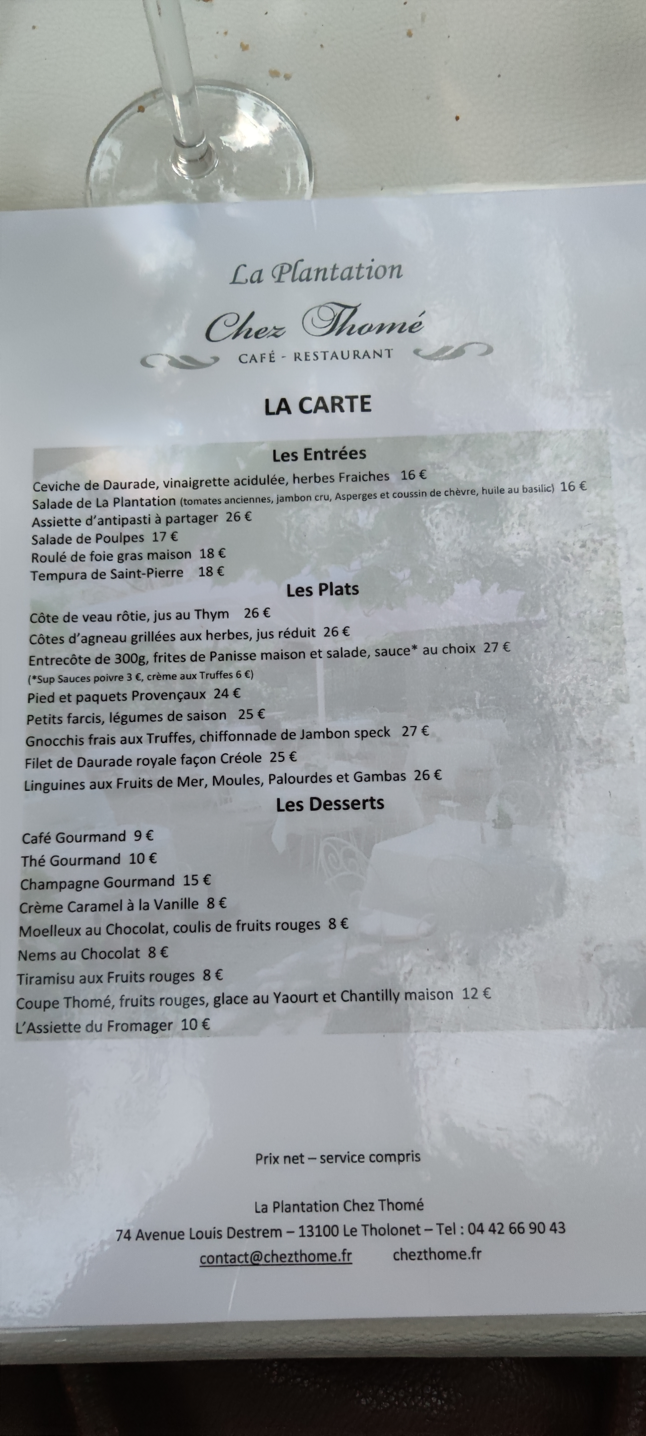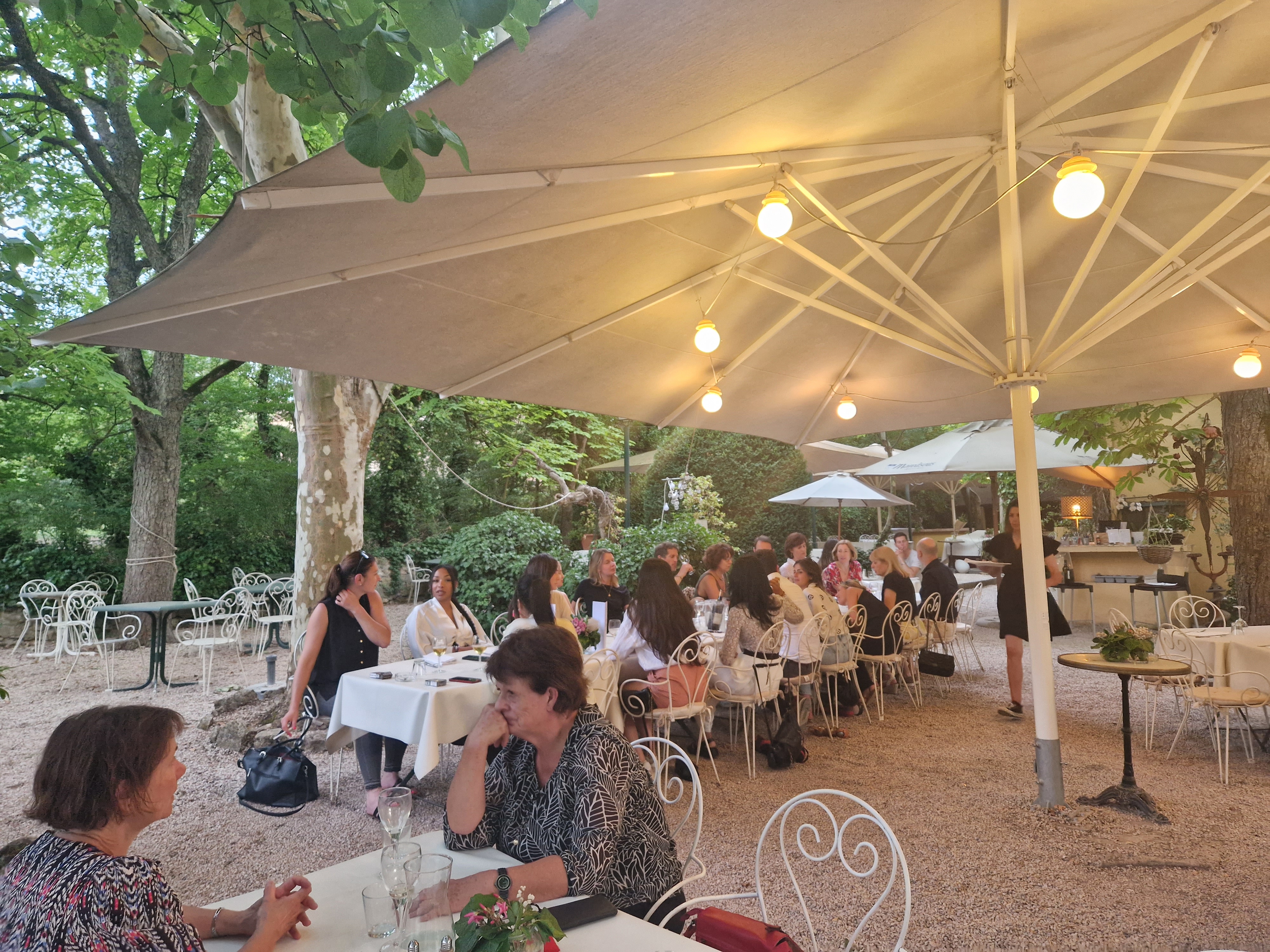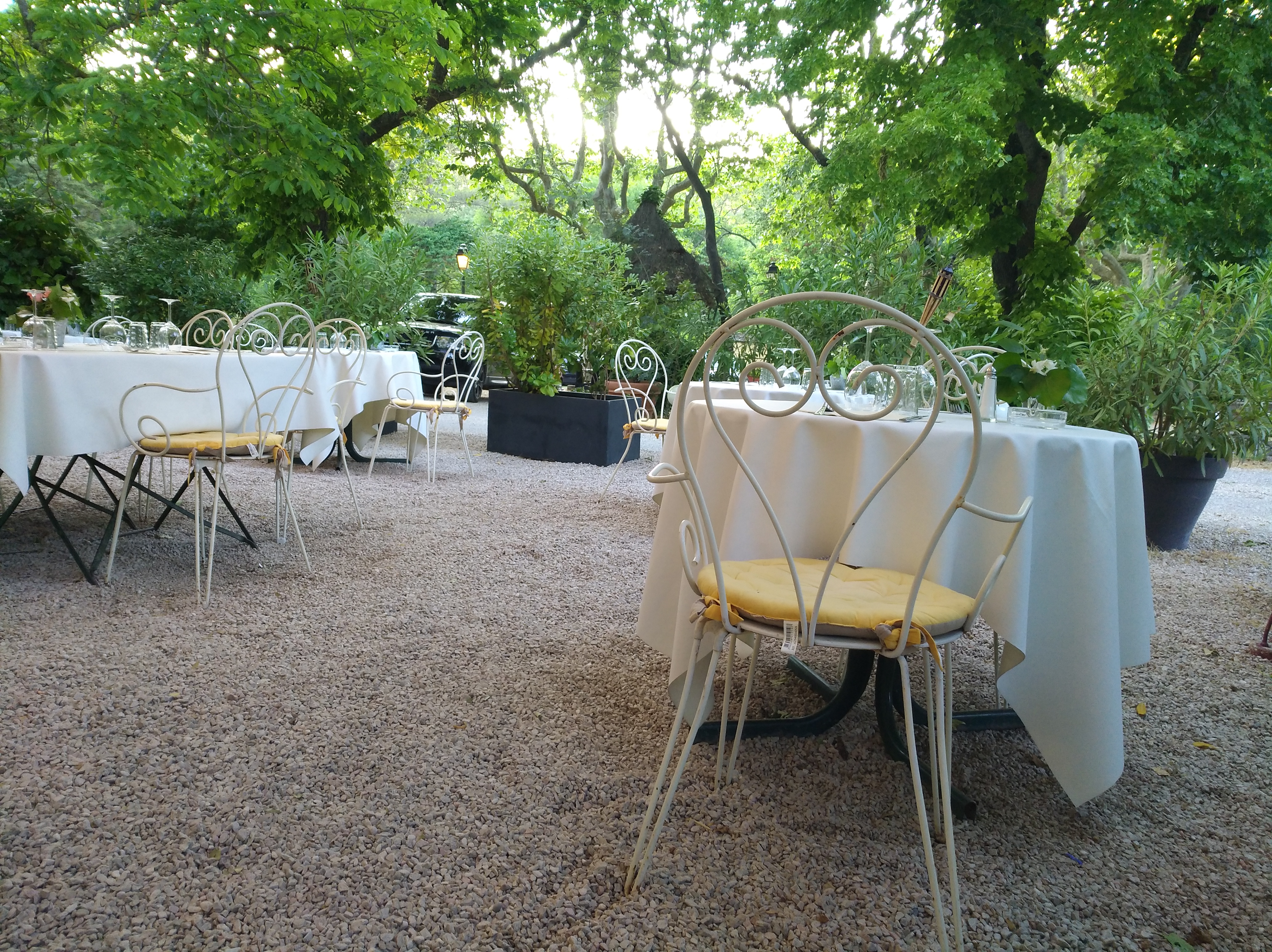 Cadre très calme et relaxant sous de grands arbres. Personnel affable et souriant. L'accueil et le service sont fait avec beaucoup de naturel et le plaisir visible de faire leur métier. Les plats sont beaux copieux et très bons. Le seul bémol (et c'est très personnel car tout le monde n'a pas de dos fragile ou autres misères) ce sont les chaises en fer forgé que j'ai trouvées très inconfortables. De bons fauteuils en rotin (blancs pour ne pas gâcher le cadre) avec repose bras comme dans les cafés parisiens ou sur le cours Mirabeau m'auraient fait apprécier le moment davantage.