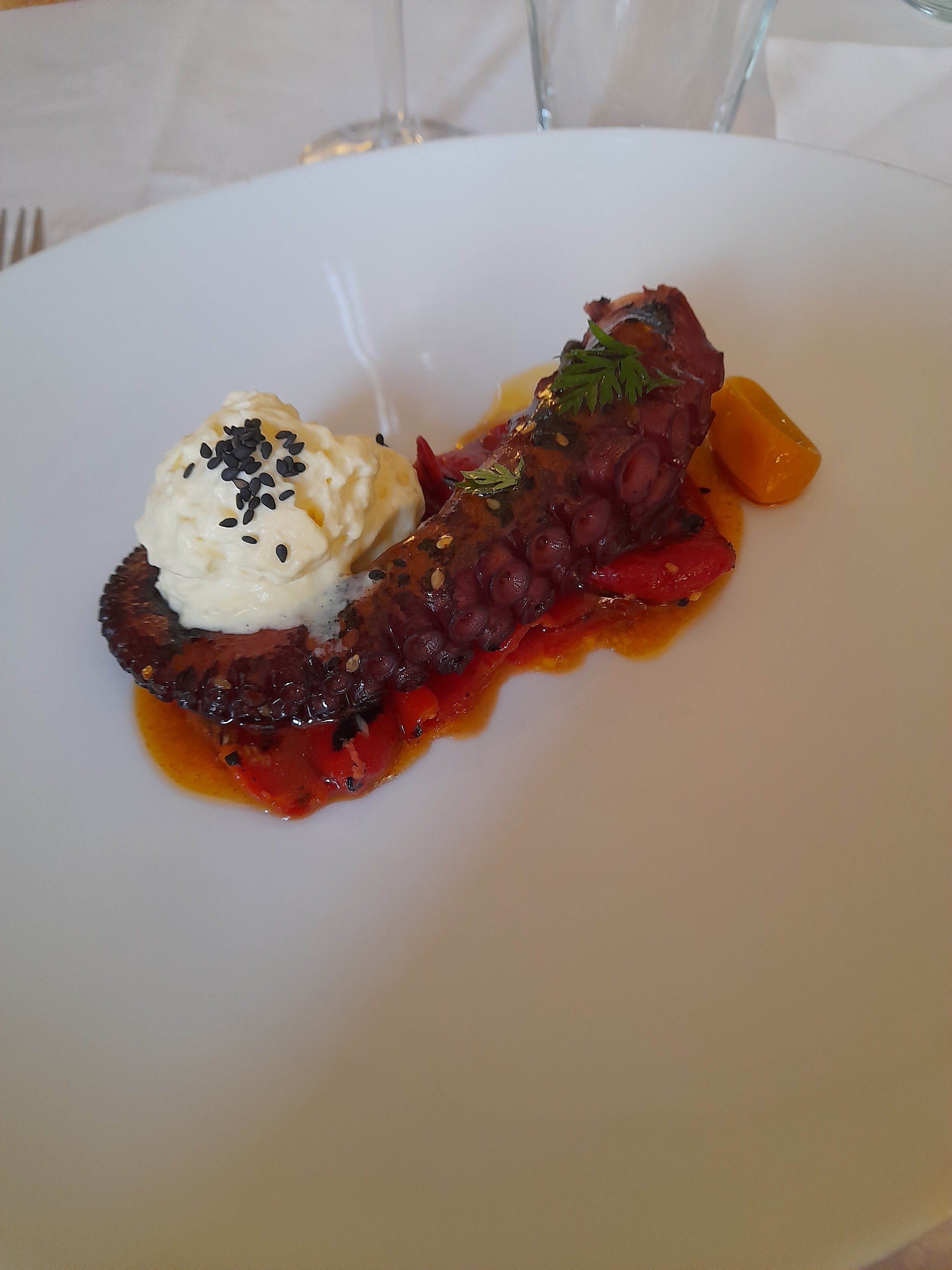 Nous sommes venus pour un déjeuner avec un menu à la carte, pour trois. Un bon choix de plats à la carte. Une entrée décevante à base de poulpe et chorizo, mal assortis où le chorizo emporte (devaste) tout, dans une assiette où la petite timbale s'est égarée sur le bord d'une assiette bien tristounette. la pulma iberique est parfait, goûteux, bien accompagné, cuisson comme il faut. Le dessert, pour ma part, un régal avec la glace frite, simple boule de vanille mais dans une enveloppe de pâte frites, au top. Pour les autres un pavlova aux fruits rouges, où la crème patissiere ne les a pas incité à finir. La carte des vins est assez garnie. le cadre est tres agréable et le service rapide et attentionné. un bemol supplémentaire pour le service du vin où il faudra apprendre à la serveuse qu'un nectar se manipule delicatement notamment on essaie de le deboucher. Bref, plutôt moyen malgré des efforts evidents pour etre plus qu'un resto de campagne dans un cadre bucolique.