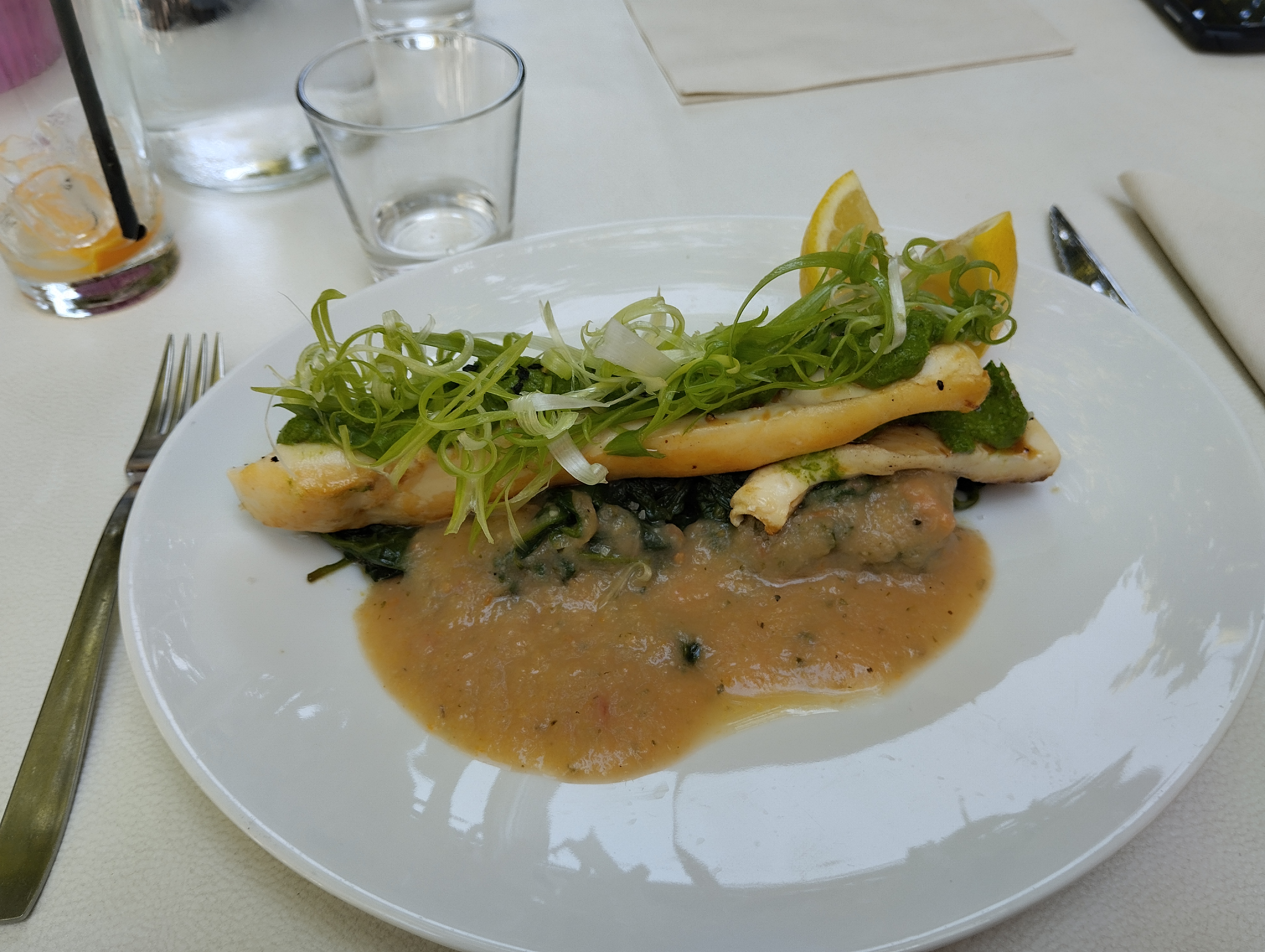 Jolie cadre, nourriture ok mais juste par rapport au prix élevé . Le personnel pas réactif et pas souriant, il faut sans arrêt leur demander des trucs et attendre 30 min pour de l'eau par exemple, en temps de chaleur c'est limite. Le serveur un peu barbue - c'est pas un métier pour lui. Nous sommes partis avec une sensation de soif c'est pas normal.