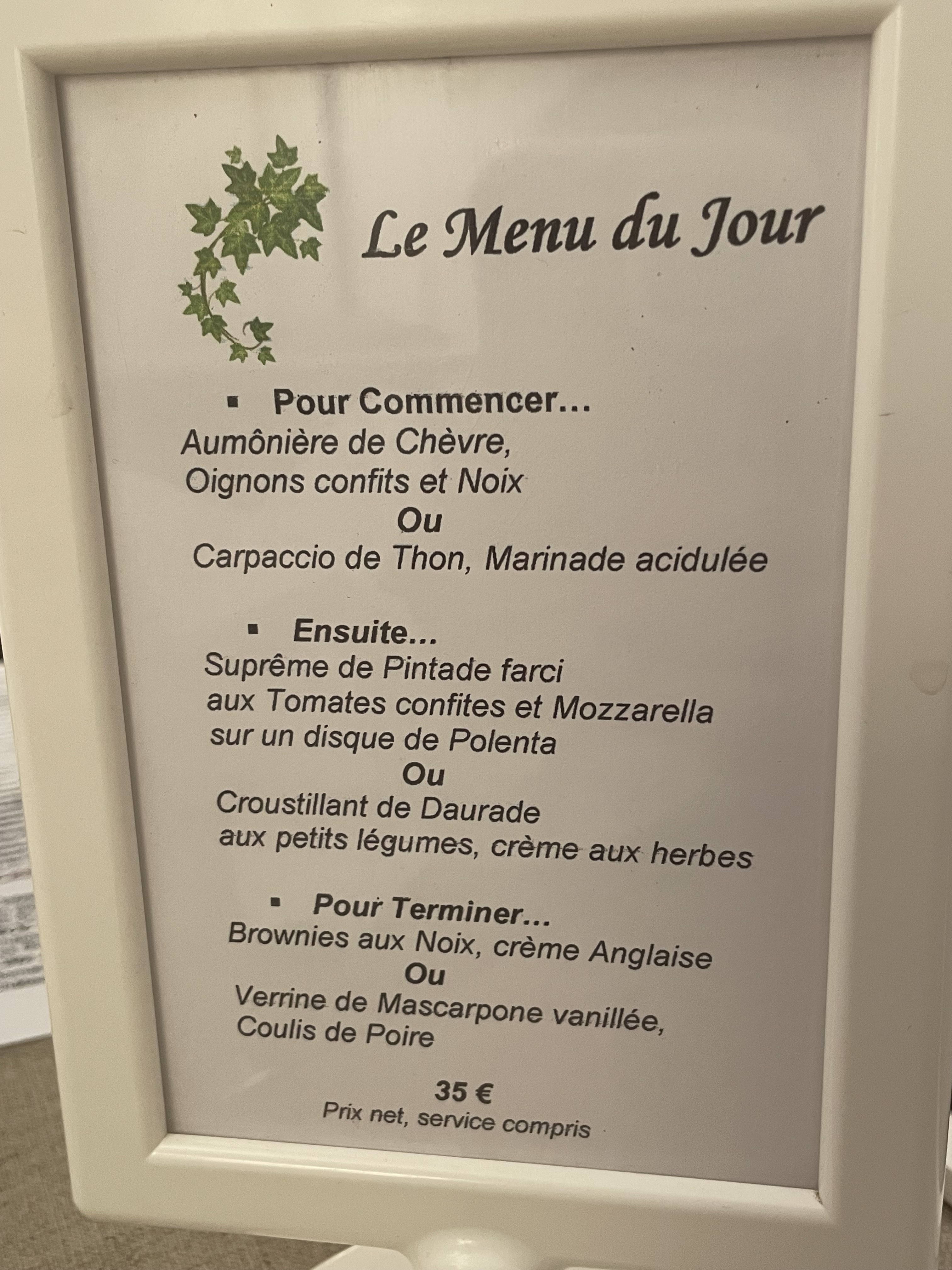 Cadre charmant, intime, chaleureux de tres bon gout, donne envie de revenir. Bonne cuisine. Accueil chaleureux. Un menu à 28 euros: 3 plats. Suggestion: un 2eme menu, un peu moins cher avec 2 plats serait appreciable.