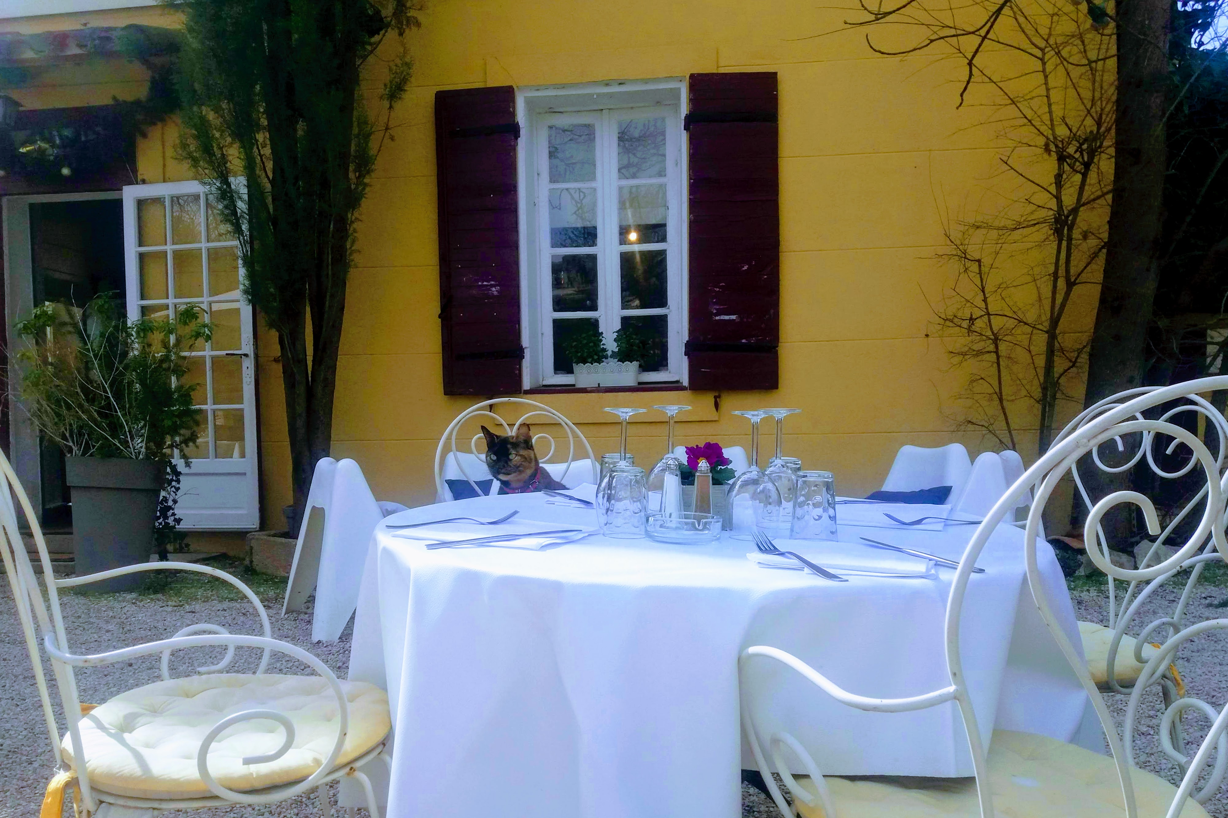 Cher Nova eos, J'ai déjeuné aujourd'hui à une table à côté de la votre... Effectivement le chat de la maison était couché à l'écart sur une chaise mais à aucun moment sur une table. De mon côté je fréquente cet établissement très régulièrement pour la qualité et la fraicheur de leurs plats, l'accueil chaleureux et leur professionnalisme et leur cadre enchanteur et j'y retournerai très vite. Caresse au chat