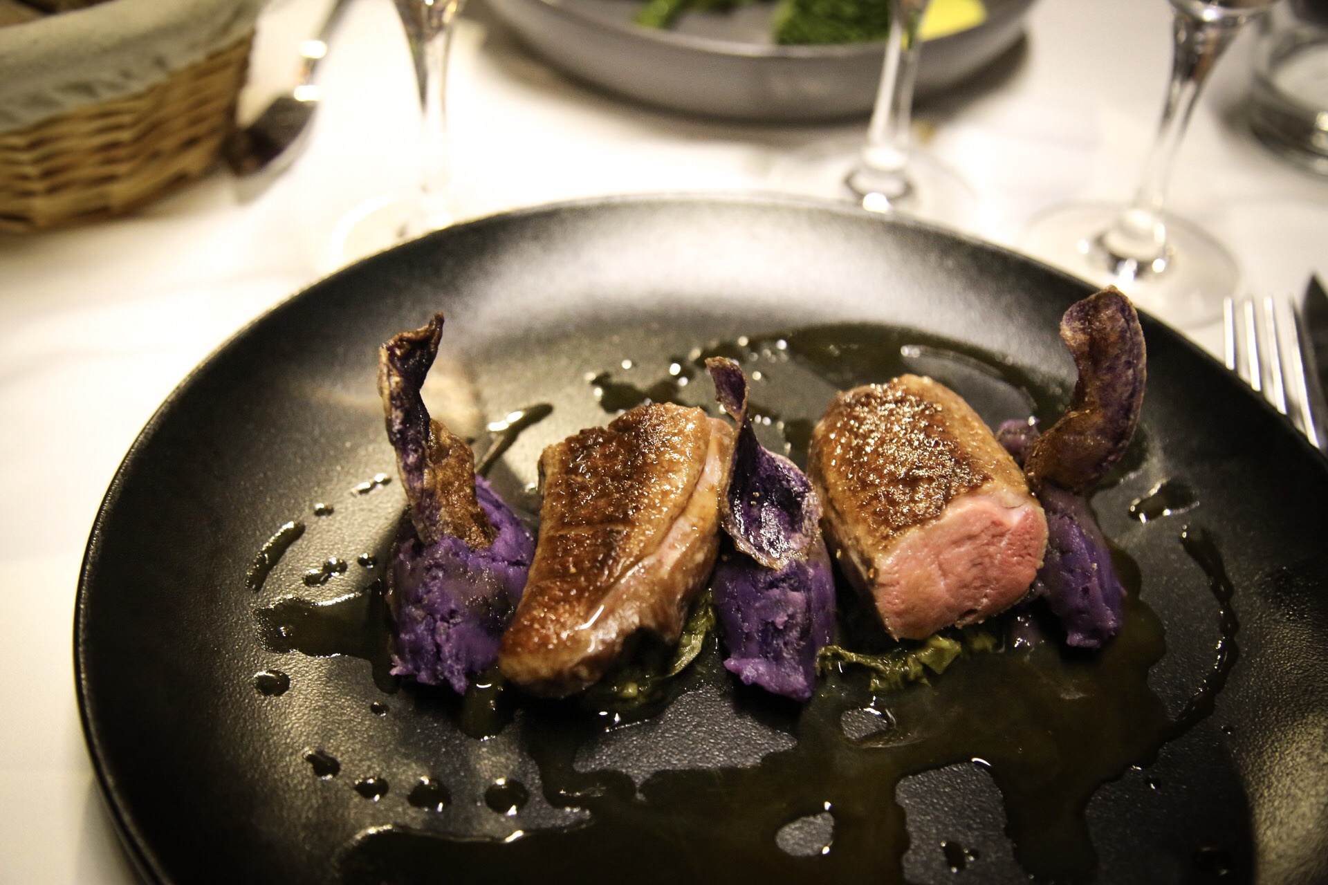 Nourriture très savoureuse. Et surtout le plat principal : le canard rôti. Préparé avec du lait de coco et servi avec des fraises et même du pop-corn (!). Vraiment spectaculairement bon. Mon fils a opté pour le menu enfant et s'attendait aux Mc Mcnuggets avec des frites. Au lieu de cela, il a eu un demi-poulet et des pommes de terre rissolées violettes. Après un certain scepticisme, il a commencé à manger et a été très surpris par le goût. Une telle expérience correspond selon moi typiquement à l’image que j’ai de ce restaurant.
