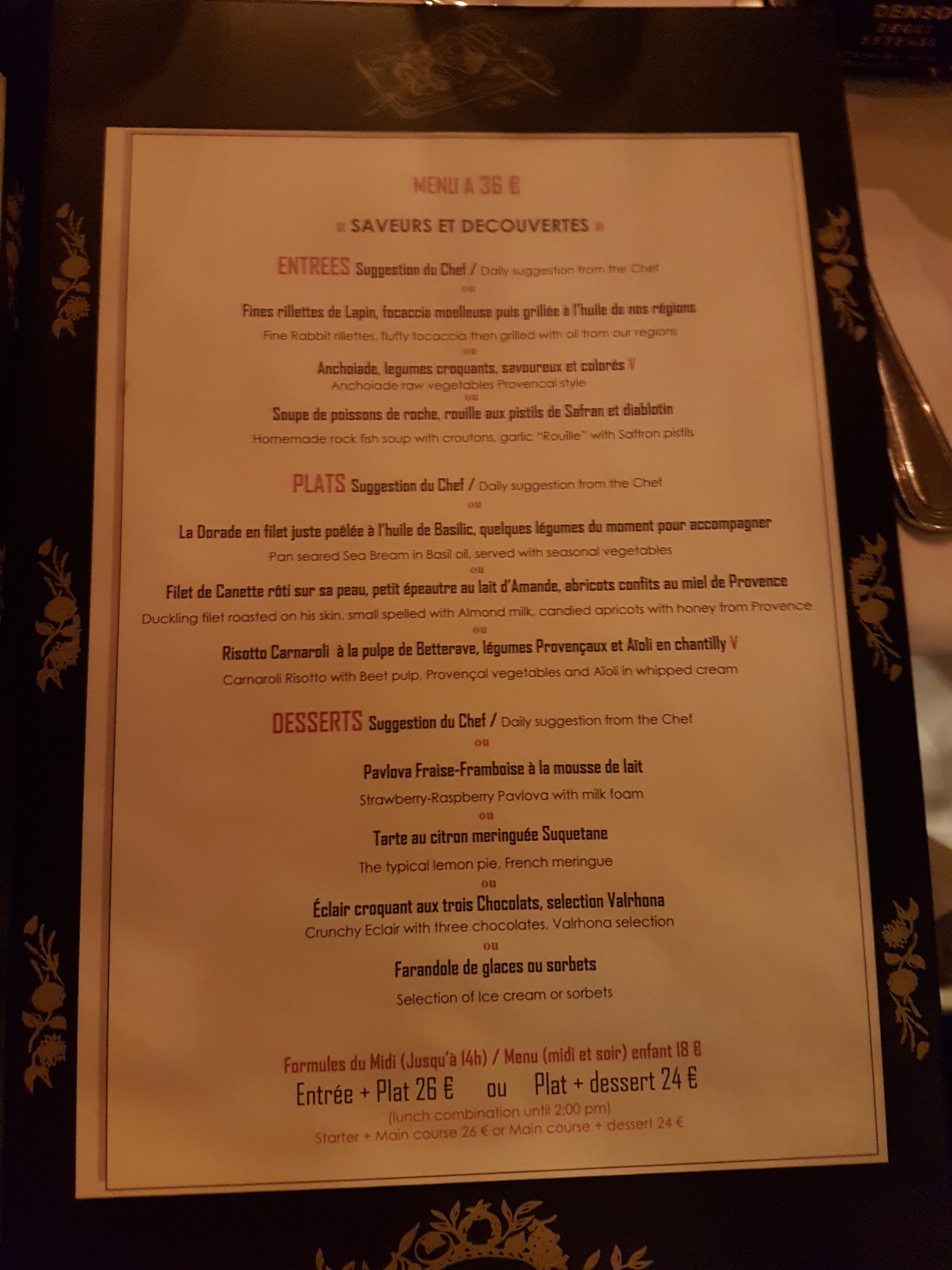 Un restaurant français 🇫🇷 incontournable à Cannes🍴😋😋😋 Formule déjeuner entrée + plat 32 € Plat + dessert 30 € Entrée + plat + dessert 43 € A essayer👍🏻