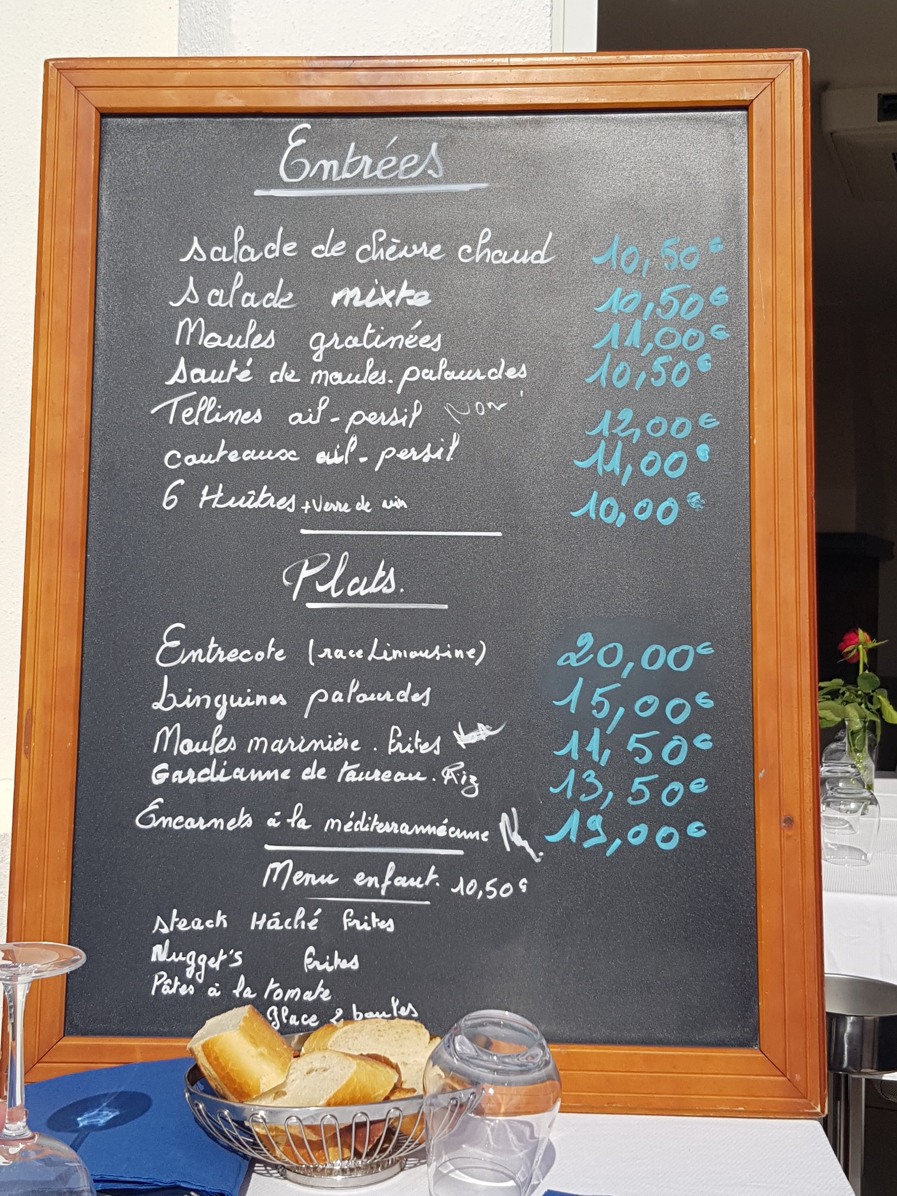 Nous avons commandé dans ce resto. le jeudi de l’Ascencion 1 assiette de couteaux et 2 moules/frites. L’assiette contenait 7 couteaux à peine cuits donc hyper caoutchouteux et avec de l’ail cru. Les moules avaient dû passer toute la nuit dans l’eau car elles étaient minuscules (alors que les coquilles étaient grosses) et sans aucun goût. Les frites étaient molles et très grasses. Je ni retournerai jamais.