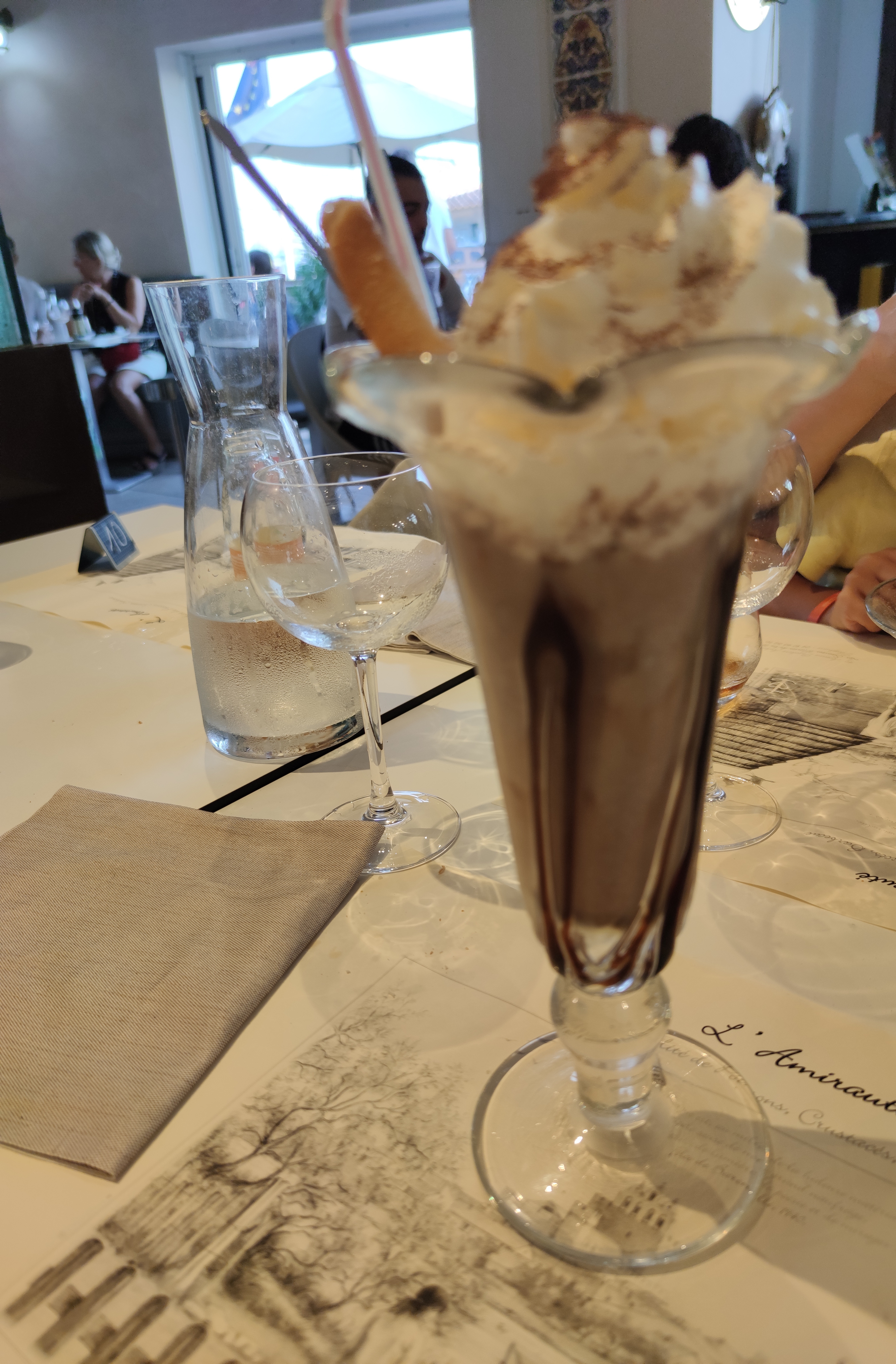 Pour résumer, la coupe de glace chocolat liégeois vendue par la serveuse comme contenant 3 boules avec sauce chocolat sur la chantilly s'avère finalement être une seule boule de glace dans un grand verre de lait chocolaté avec un peu de chantilly, sans sauce chocolat. La tranche d'Espadon devait être servie avec du riz et elle est arrivée avec un peu de pommes de terre et des haricots. Par contre, la sole à 38 euros était très bonne et bien cuite mais plus proche de 250 grammes plutôt que des 500 grammes annoncés. Enfin, le cadre est magnifique. Cependant, le rapport qualité prix n'y est pas...