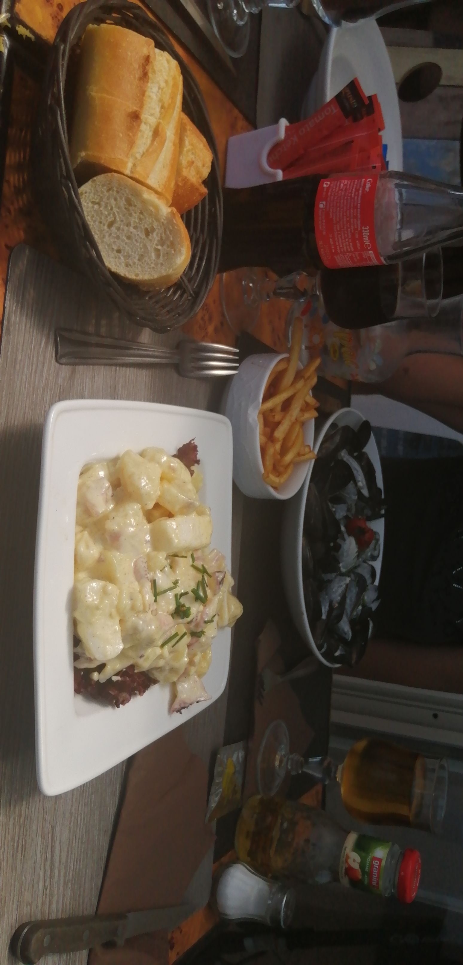 Les gérants sont sympathiques, service très long, mais je n’en tiens pas rigueur, par contre j’enlève 2 étoiles pour les moules, toutes fripées et recroquevillées jusqu’à devenir minuscules tout simplement parce qu’elles ont été cuites et recuites. J’ai mangé car il a fallu attendre 45 minutes pour les avoir, mais grosse déception, c’est la première fois que je mange des moules archi cuites.