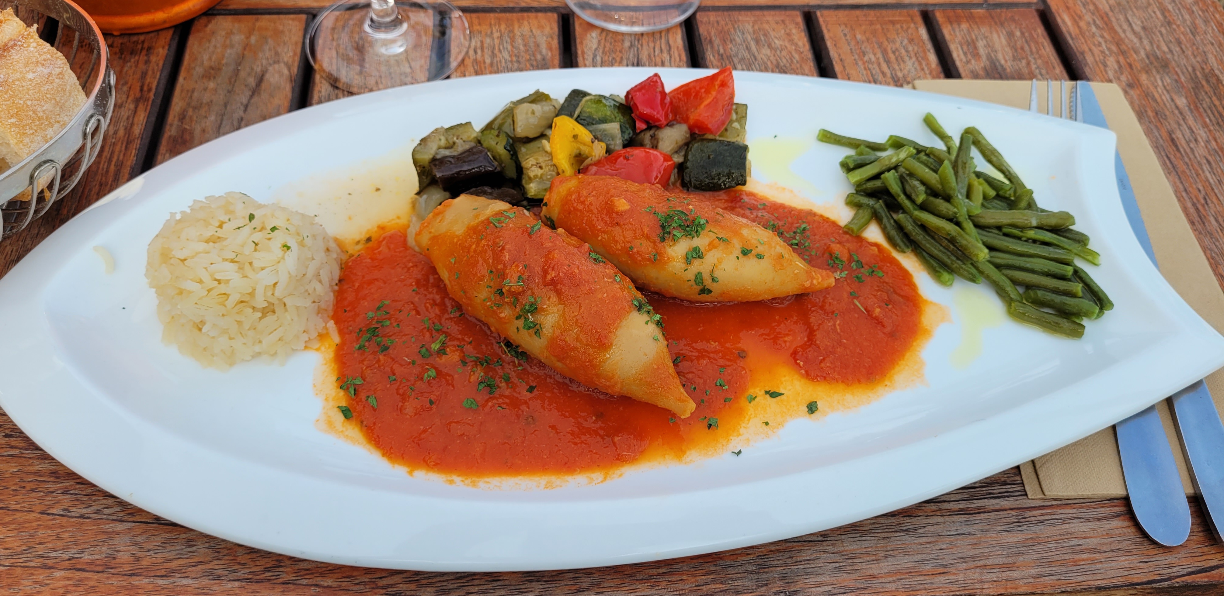 Nous sommes arrivés à 14h passé, mais la patronne a été sympa, et a accepté de nous servir, grâce à ma grossesse ! Nous nous sommes régalés. Couteaux persillés, salade de chèvres chauds, entrecôte et délicieux encornets .
