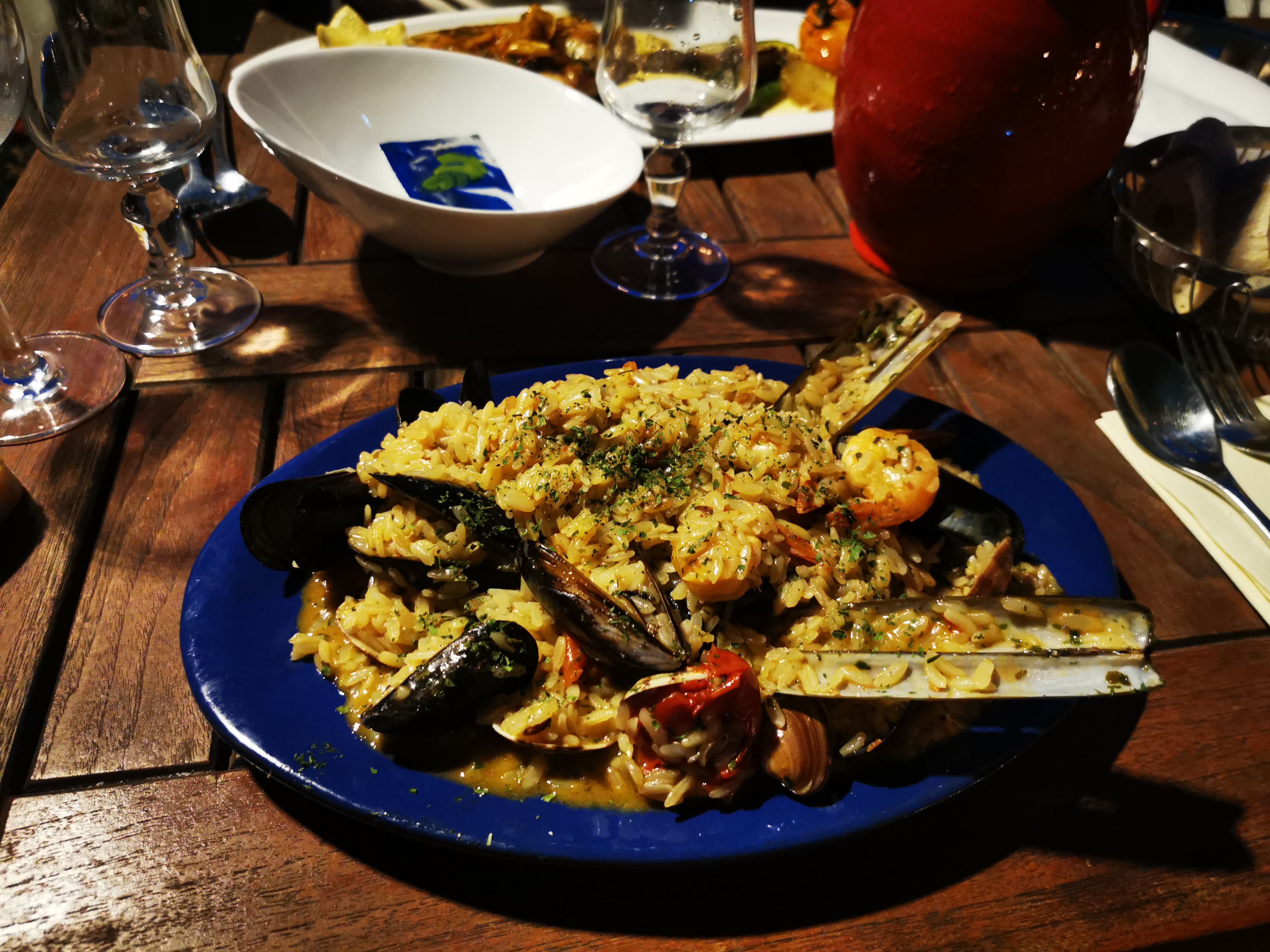 Ensemble moyen, le cadre est très beau, malheureusement le personnel n'est pas efficace malgrés leurs sympathie.. Nous avons attendu un moment avant d'avoir de l'eau à table qui devrait normalement être servit automatiquement dès l'arrivée, pour prendre la commande il a fallut un temps surtout que un des serveurs c'est tromper 2fois avant d'amener la bonne bouteille de vin.. Le temps d'attente pour les plats est assez longue, c'est bien quand ce n'est pas servi trop rapidement car on es la pour passé un bon moment sans ce presser mais il ne faut pas que se soit trop long non plus. Les plats sont moyens surtout pour le prix, mon risotto de fruit de mer était beaucoup trop salé(alors que j'aime le sel à la base j'en met dans tout mes plats) je l'es dis au serveurs et au cuisto, aucun geste n'a été fait.. Les fruits de mer qu'il y avait dedans était bon mais pour les couteaux j'ai eu seulement droit aux coquilles.. Beaucoup trop de riz pour le peu de fruit de mer, copieux pour rien..et pas vraiment de saveurs.. Dommage surtout pour le cadre.
