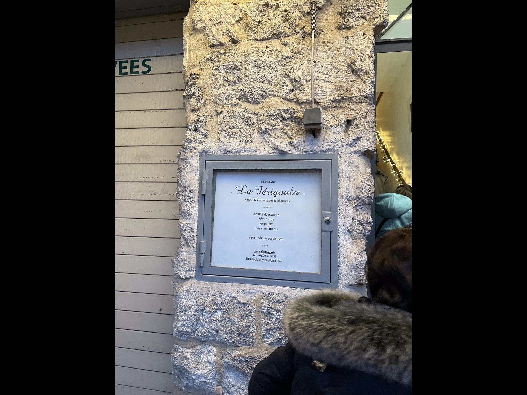 Resto provençal. Cependant, par manque d'études, je ne comprends pas vraiment ce qu'est la cuisine provençale. Le goût est moyen. Le commerçant chante avec insistance une comptine aux Japonais, Sur le pont d'Avignon, et essaie de les faire chanter.
