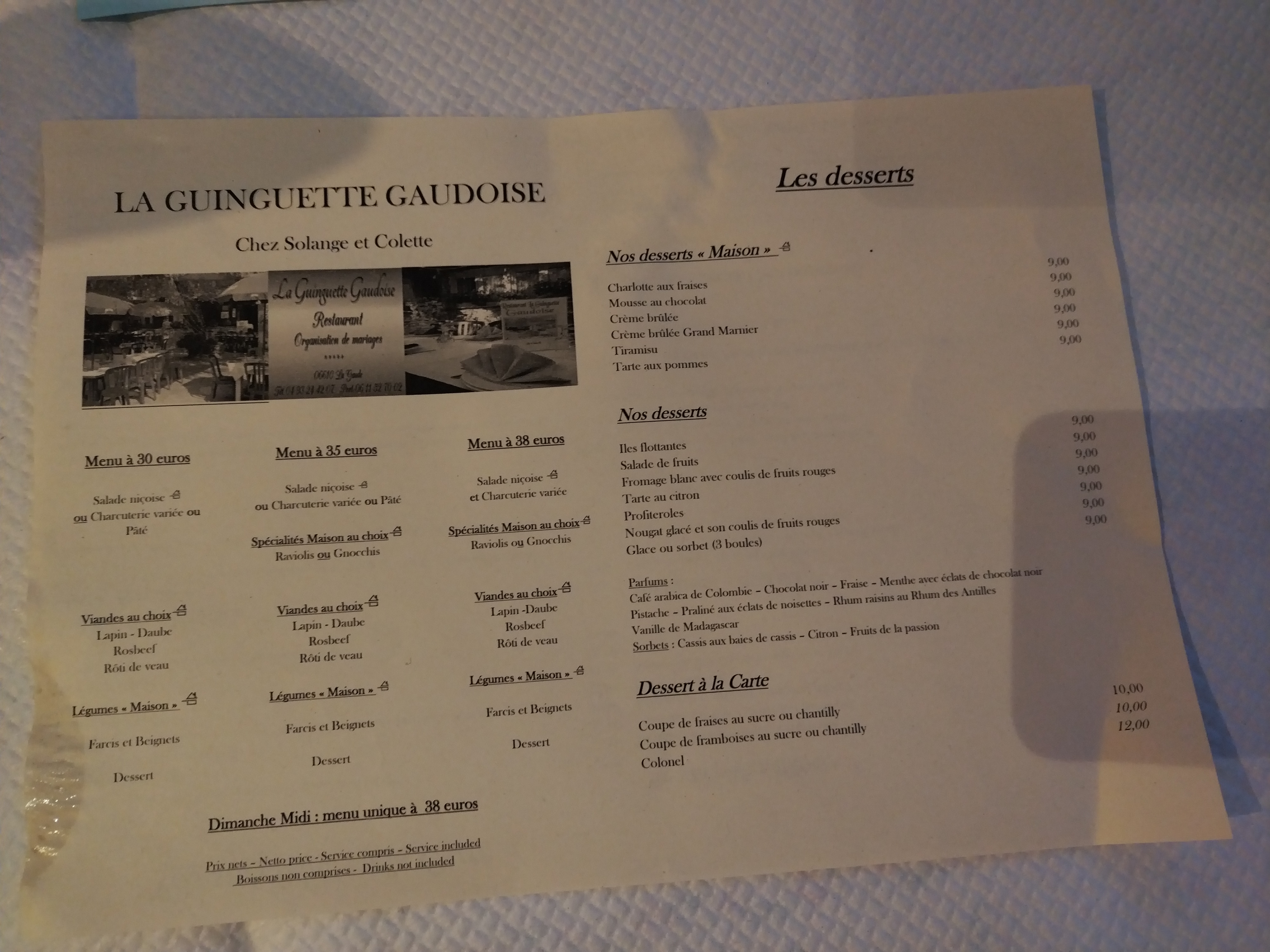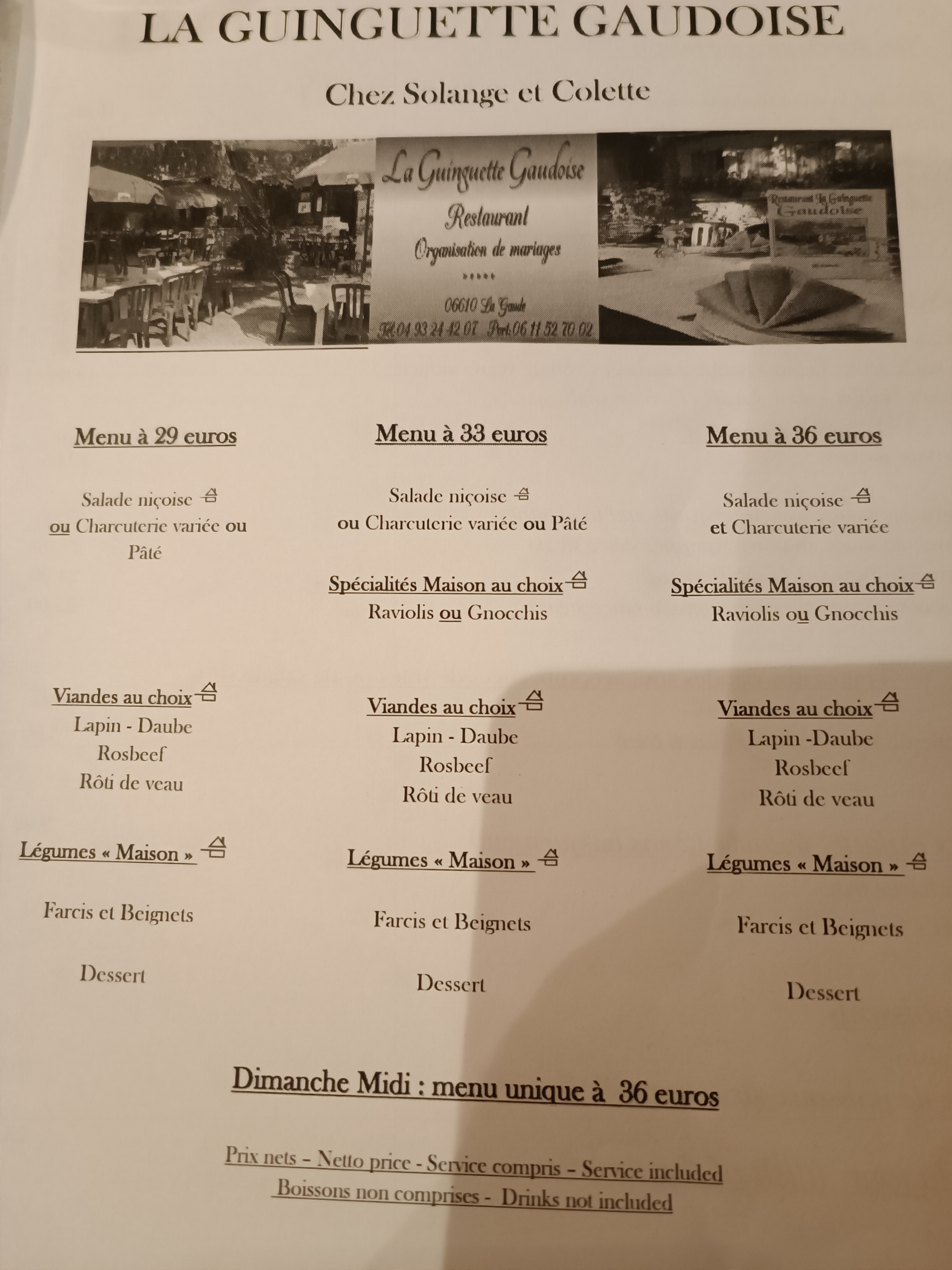 Très bon repas mais nous n en doutions pas car on connait- tout ce que je souhaite c est qu ils refassent le réveillon du jour de l an car c était trop bien contrairement aux autres restos qui font payer cher un repas médiocre la guinguette offre un festival de saveurs, un repas très copieux et on s amusé jusqu au bout de la nuit, alors oui c est un peu cher pour certains mais vu ce qui est proposé on en a pour son argent. De plus, un grand parking à été aménagé c est le top ! Merci à la gentille serveuse hier(qui avait sa fille qu elle nous a présenté )qui a assuré avec une grande gentillesse et efficacité ce repas de fête des mères (robe marron clair). BRAVO à tous cuisiniers, serveurs, vous êtes à la hauteur de votre réputation