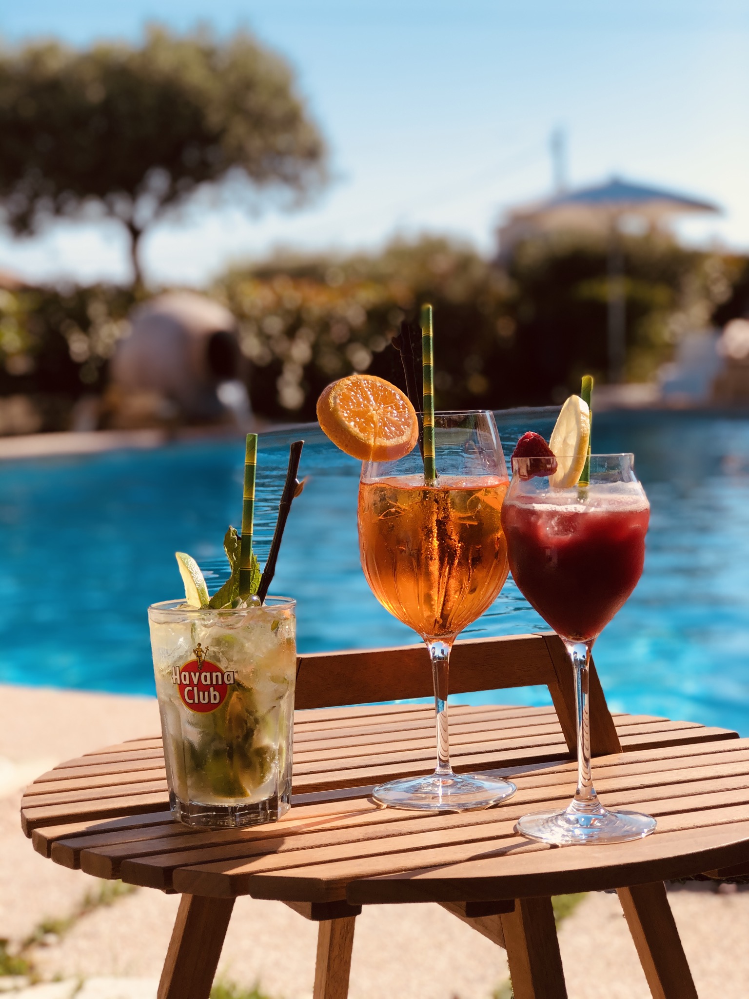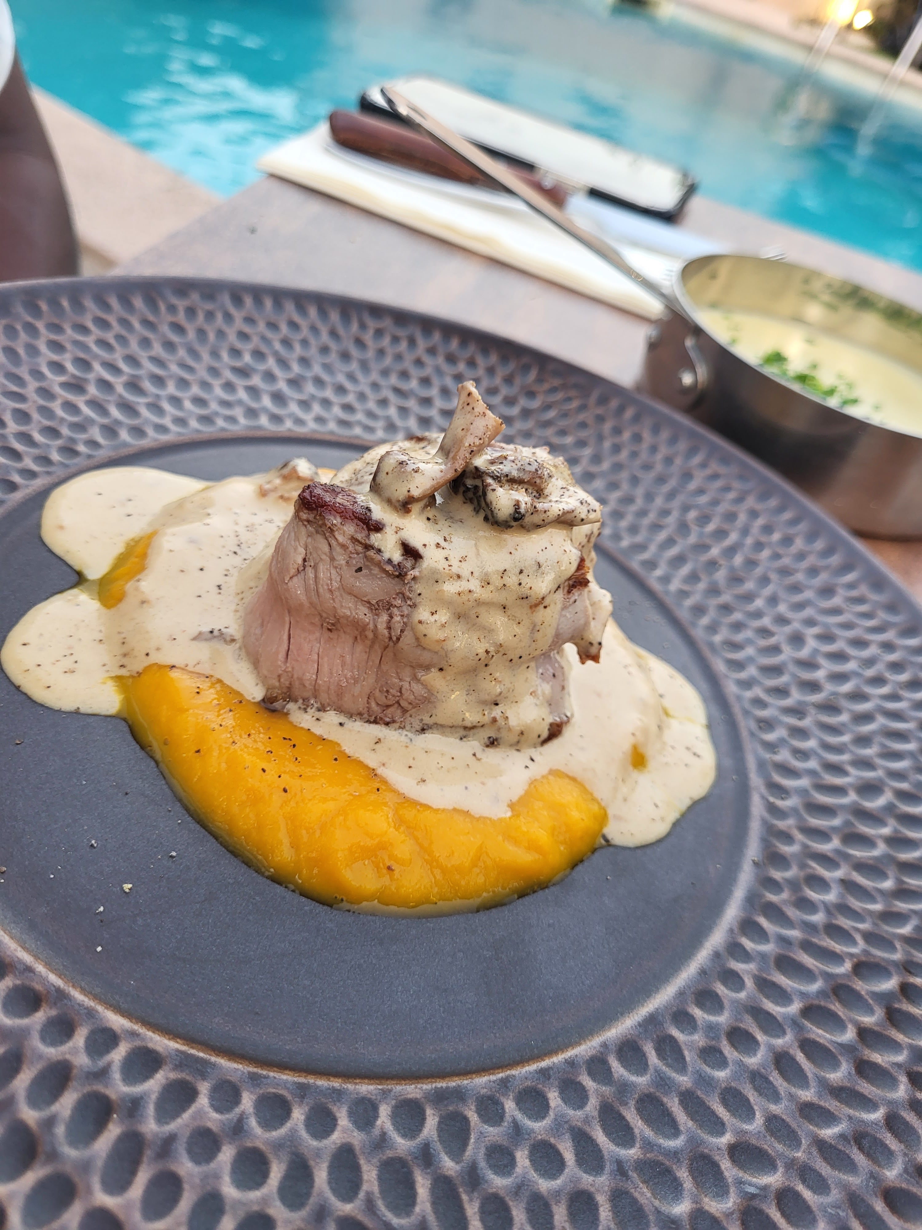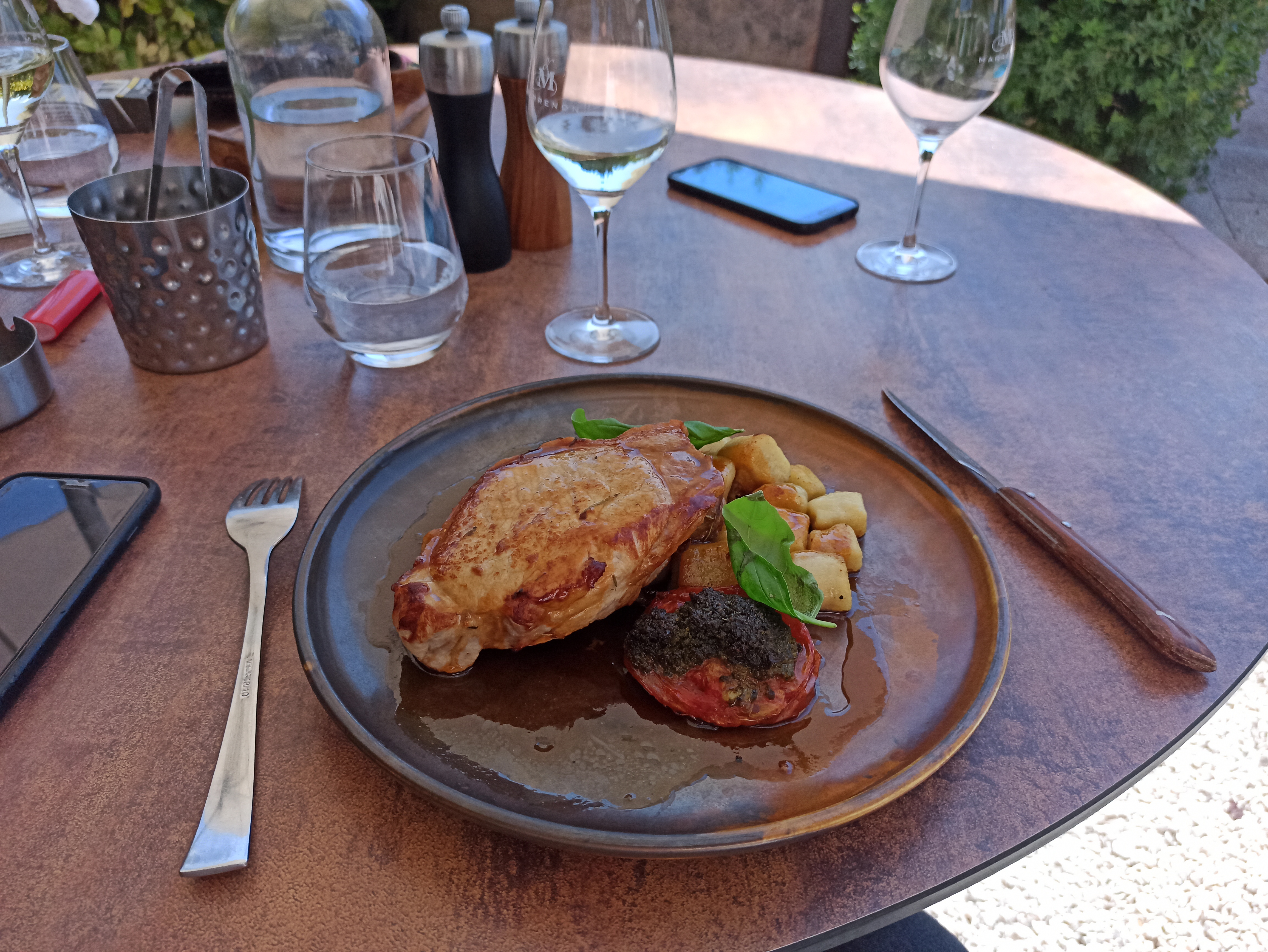 Repas du midi sur la terrasse au bord de la piscine, ambiance détendue et agréable. Le repas commence par un excellent cocktail réalisé avec des produits sélectionnés : vodka française et framboises du jardin. Le menu est à 39€: entrée, plat et dessert. La cuisine est maison, les cuissons parfaites, les assiettes copieuses. Le service se déroule sans fausse note, le personnel est très attentif.