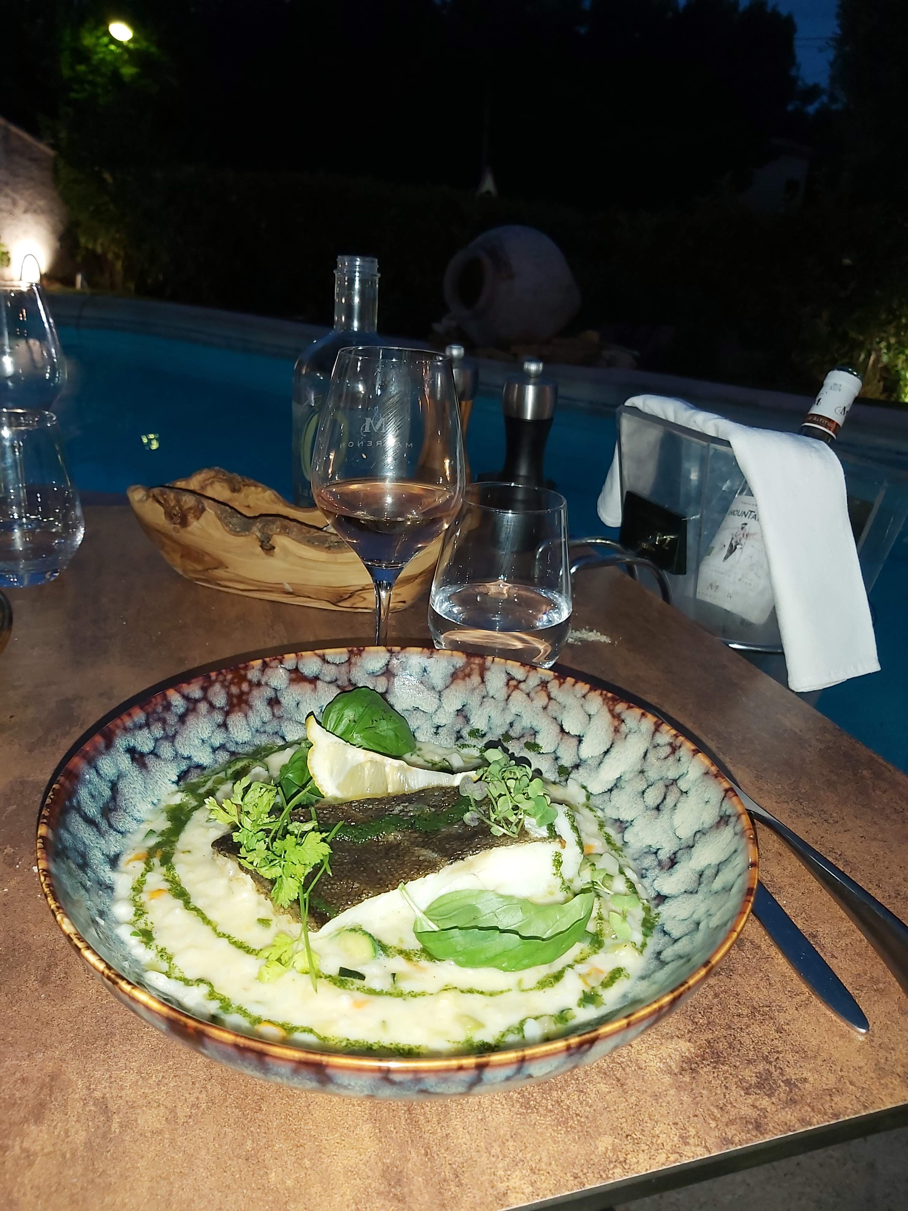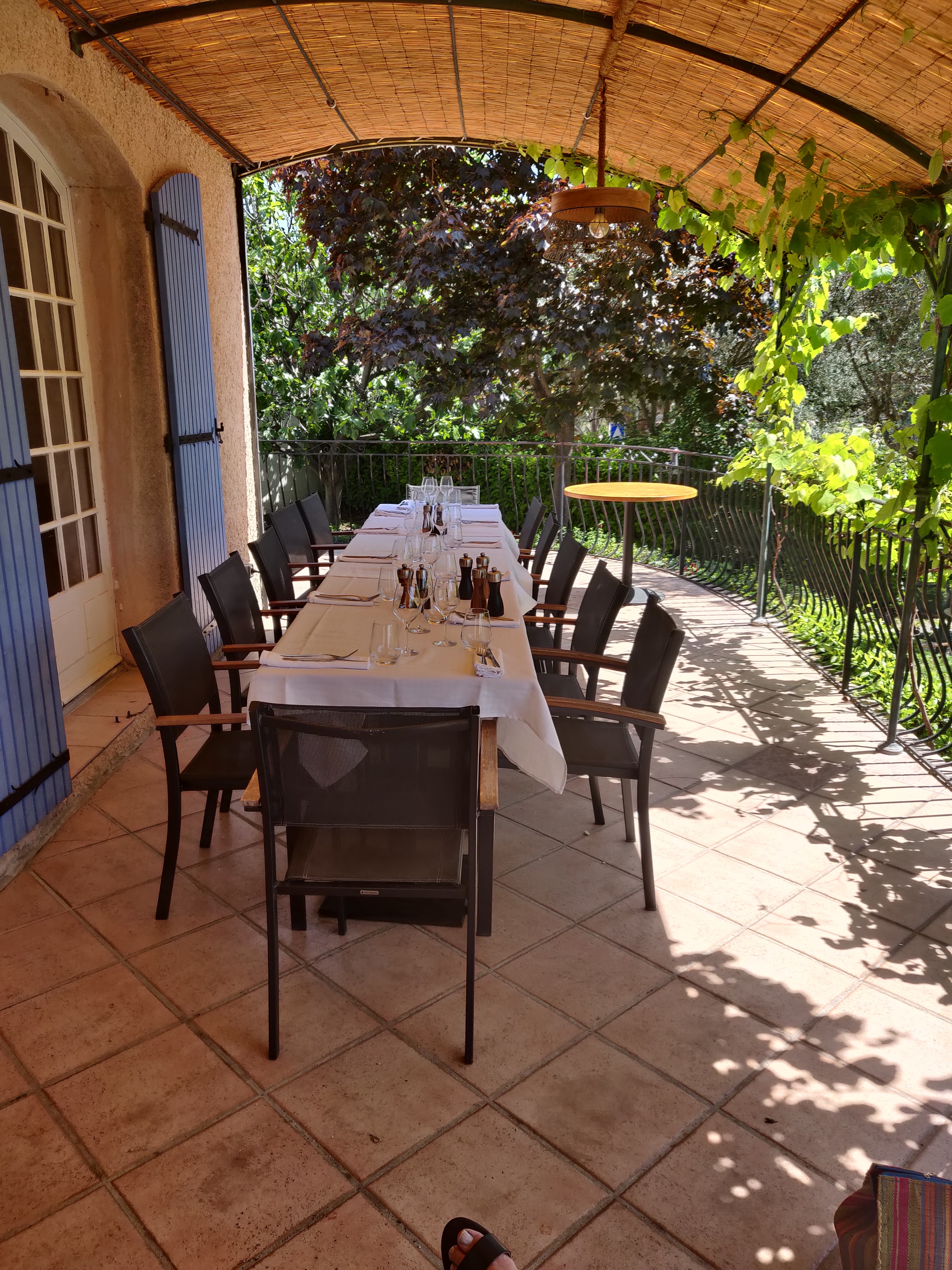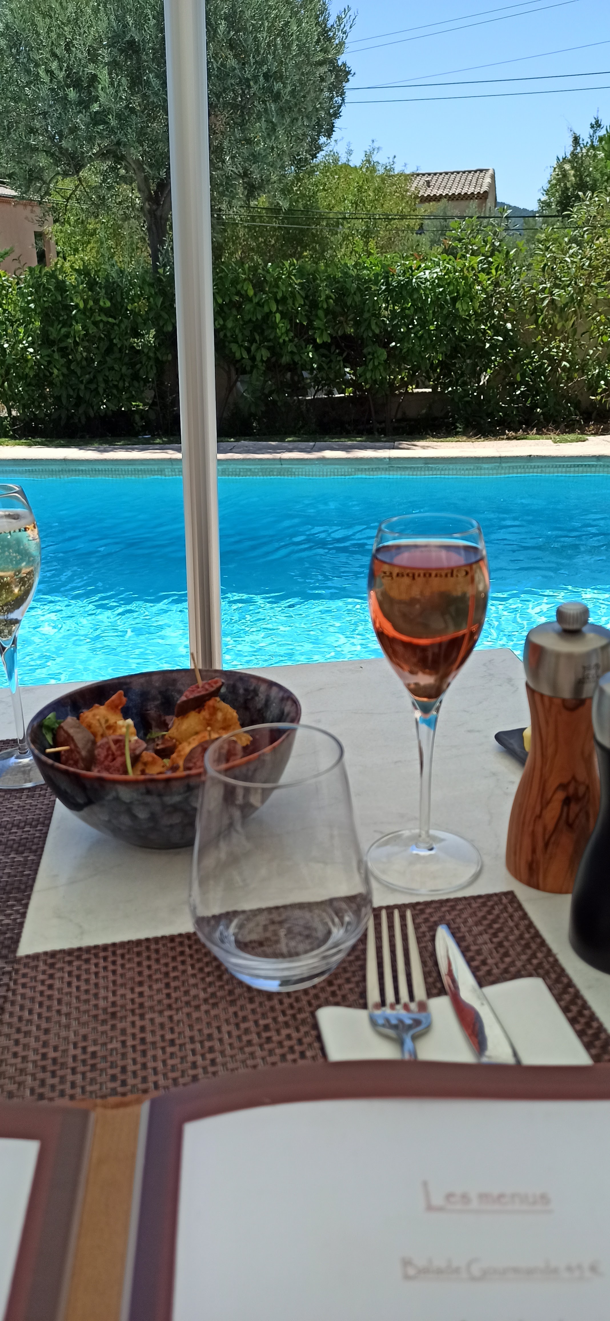 Après midi passée au bord de la piscine avant de passer au restaurant. Cadre incroyable, paisible au son des cigales. Plats très bons, personnel aux petits soins, avec beaucoup de petites attentions pour se faire pardonner de ne pas nous avoir placées au soleil (très peu de temps au final), vraiment on a adoré et on reviendra !