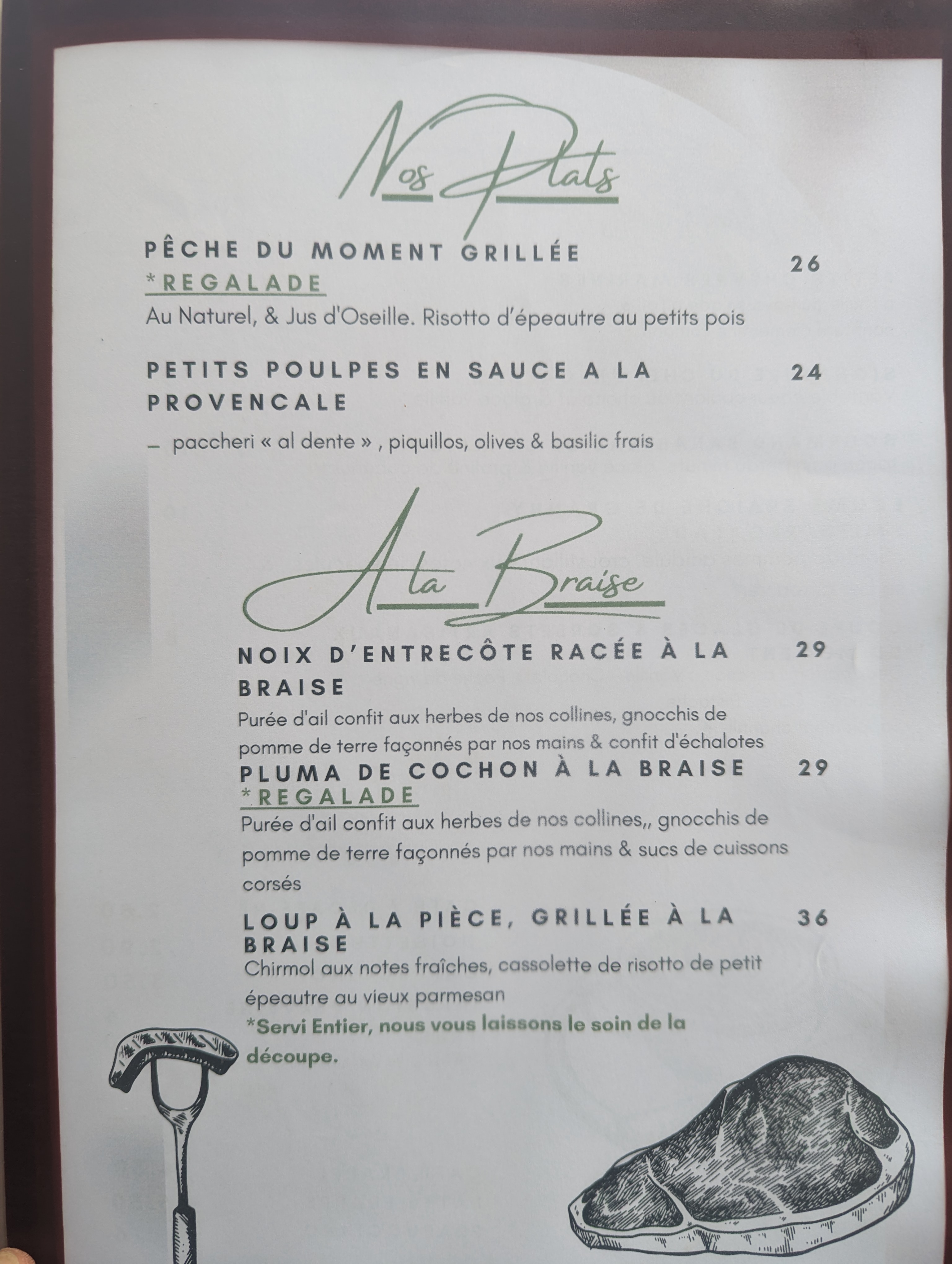 Repas de la saint Sylvestre Étant déjà clients ( plusieurs repas estival en terrasse) nous avons été surpris par le rapport tarif / quantité et qualité dans l’assiette Pour un prix de 90€/ pers hors boissons Nous avions des portions très insuffisantes Par exemple un tout petit bout de foie gras poêlé de moins 4cm (avec encore le nerf) qui était caché par une énorme tuile dans une grande assiette Idem pour l’ensemble des plats Pour résumer : belle présentation, plats minuscules, service agréable mais pompeux et expéditif( malgré des efforts pour ralentir le rythme nous avions bouclé le repas à 23h) et tarifs surdimensionnés. Pas d’ambiance si ce n’est des chants corses pour un réveillon! 1/2 Flûte de Champagnes offert ( à 12€ à la carte) Pourtant le menu de réveillon donnait envie, le goût y était mais pas la quantité par rapport au prix , Dommage très déçus.
