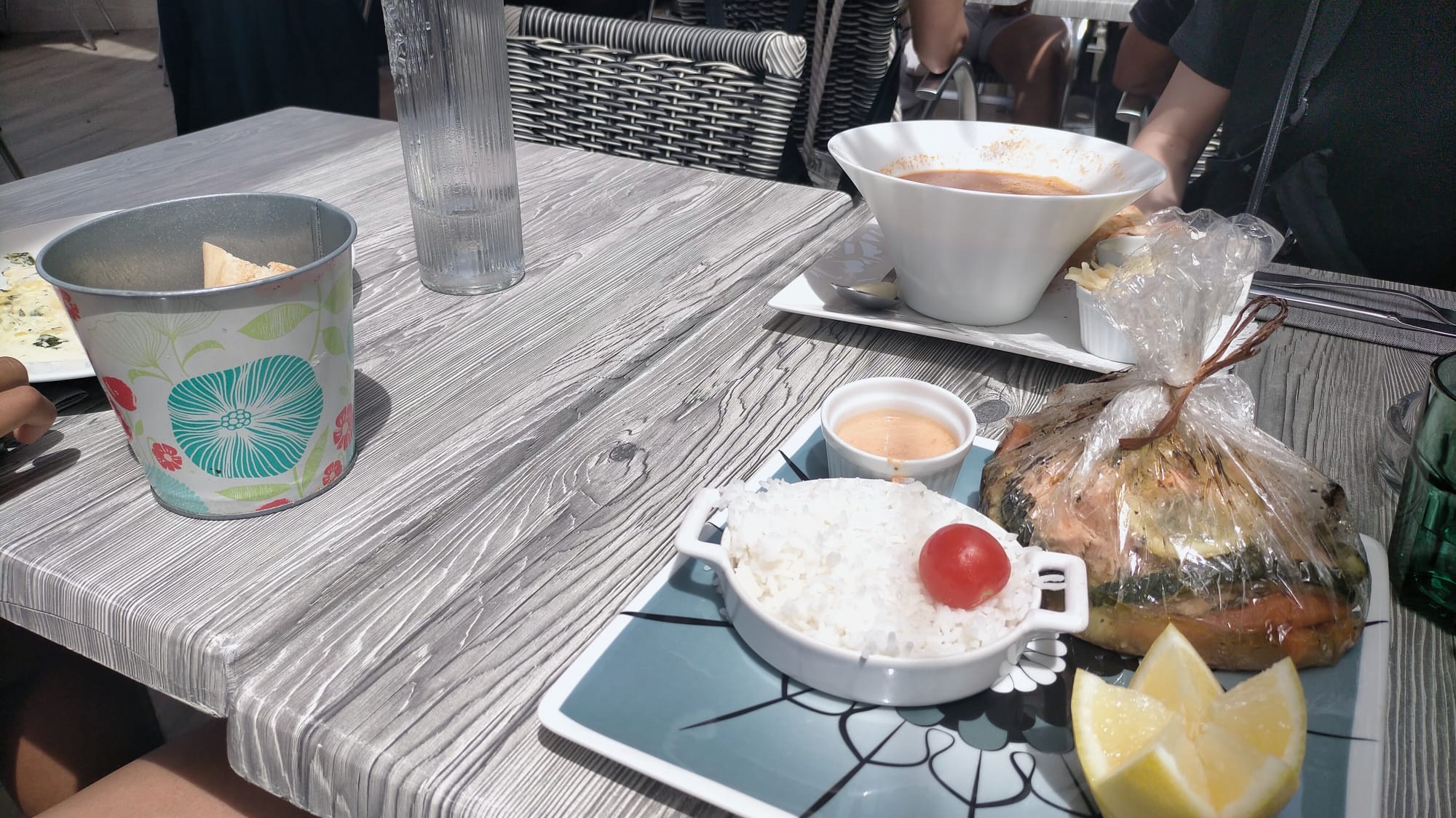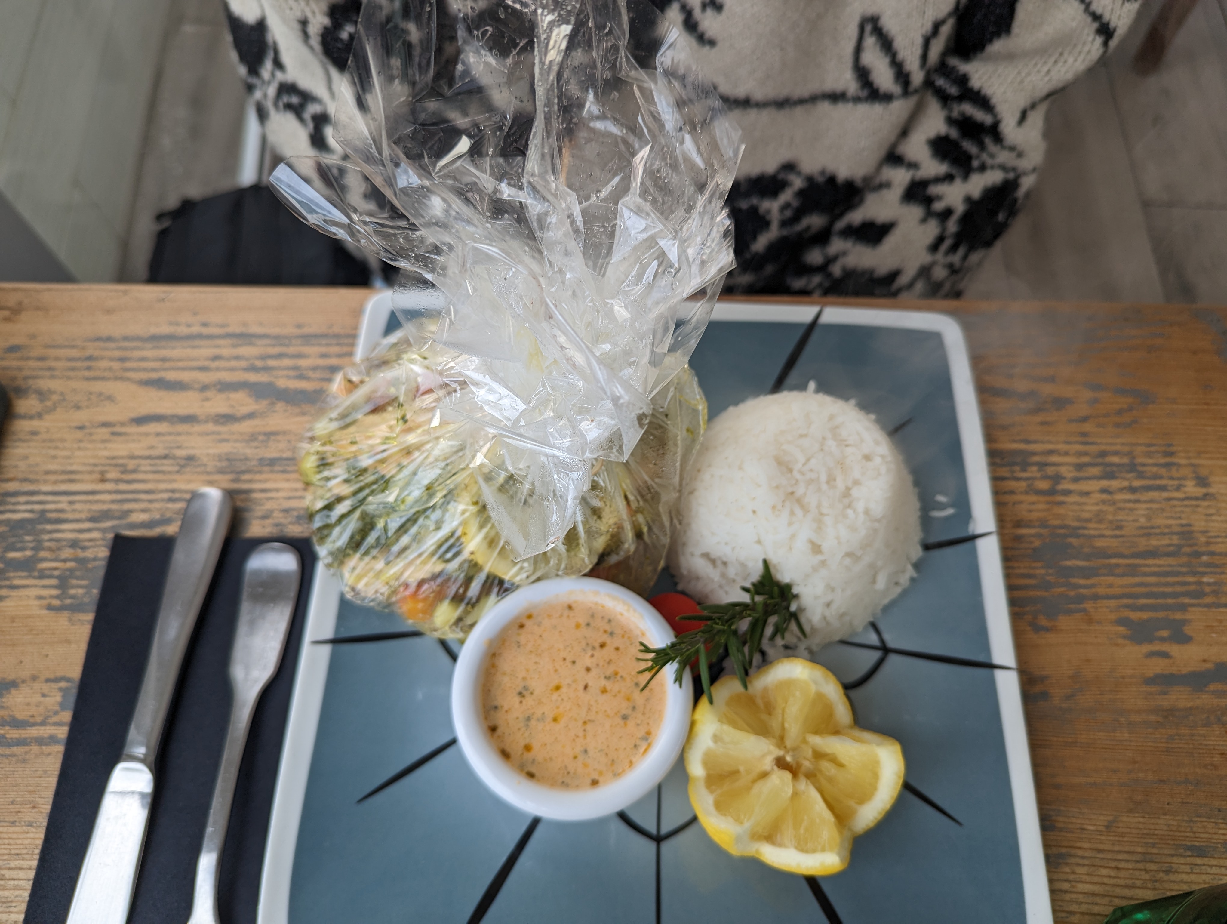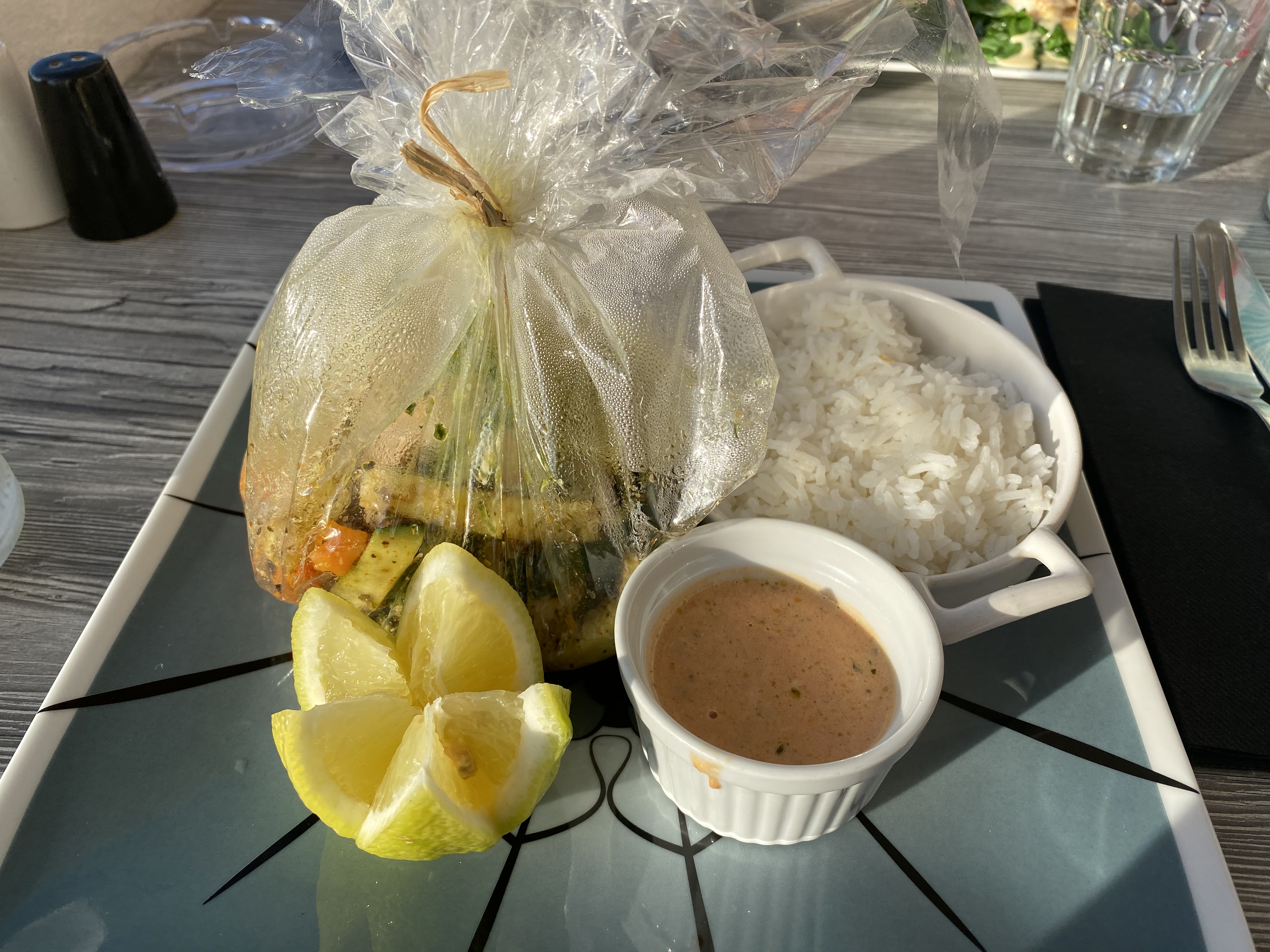 Très belle vue. Attente longue. Nous avons commandé une soupe de poissons, des raviolis à la ricotta et un saumon au légumes croustillants. - Les raviolis étaient bons - La soupe était bonne - Le saumon était servi dans une papillote en plastique avec les légumes au fond de la papillote. Les légumes étaient mous, le saumon avait des morceaux de plastique. Et un morceau de la papillote avait cramé. Nous avons fait remonter ce problème au staff et pas de réaction de leur part. Leur réponse : « c’est normal, c’est comme ça qu’on le sert ». À ÉVITER