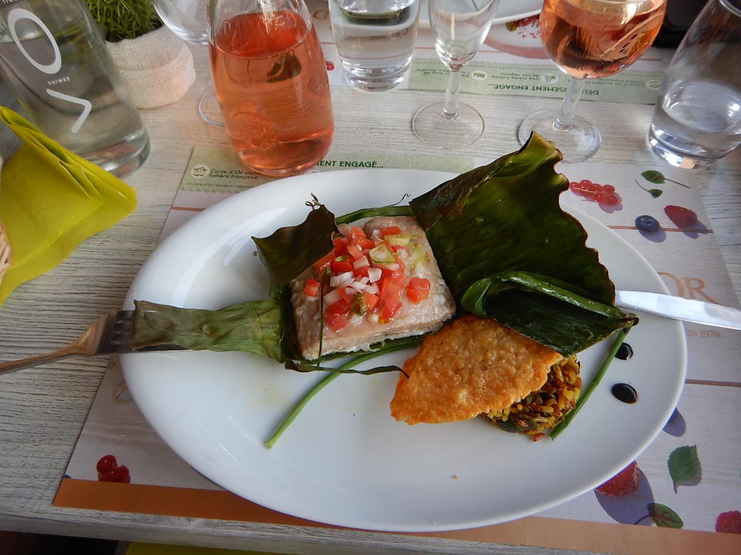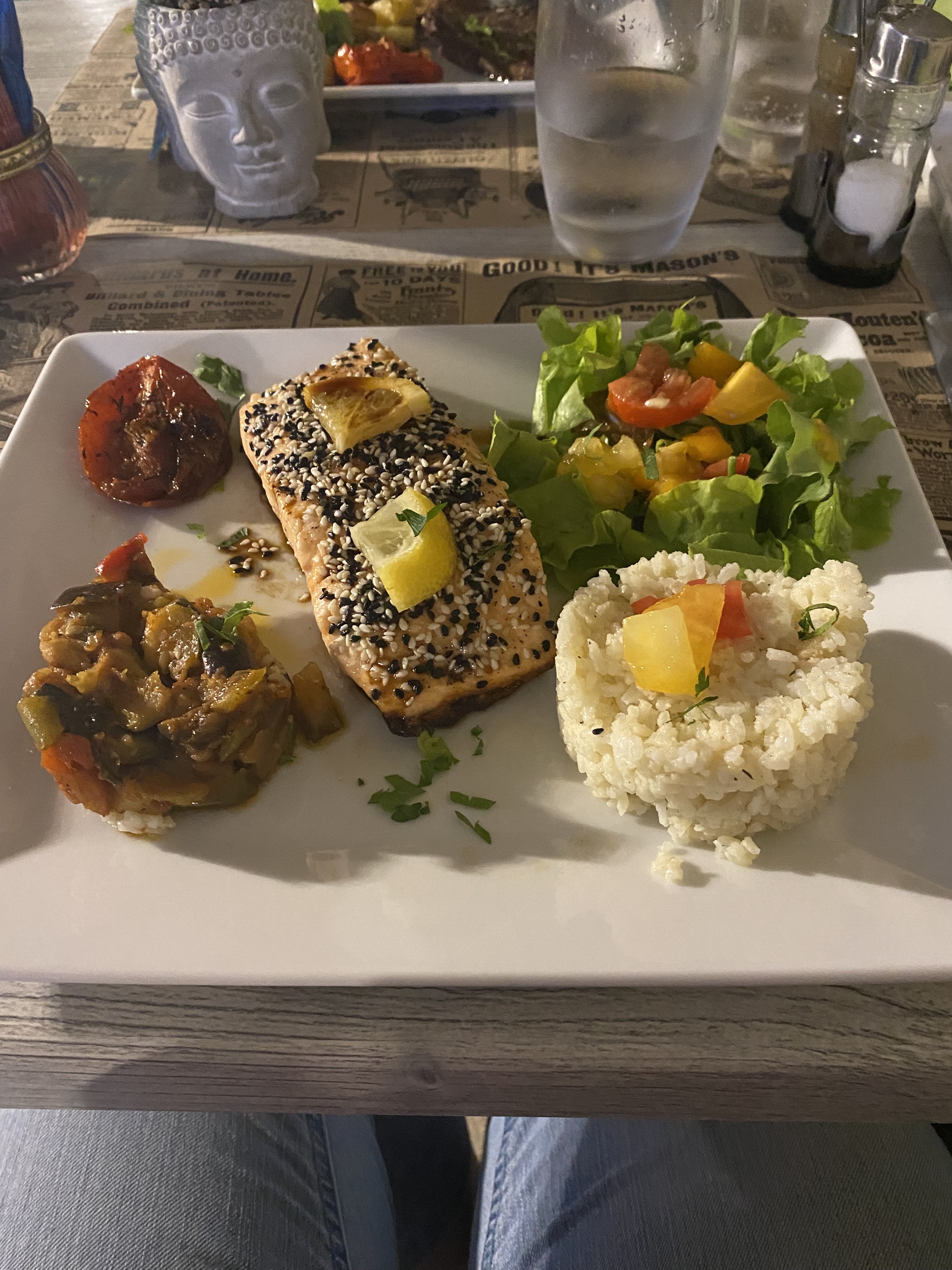 Je me suis régalée avec un pavé de saumon, ratatouille maison excellente et riz aux citrons confits. Plat très copieux. Je me suis laissée tenter par un tiramisu au mojito… une tuerie ! Les serveuses très très sympas