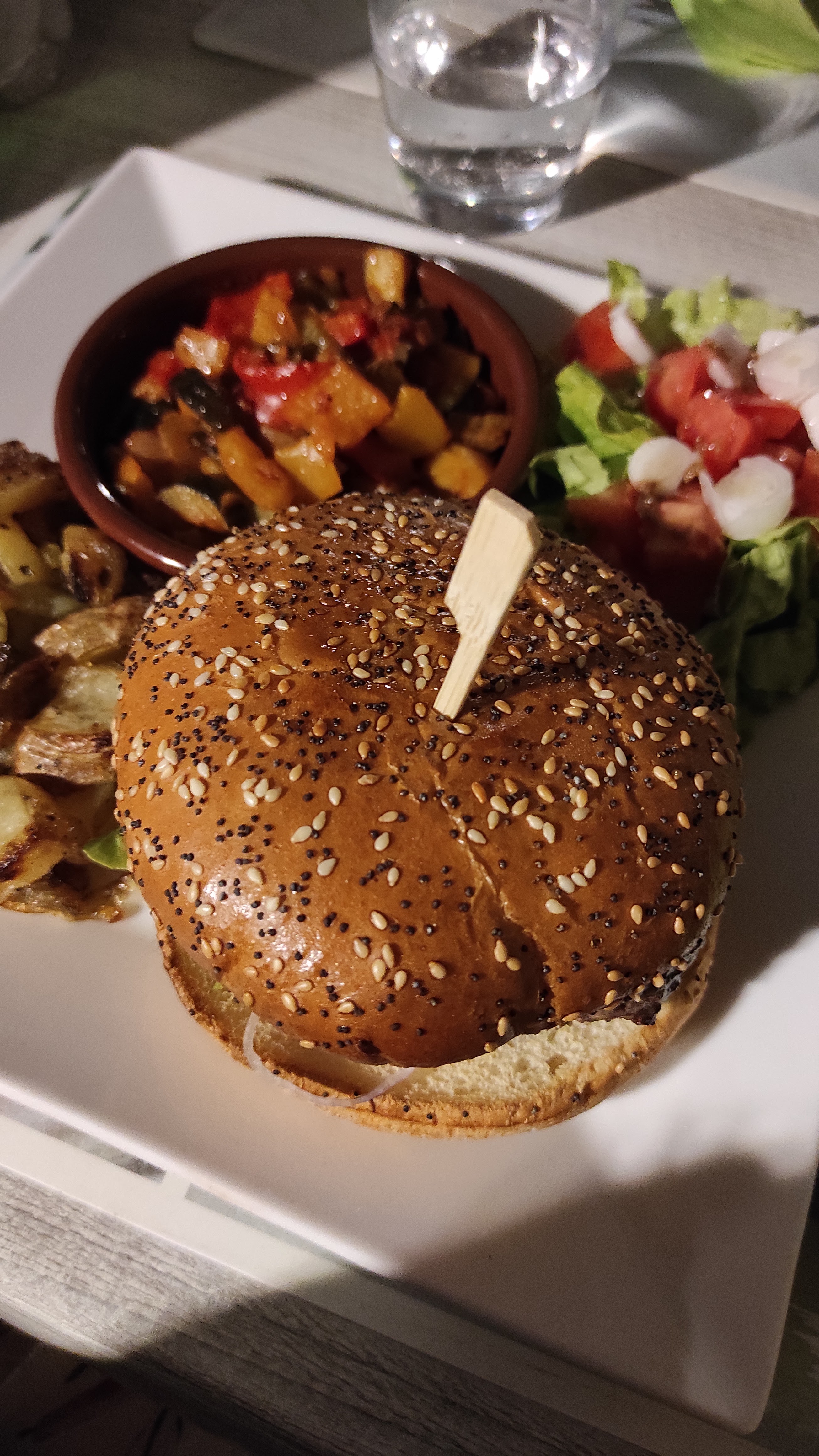 Nous avons choisi et trouvé ce petit endroit à la dernière minute en fin de soirée, sans réservation une fille extrêmement gentille et serviable nous a accueilli qui nous a aussi donné des conseils sur le plat. Tous nos amis ont pris le hamburger avec leurs légumes locaux, tous très bons. Le restaurant est très agréable, ils ont des sièges à l'intérieur et à l'extérieur, l'extérieur (où nous avons dîné) est sous un auvent décoré de guirlandes lumineuses et offre une belle vue sur la vallée. Recommandé, prix moyen. Parking disponible au-dessus de la structure ou dans les environs.