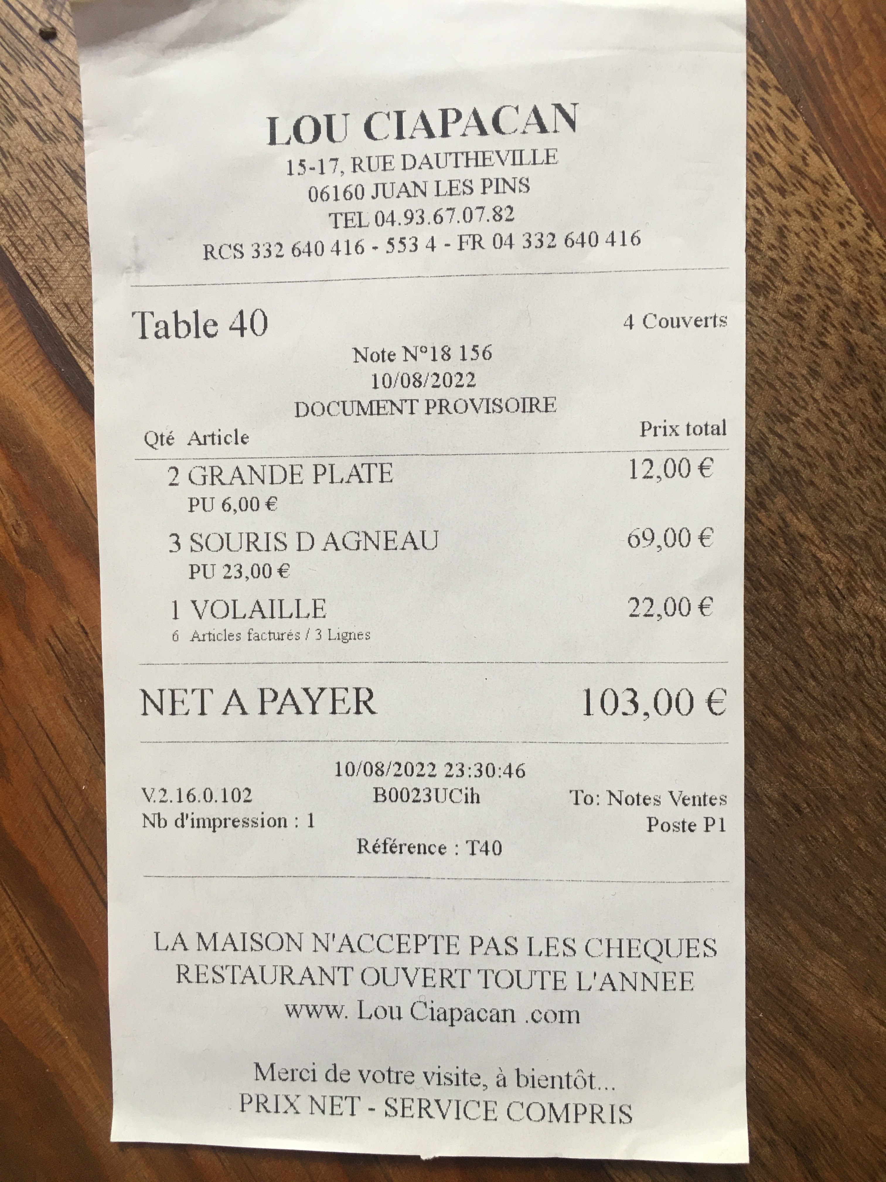 Coup de coeur à Juan les Pins Mon mari français et moi fréquentons ce restaurant depuis plus de 10 ans. On apprécie le service, l'ambiance et la délicieuse cuisine régionale. Nous n’avons pas encore été déçus par aucun des aspects proposés par Lou Ciapacan. J'aime particulièrement le loup (bar européen), le farcis niçois, et mon dessert préféré est le fondant au chocolat !!