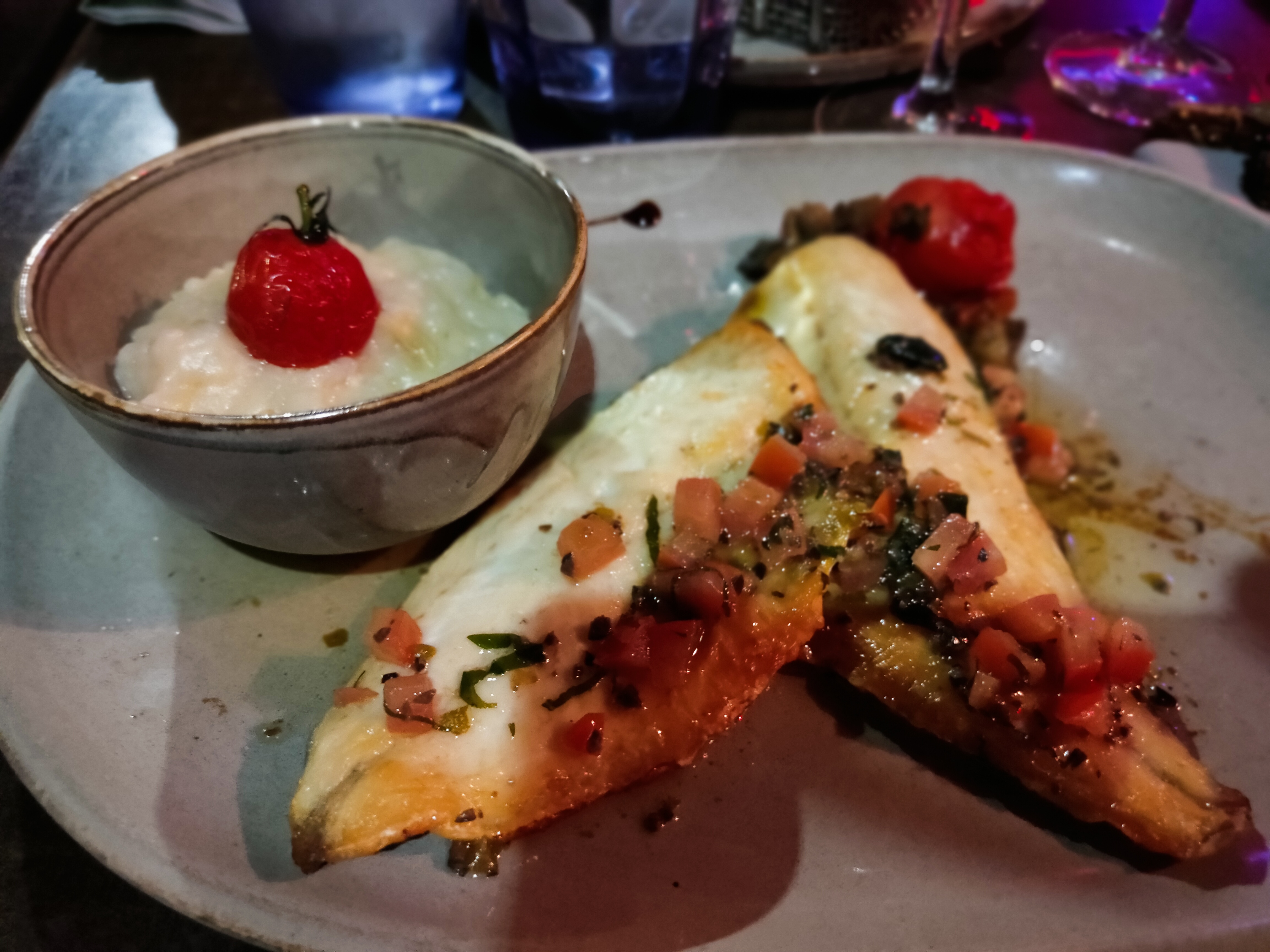 Très bonne expérience ! 3 serveurs très sympas et drôles ! Une petite pointe de commercialité qui vaut le détour. Nous avons dégusté : - 1 assiette de tapas pour deux (gros point positif pour les petits farcis) - 1 plat de ravioli tomate mozza (ne pas hésiter à prendre du parmesan) un régal - 1 loup de mer à la plancha trop bon Petit bémol pour le risotto mais sans importance Merci beaucoup pour ce bon repas ! Et merci pour avoir rendu nos jambes brillantes grâce à votre produit de nettoyage de table (Ahahah)