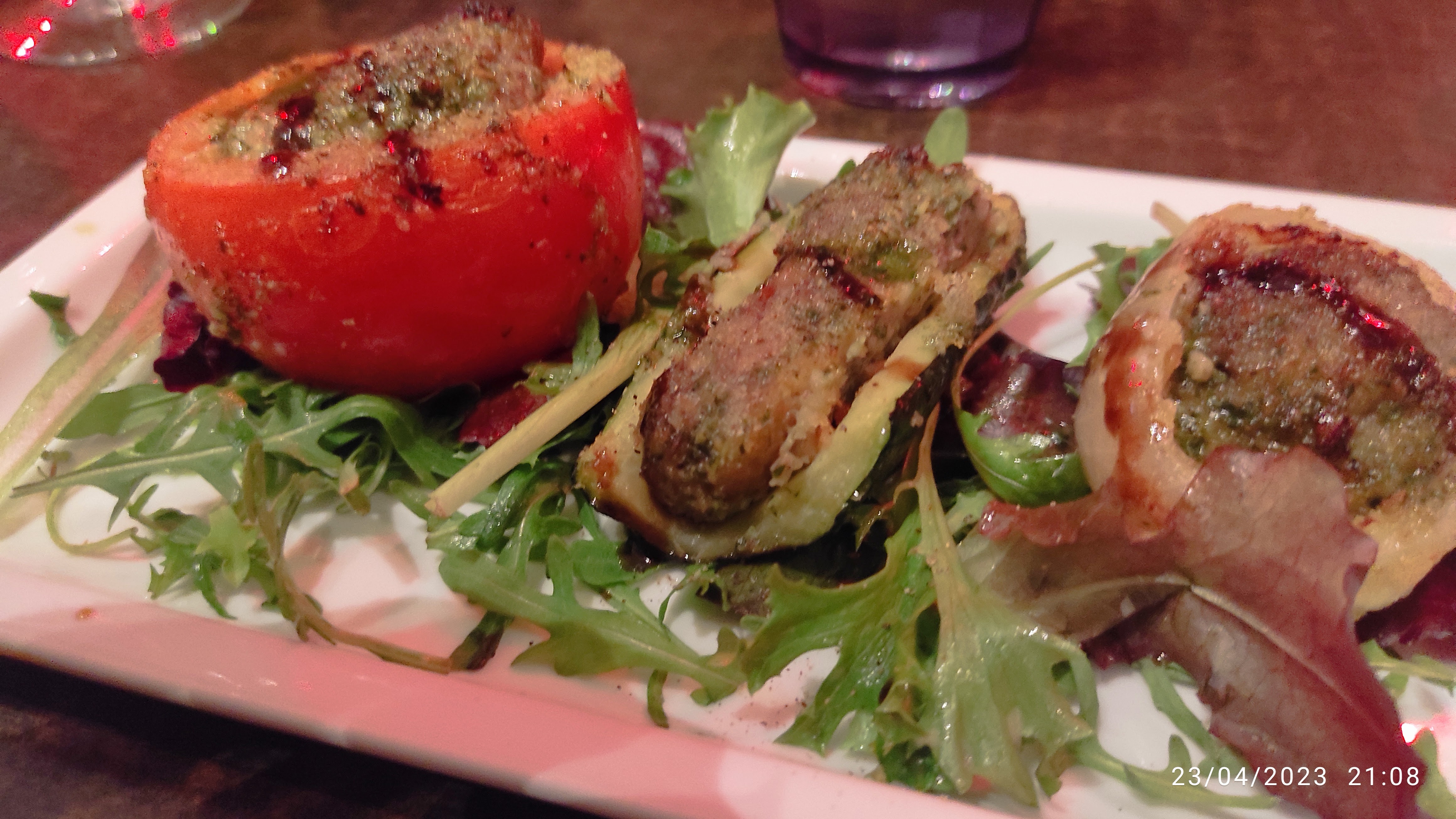 4/5 pour l'entrée : petits farcis niçois 2/5 pour le plat : coucuilles Saint-Jacques, combats et calamars.