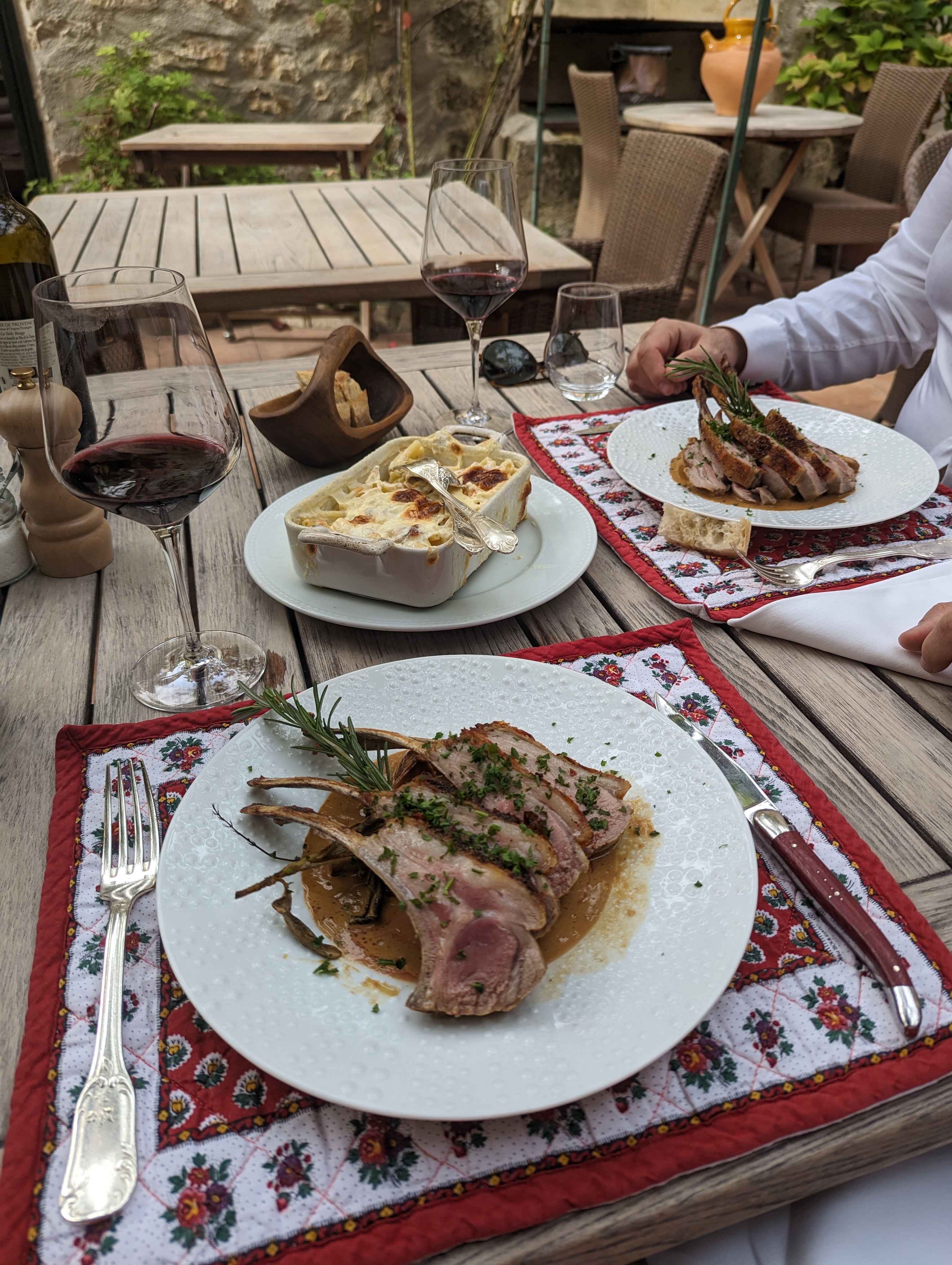 Notre meilleur repas complet en Provence ! Cuisine locale classique. Personnel incroyable. S'il leur en reste, procurez-vous le carré d'agneau pour deux avec du macaroni au fromage. Demandez à vous asseoir dans la cour arrière, le cadre est magnifique.
