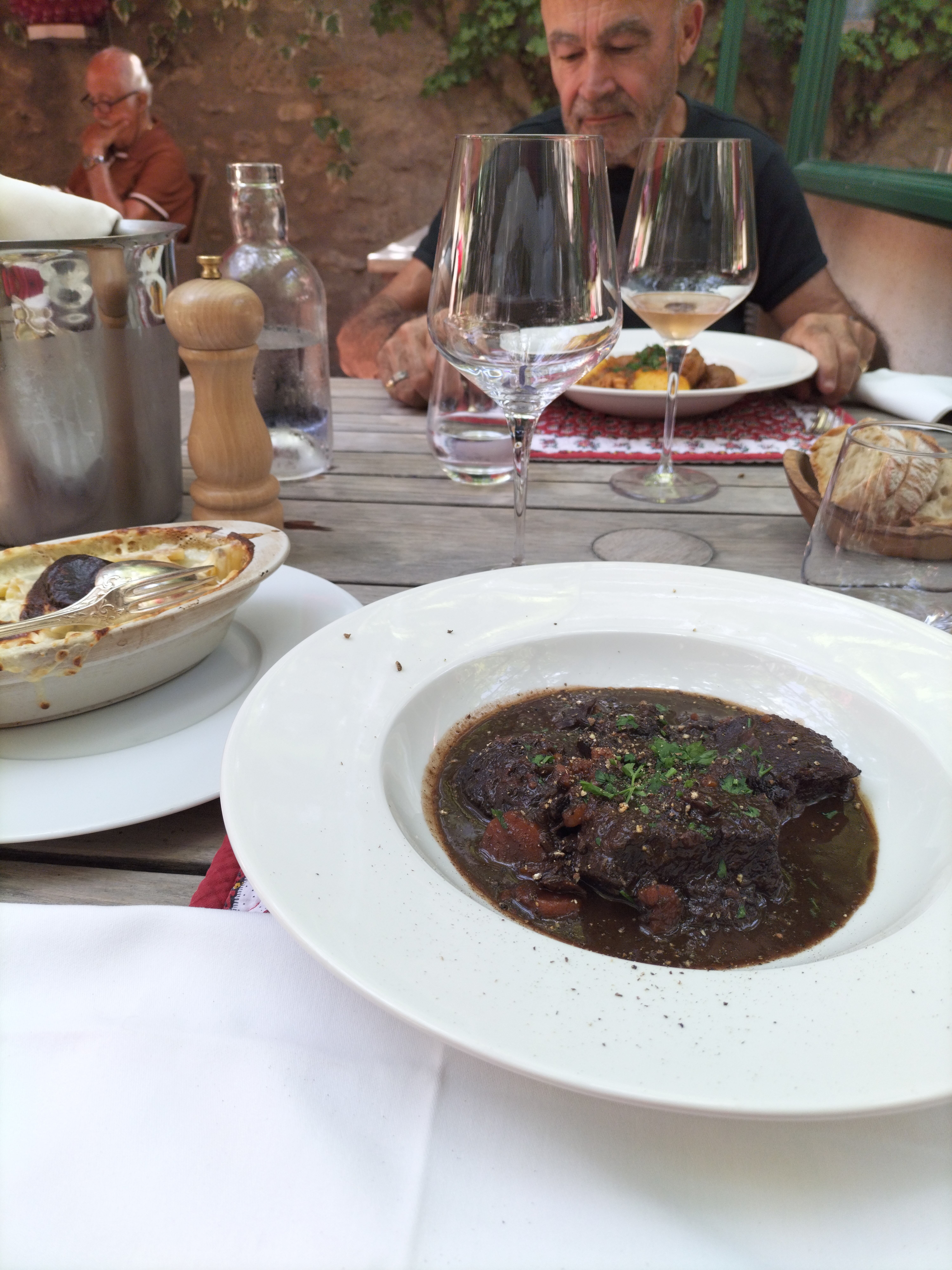 Joli patio , la daube bonne mais un peu trop salée , le gratin de macaronis bon,le dessert très bon