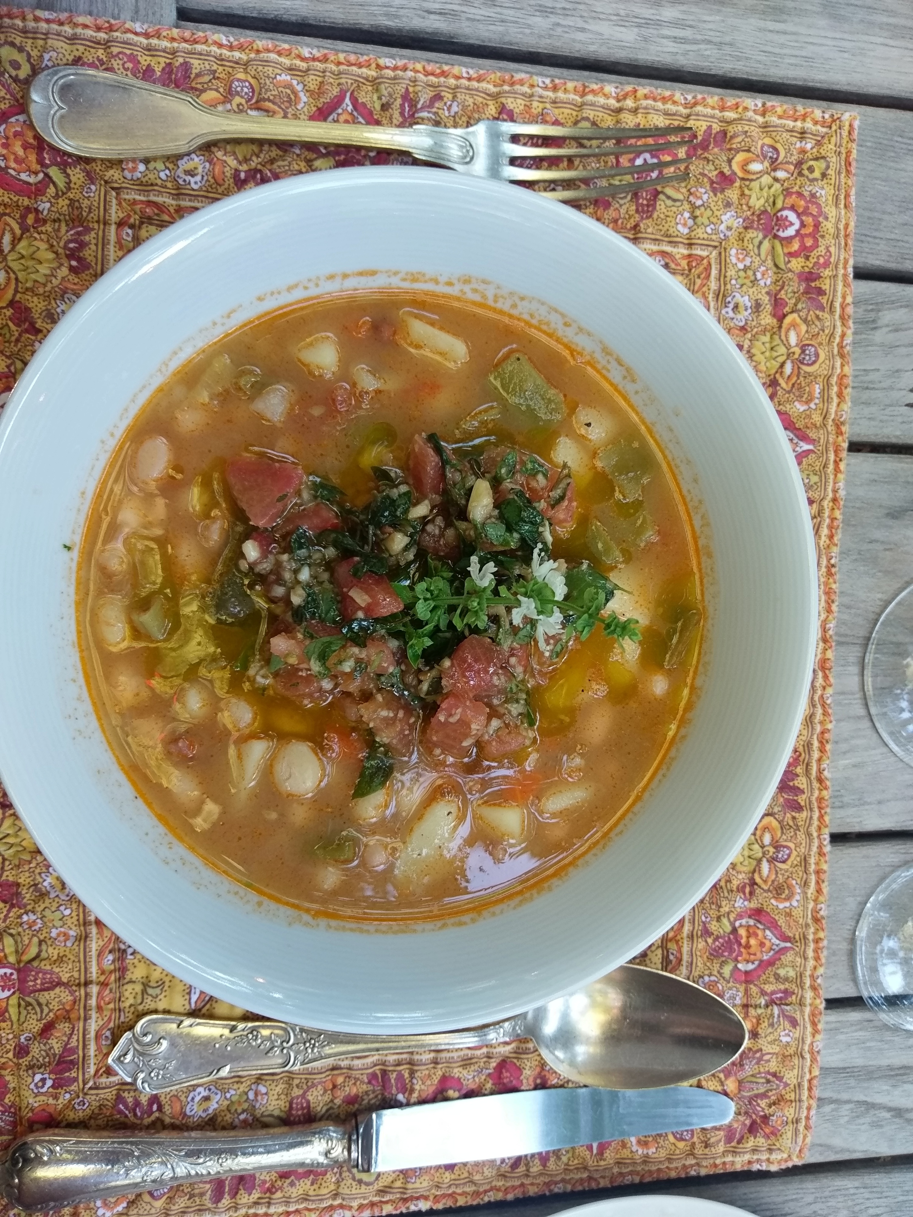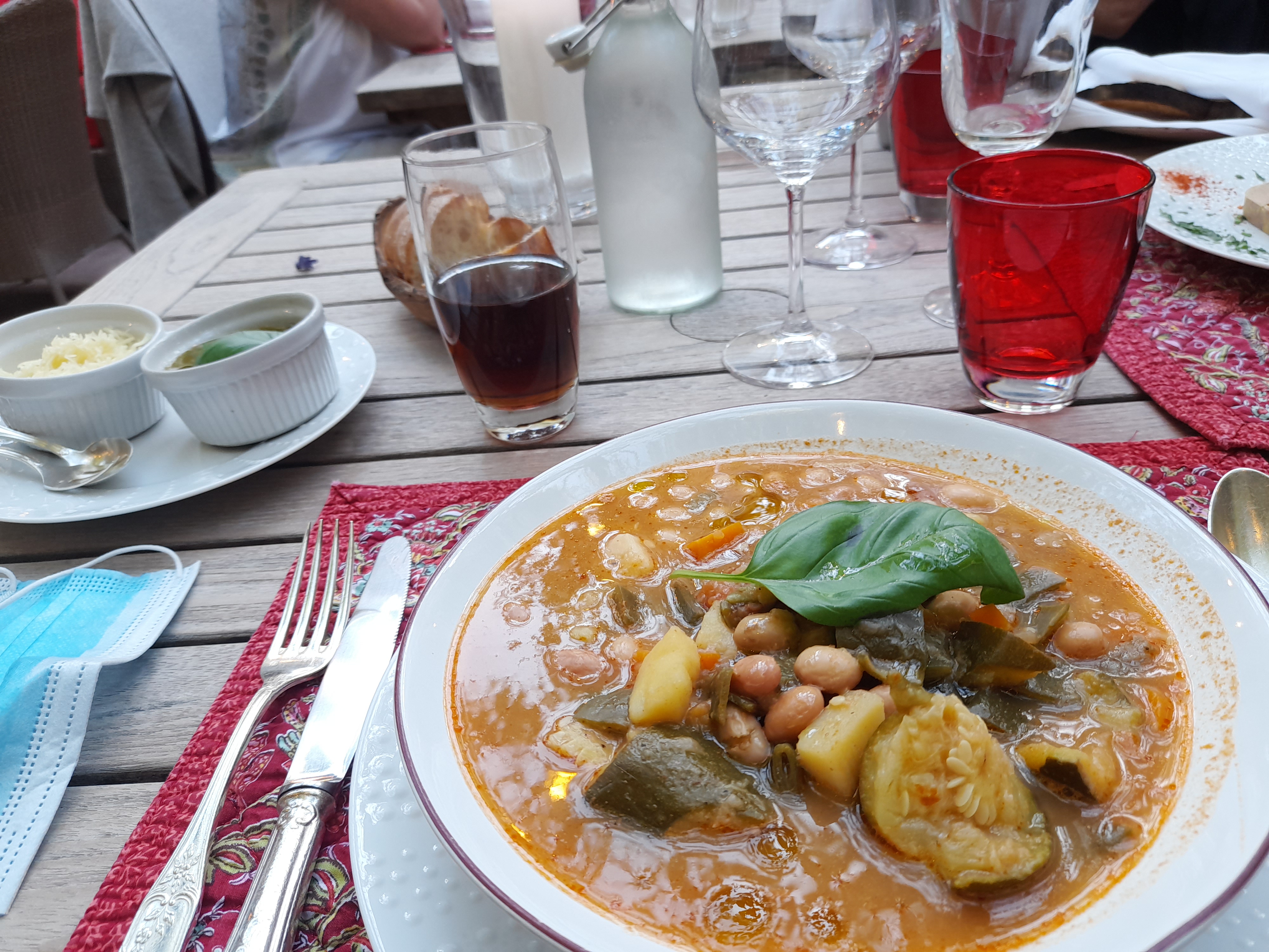 Magnifique endroit où la cuisine ici est authentique, vrai, de cette Provence que nous venons tous et toutes chercher. Ici, on ne revisite pas, on ne réinterprète pas l'authenticité de cette cuisine provençale est bien la fidèle et de qualité la vraie celle qui vous emporte, vous emmène retrouver comme moi des goûts et des odeurs de l'enfance. Jean Giono disait, La vie de l’homme est une chasse au bonheur, parmi ces bonheurs, l’exercice de la gourmandise est un des plus importants. Alors comme moi, soyez gourmands. Venez le vérifier vous-même. Merci à vous pour ces quelques moments où accueil, et générosité ont été précieux, à très bientôt. La soupe au pistou