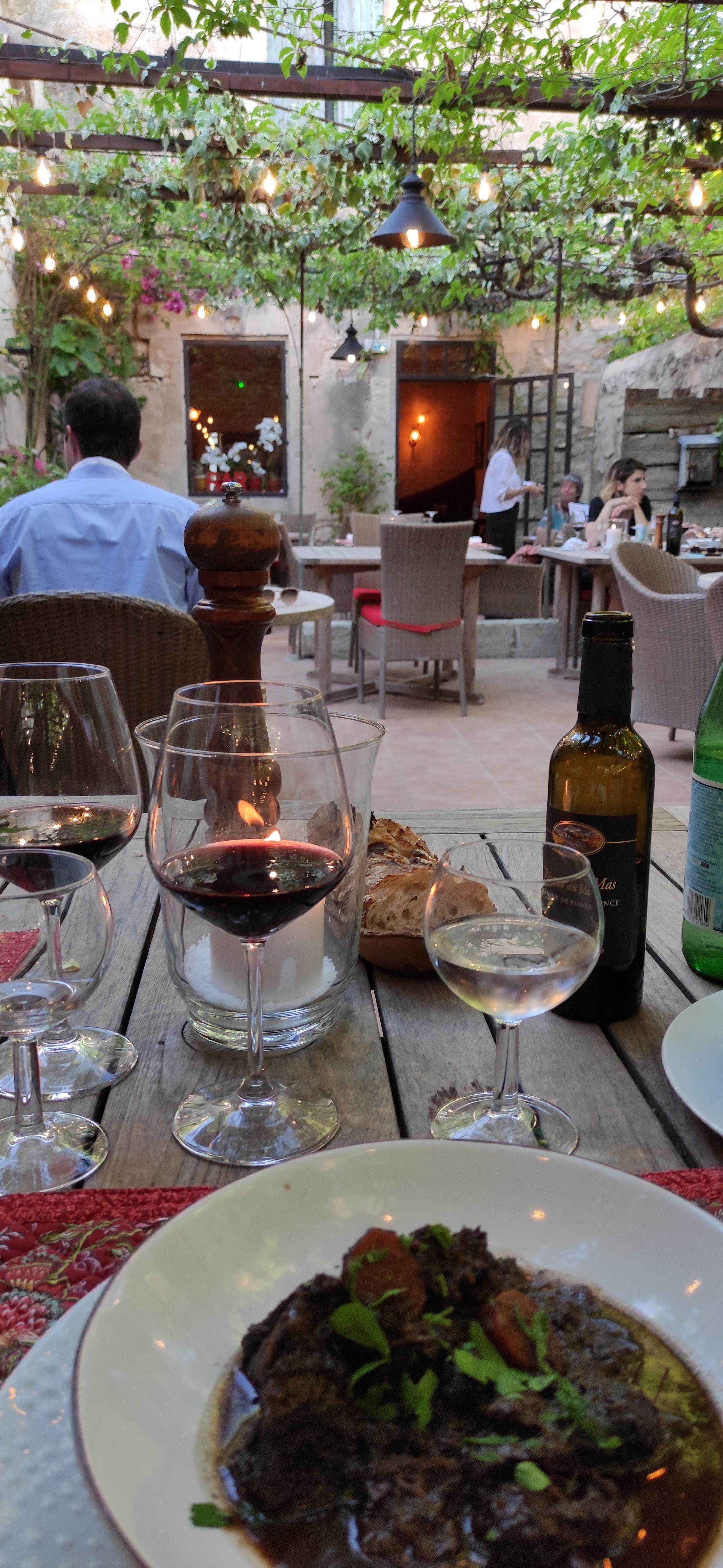Étape gastronomique incontournable lorsque vous êtes dans la région d'Arles... Restaurant où les saveurs enchantent les papilles! Ambiance chaleureuse et accueil agréable. Les plus de cet établissement : Le beignet de fleur de courgette servi en amuse-gueule... La terrasse intérieure aménagée avec sa pergola ( voir dernière photo ) L'agneau cuit dans son jus au thym, Le gratin de pâtes... Et puis, lorsque que l'on prends votre commande, On vous demande quelle couleur souhaitez-vous Comme vin pour accompagner votre plat ? J'adore cette phrase, je ne m'en lasse pas... D'ailleurs, j'y retourne fin juin !