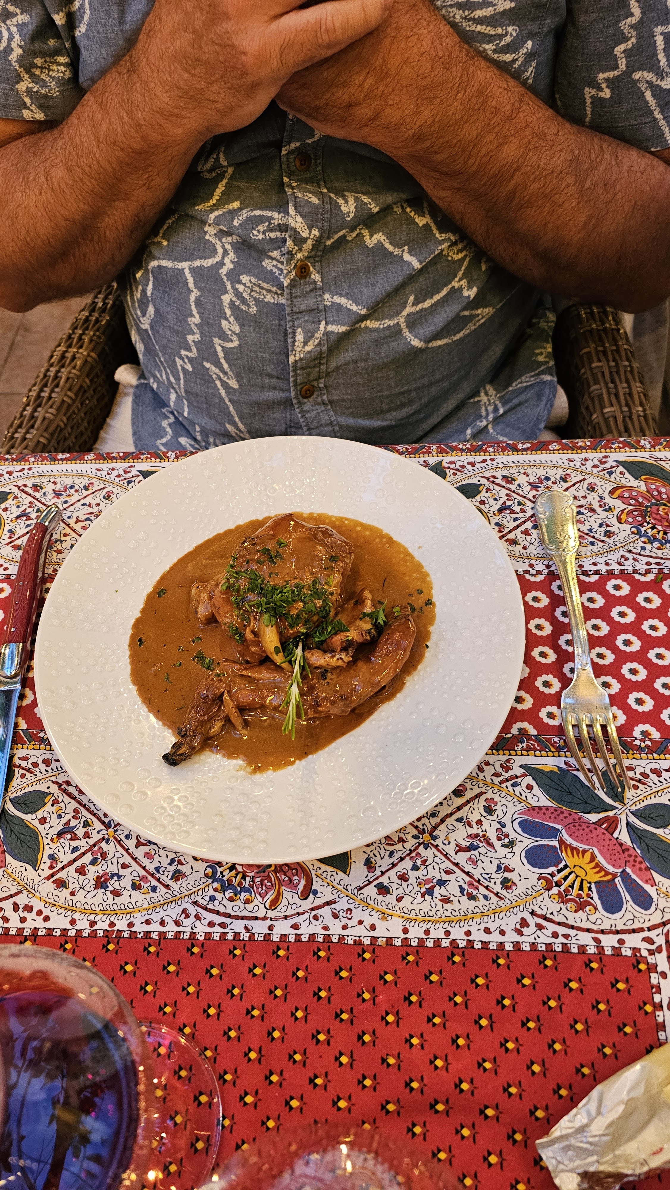 Oh mec. Présentez-vous au dîner affamé. La patronne était à son écoute et se montrait fière. Mes tripes étaient fantastiques, tout comme le lapin et le poisson. Un service de fromages aussi bon que celui que nous avions dans toute la Provence. Nous avions un grand groupe de 11 personnes sur le porche et le service était au rendez-vous. Ne manquez pas.