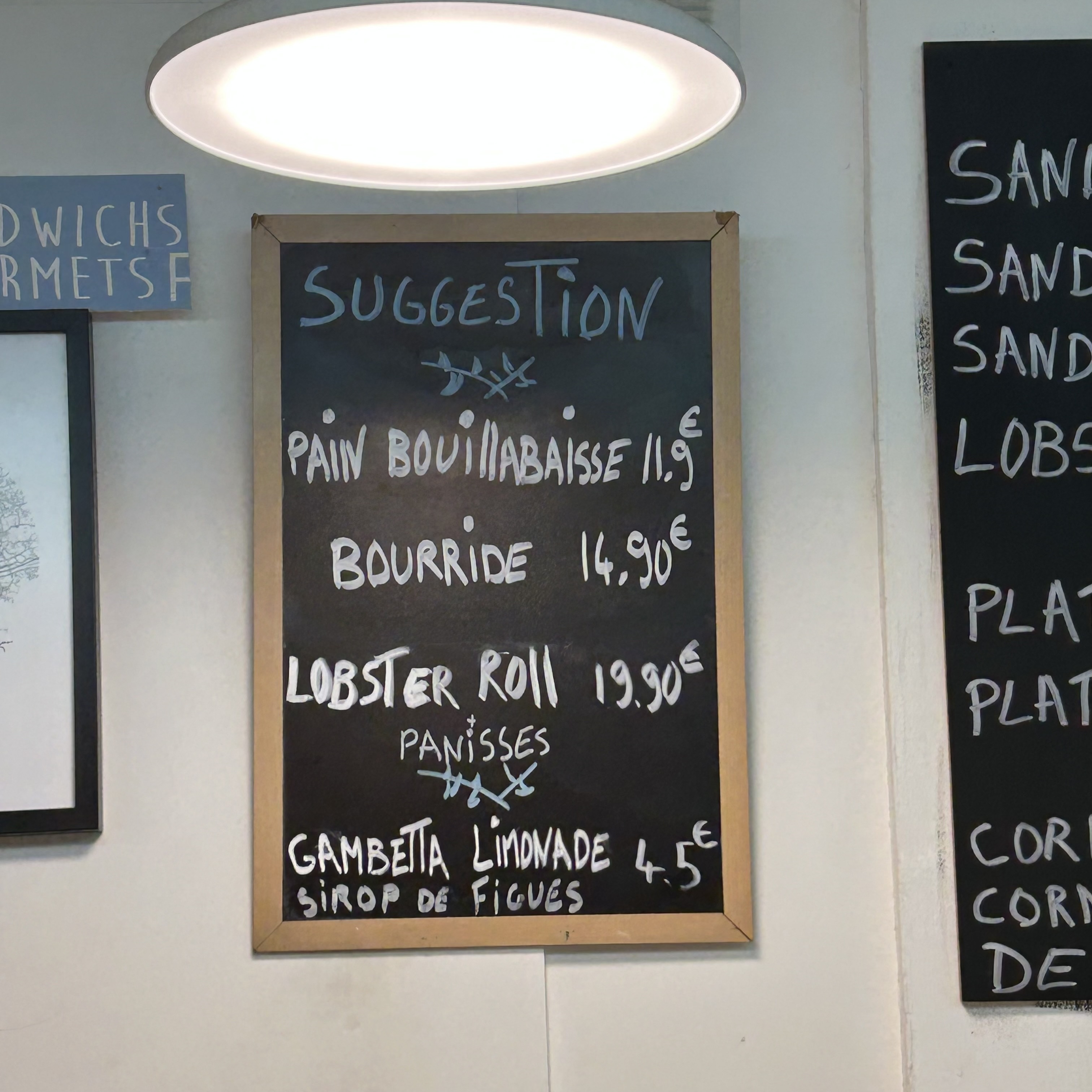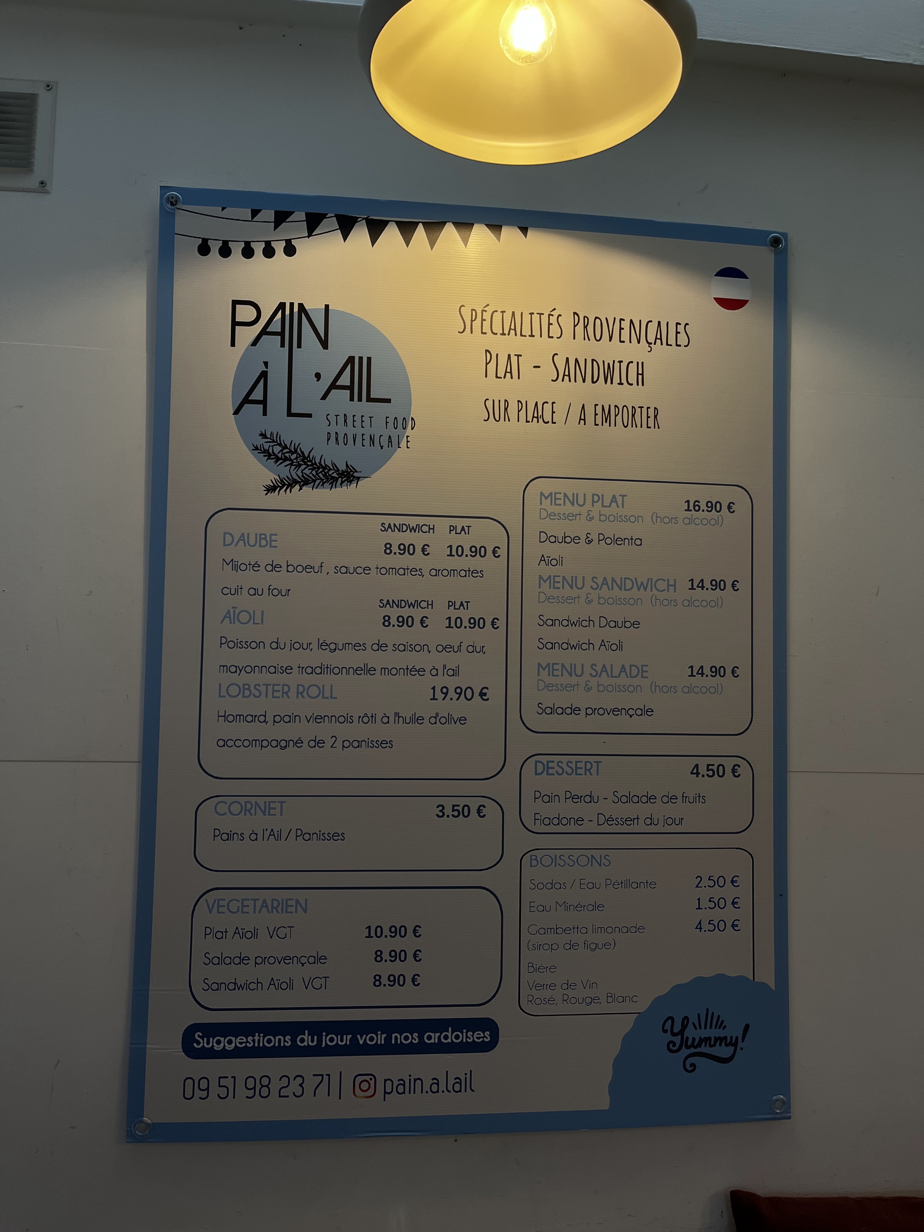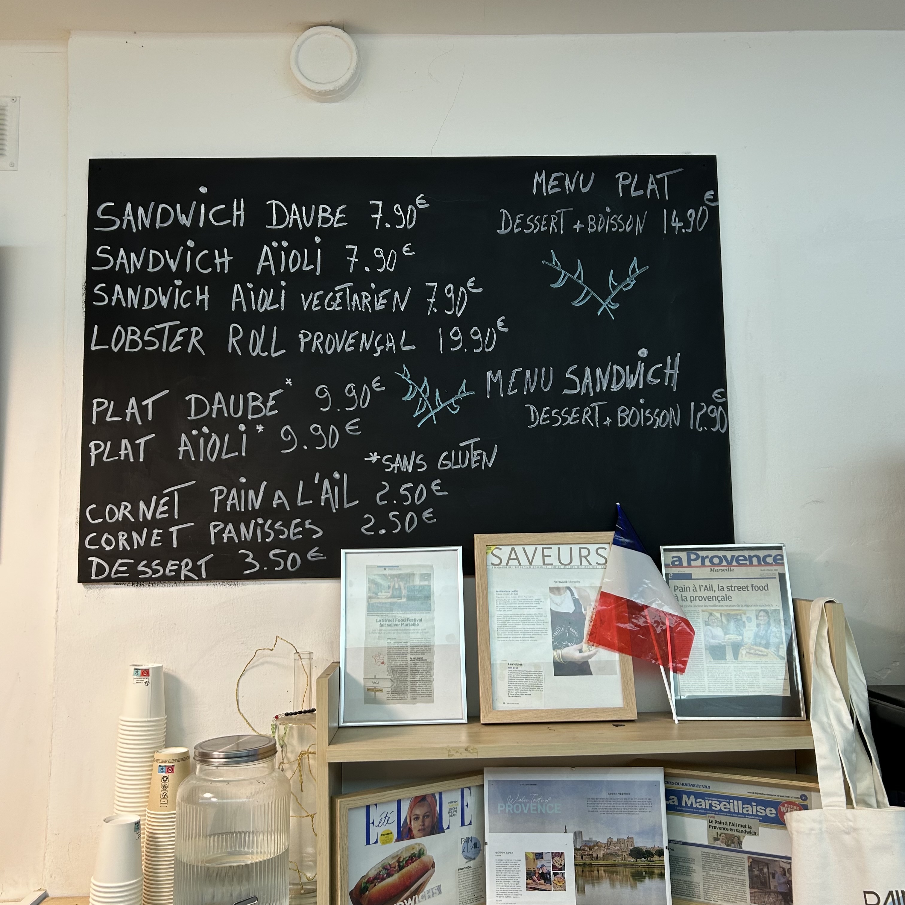 Vous pourrez découvrir le fameux lobster roll mais aussi de nombreuses recettes de sandwichs provençaux à la daube, aïoli, saucisse marseillaise sans cesse renouvelées. Les prix peuvent vite s’enflammer entre 15 et 20€ si pas de formule disponible. Ça peut devenir vite cher pour un « sandwich » mais seul vous serez juge et je vous encourage à goûter au moins 1 fois car l’adresse est unique. Les gérants sont très sympas et efficaces !