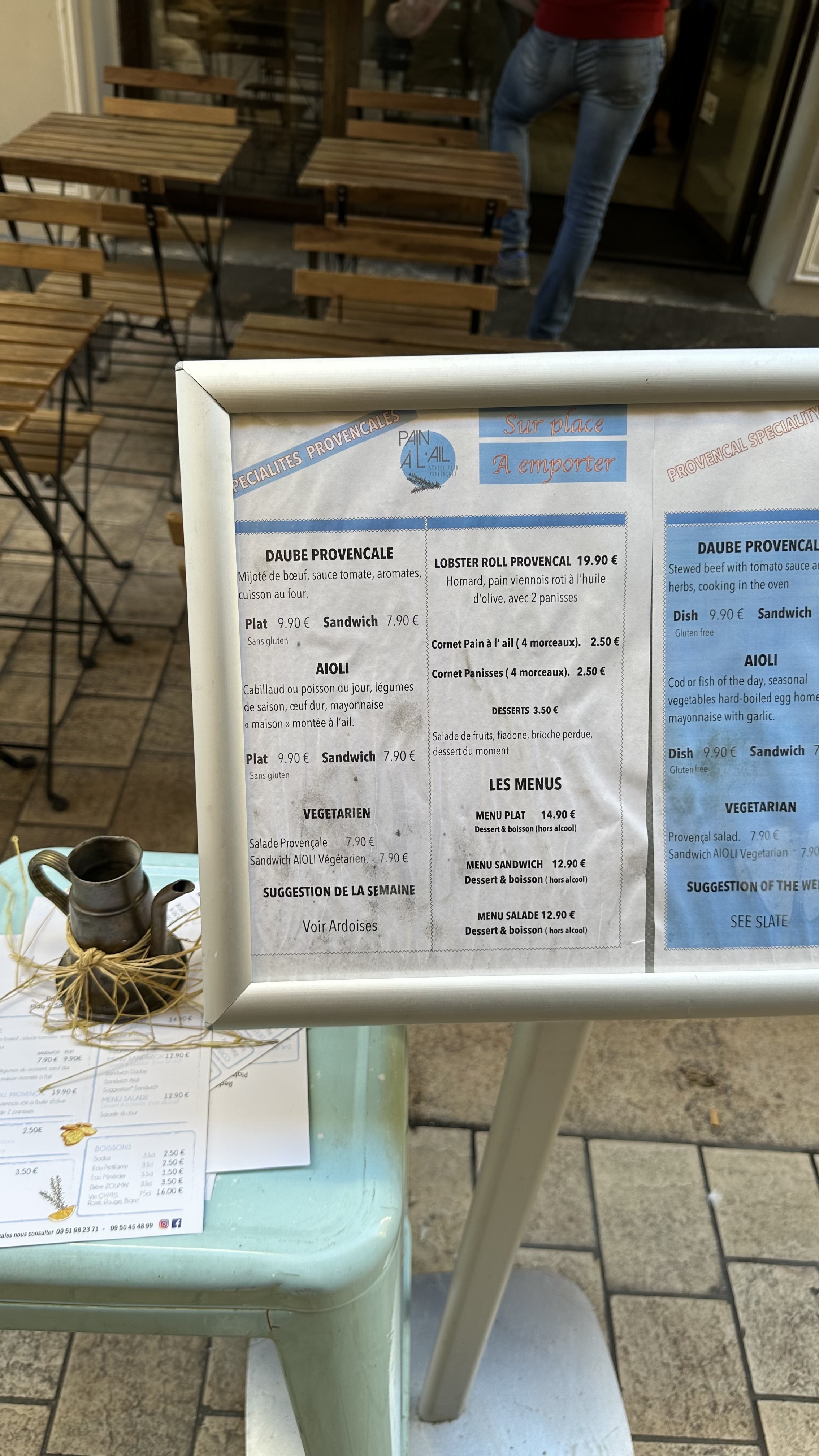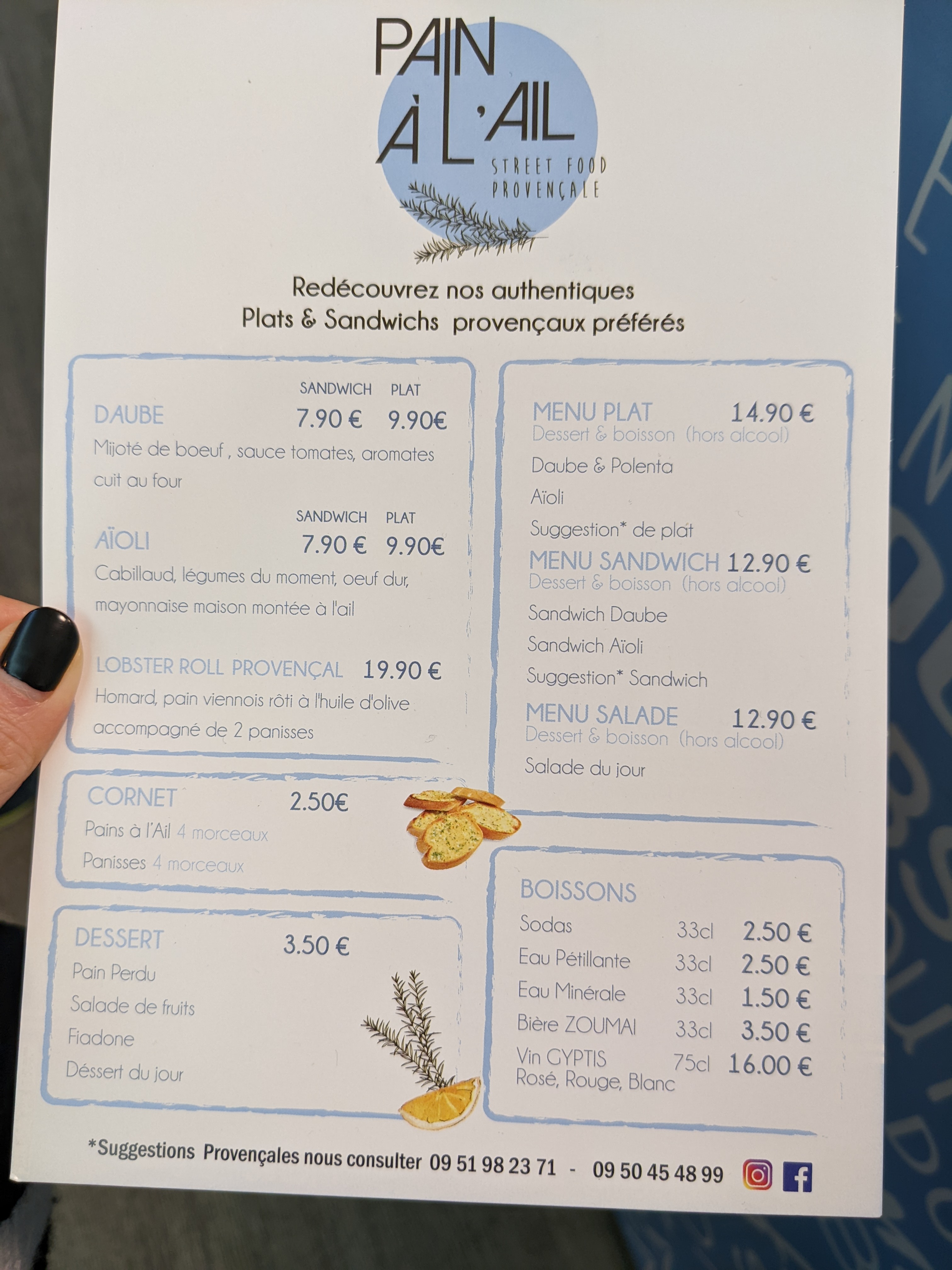 A faire sans hésiter ! De la vraie street food provencale, du fait maison et du pain croustillant à souhait le tout pour des tarifs ultra raisonnable. Adresse à garder ! 👏🏼