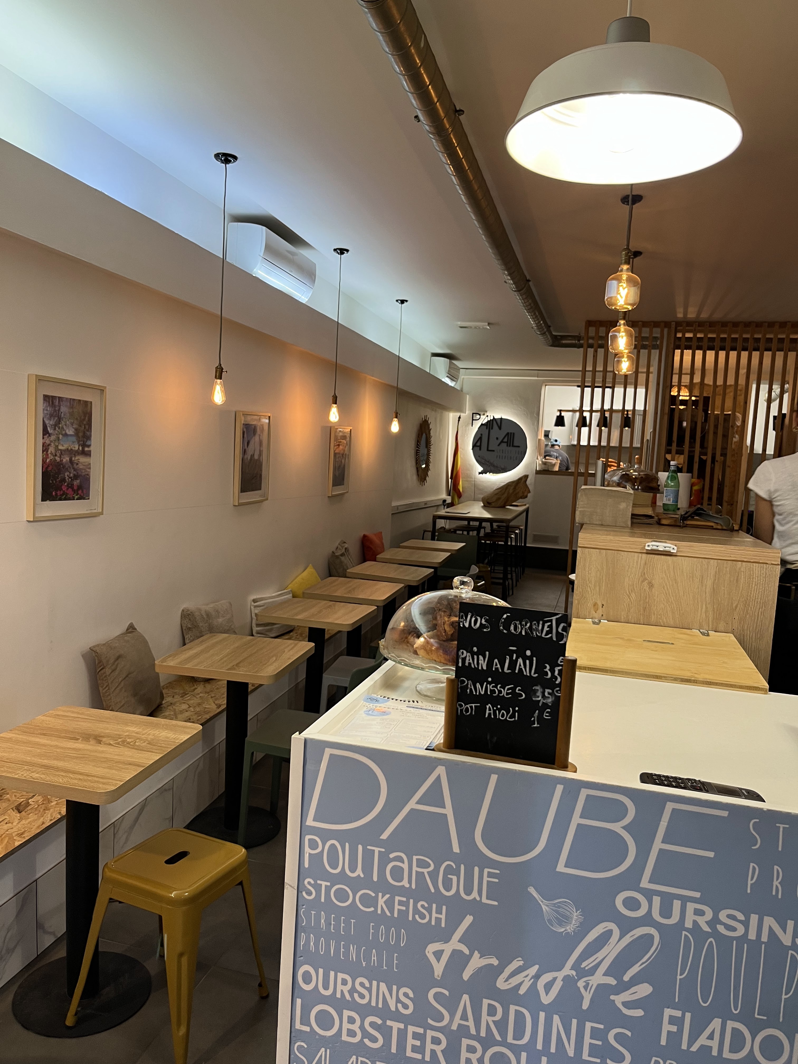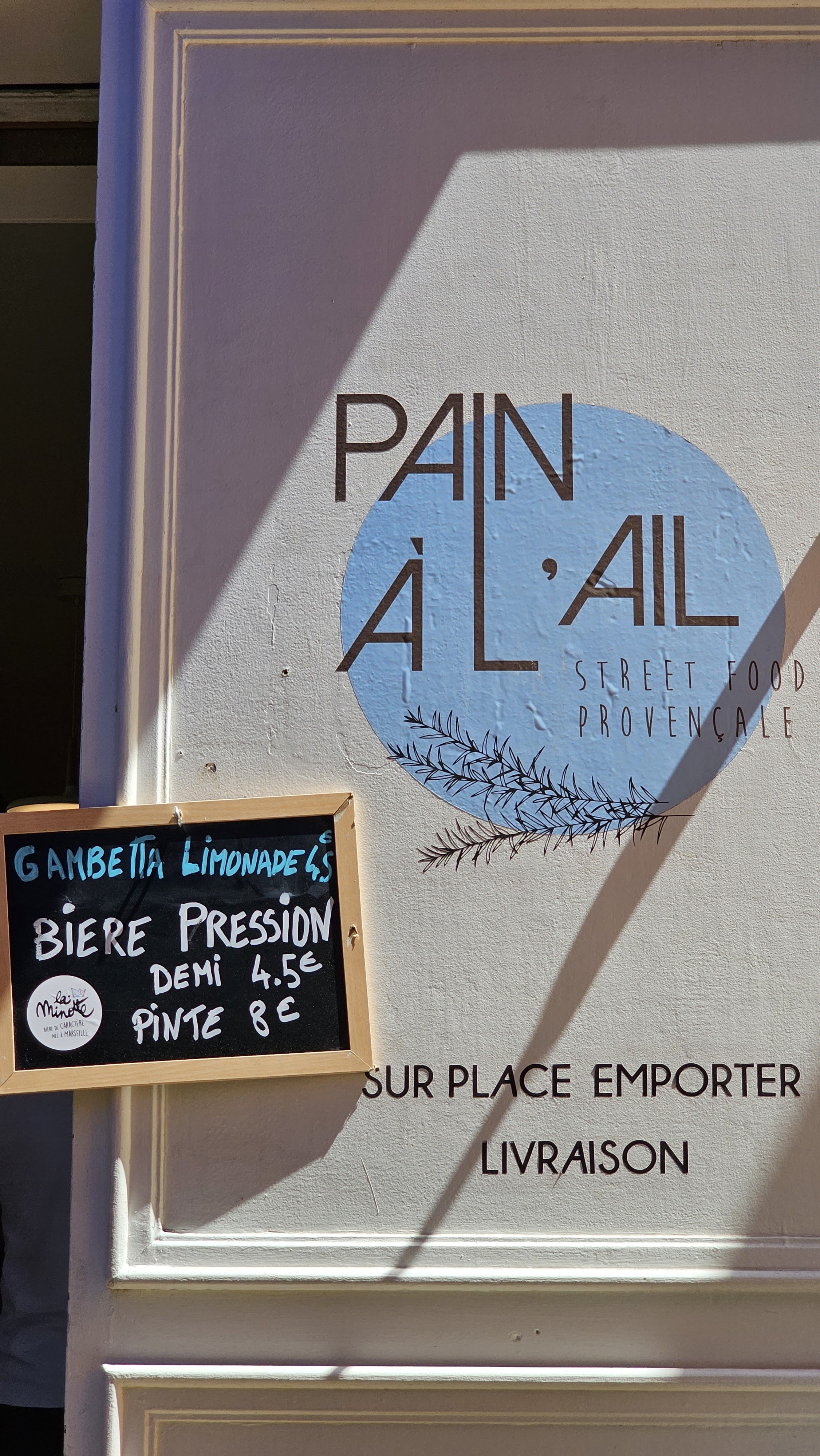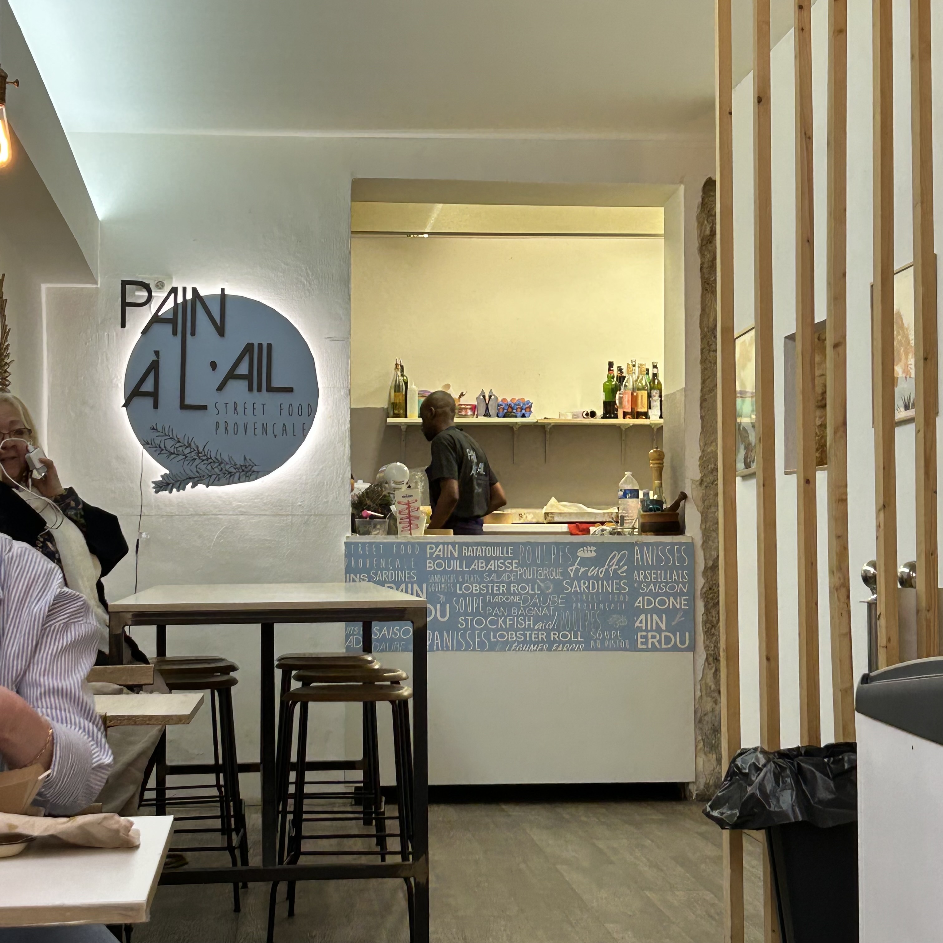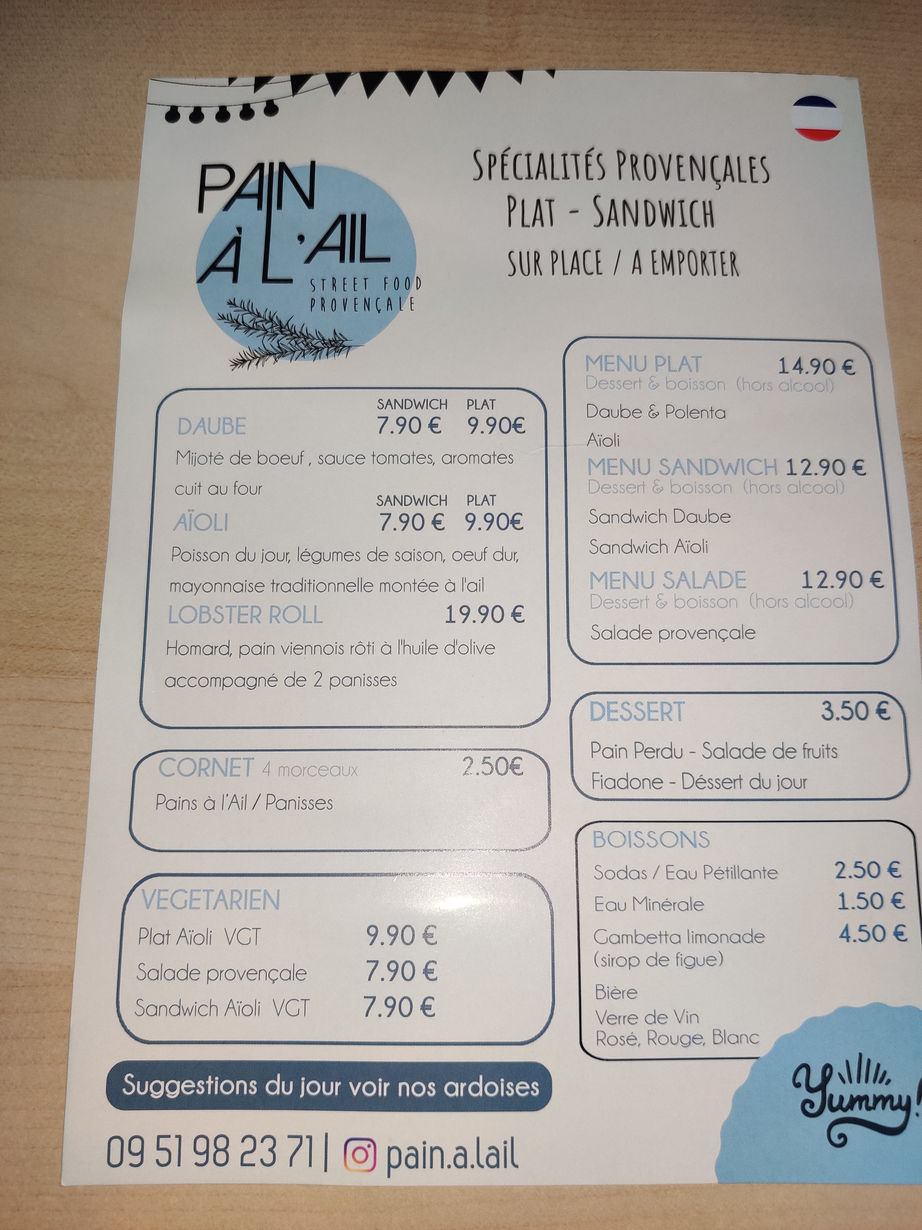 Le hasard fait bien les choses ! Au hasard d'un détours je suis tombé sur cette adresse un resto street food provençal Daube aioli et autres raviront les papilles de chacun Préparé sur place avec des produits frais un accueil chaleureux, une ambiance du sud avec un fond de musique et un accent marseillais dans les échanges ! Mon poulet mon beau ma belle etc la bonne humeur est de rigueur au Pain à l'ail. Vous repartez de cette belle adresse avec le sourire et l'envie d'y revenir ! Merci Rémy le Toulonnais 😉