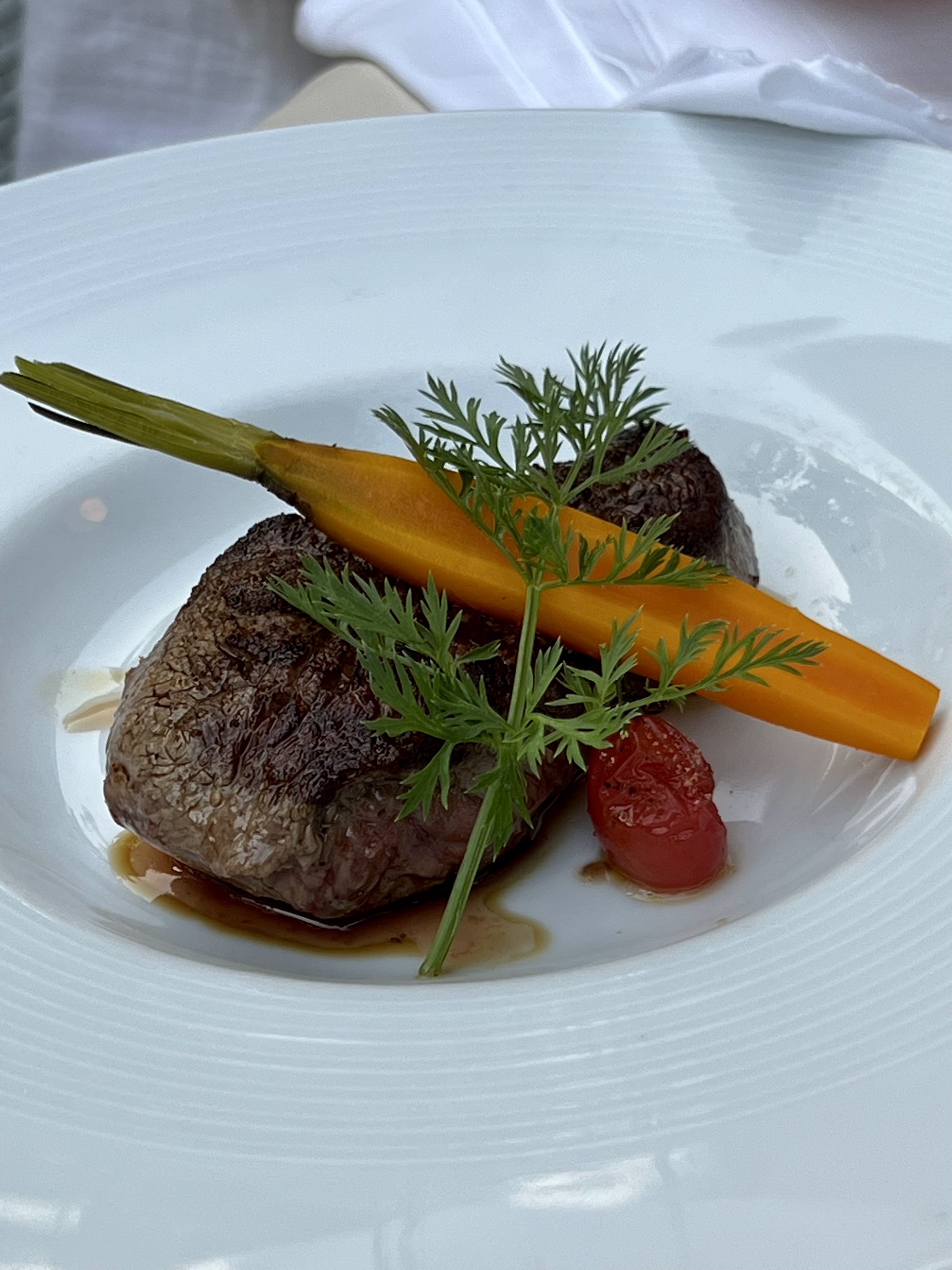 Pour habitude de manger à gassin quand on est en vacances sur saint tropez, nous avons changé de restaurant trouvant la personne à l'accueil sympatique mal nous en a prit une serveuse brune n'a pas aimé les questions sur les intitulés des plats, on à ressentit un agacement.Nous avons pris deux menus à 39 euros le foie gras était mal denerves et part très petite on a eut peur à la suite mon filetde boeuf était trop cuit pas savoureux ( suppl. 8 euros) quand même mon mari lui a prit du poisson à était mieux lotie et nougat en dessert coulis à la mangue très acidulé.Note très sale à la fin .Sur les 5 restaurants pendant notre séjour le seul qui m'a déçu .Des normands aimant la gastronomie.