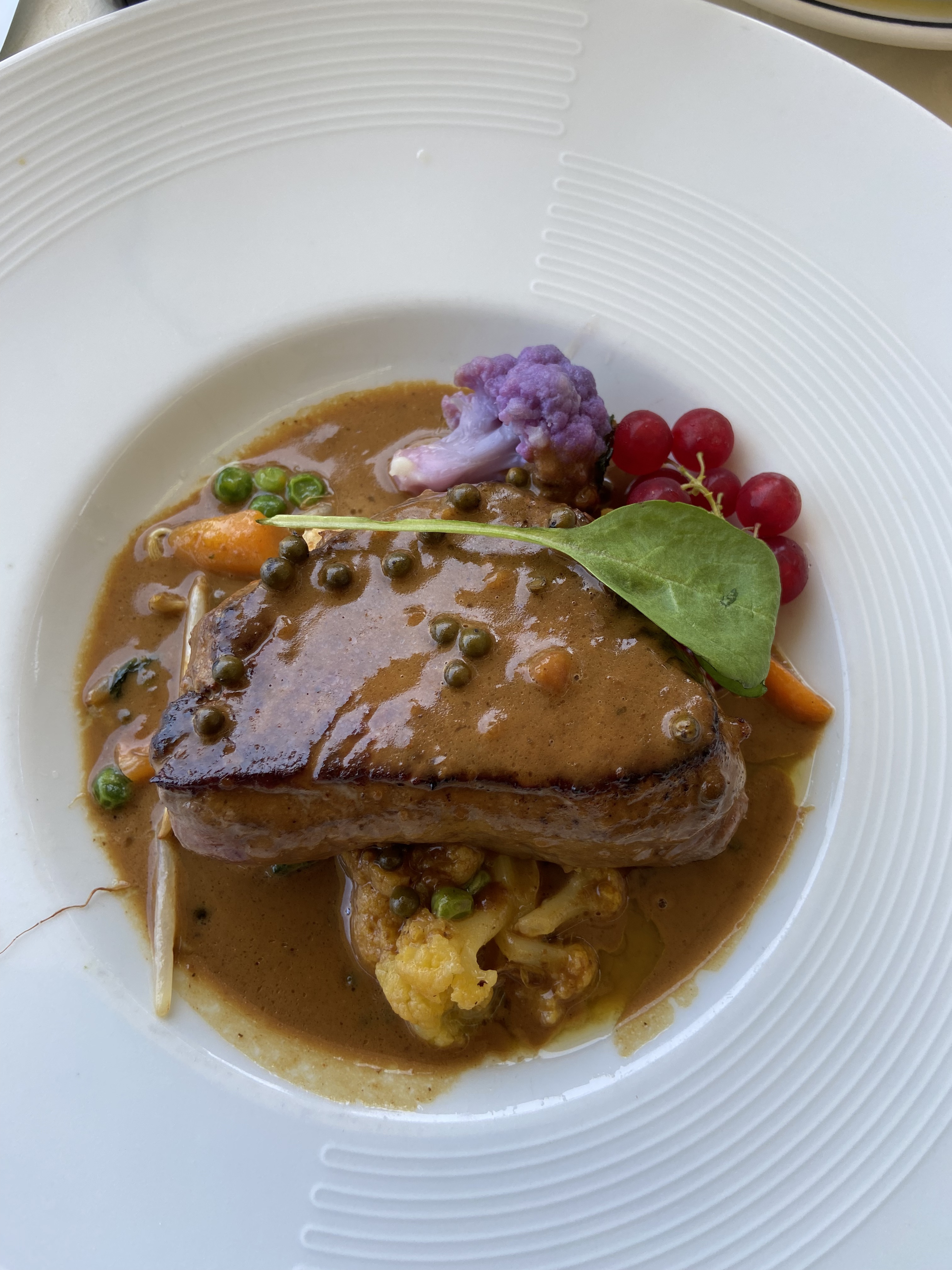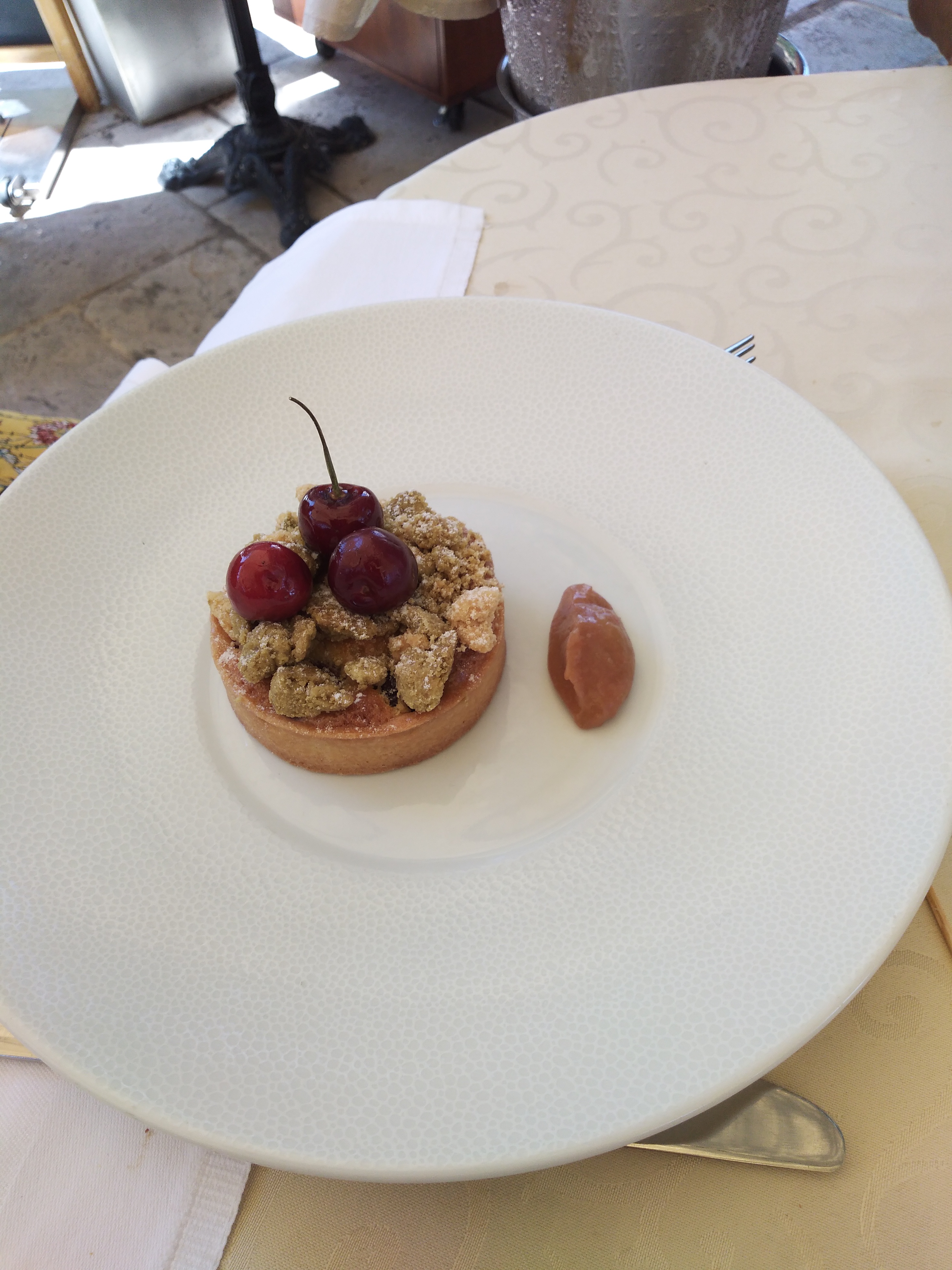 Quelle agréable surprise! Vous avez probablement visité des restaurants dans des lieux touristiques, où vous payez une sorte de droit d'entrée pour vous asseoir et profiter du paysage, alors que la nourriture est moins importante et mieux ignorée. Ce n'est PAS un tel endroit. Même si la vue depuis la terrasse est tout simplement époustouflante, vous oublierez les environs une fois la nourriture arrivée. Toutes les assiettes étaient bien présentées, distinctement, mais pas exagérées. Les entrées ainsi que les plats principaux étaient extrêmement savoureux. Il convient de noter, compte tenu de la qualité du restaurant et de la nourriture, que les portions étaient également généreuses. Comme le menu du midi est au prix attractif à 29€ et que 10€ de plus vous offre le menu gourmand, impossible de résister aux desserts. N'essayez même pas, sinon vous passeriez à côté d'une œuvre d'art, comme la surprise au citron. Quelle expérience fabuleuse - ça vaut le coup de venir à Gassin juste pour manger ici.