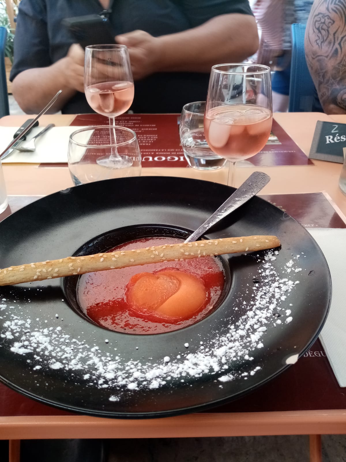 Une belle découverte dans les petites rues de Nyons. Un gaspacho de pastèque 🍉 délicieux ,suivis d'une souris d'agneau miel romarin un pur régal et pour finir le café gourmand 😋 Sans oublier le vin rouge le Melano,parfait pour accompagner les plats . Un restaurant familial ,le fils en cuisine et la maman au service . Merci à vous pour cette bonne soirée. Haumont .