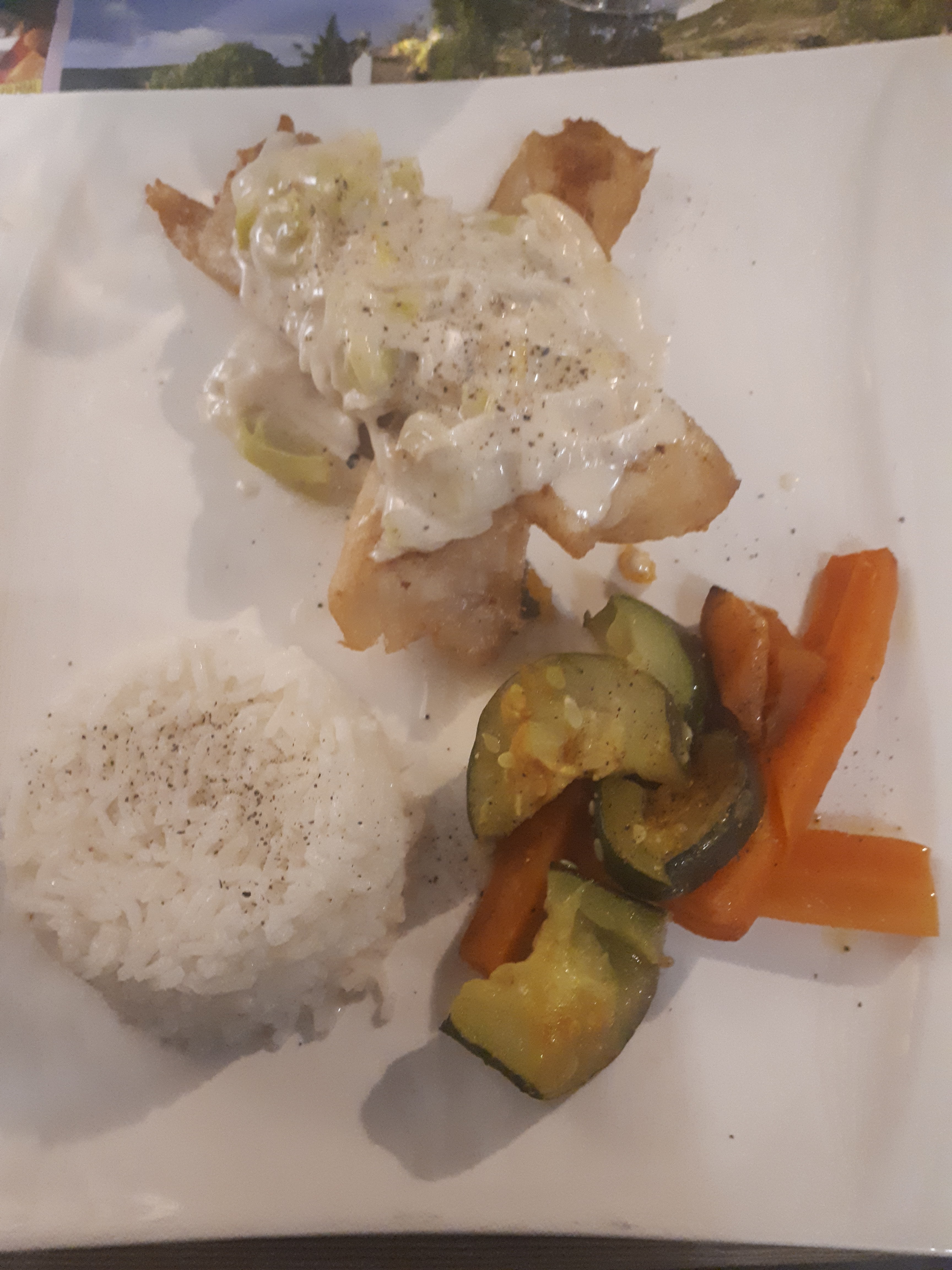 Le poisson du jour aux poireaux. Arrive dans l'assiette le poisson avec une endive et qq choux de Bxl. Les choux ?? On a du couper en 2 le truc noir dans l'assiette pour savoir ce que c'était!! Véridique! Digne d'un resto route et encore...alors pourquoi un 4,5??? Comprends pas??