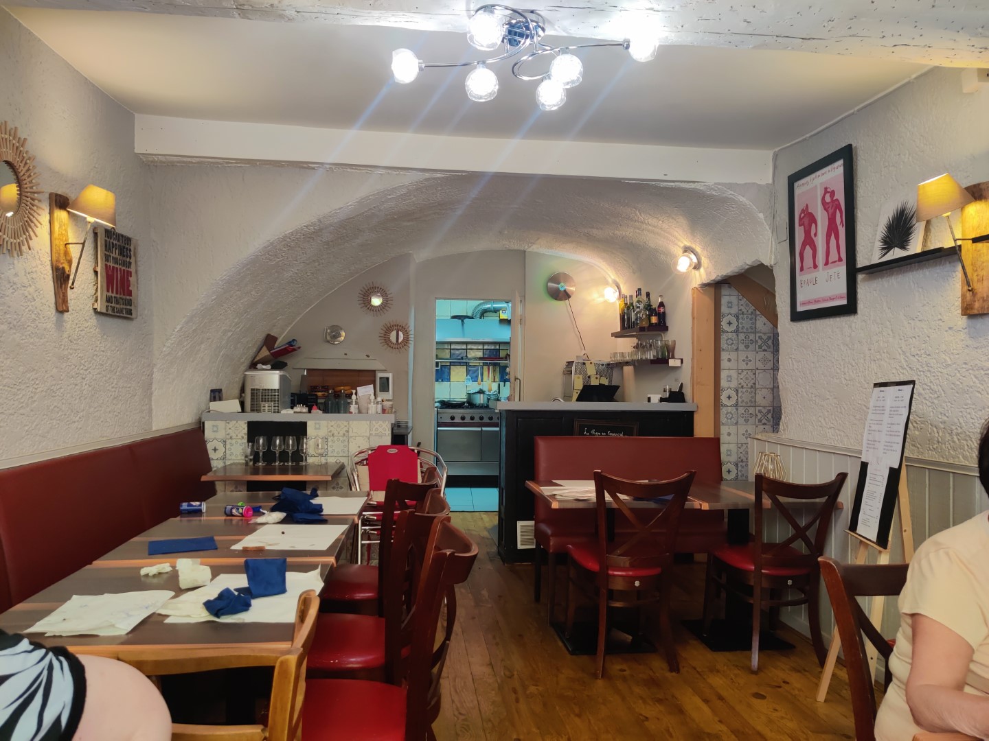 A voir tous ces jolis commentaires, nous avons dû tomber sur LA mauvaise journée !! En cuisine, une tartelette (chèvre, olive) qui se brise en 15 morceaux au premier découpage tellement elle est sèche et dur (industrielle), une mousse qui s’appelle plutôt chantilly. RIB’s de Porc ? un RIB’s sans os, ça s’appelle plutôt une tranche de lard non ? Depuis la salle ,on entend tellement les frites crier au contact de l’huile (trop chaude) que l’on connaît déjà leur tête avant l’arrivée sur table. En salle, 4 couverts en tout… il faut demander le pain, il faut demander 2 fois le verre de vin que l’on n’a jamais eu et, la serveuse qui remonte les tables en tenant 3 verres d’une main avec les doigts dedans !! Bref !!!