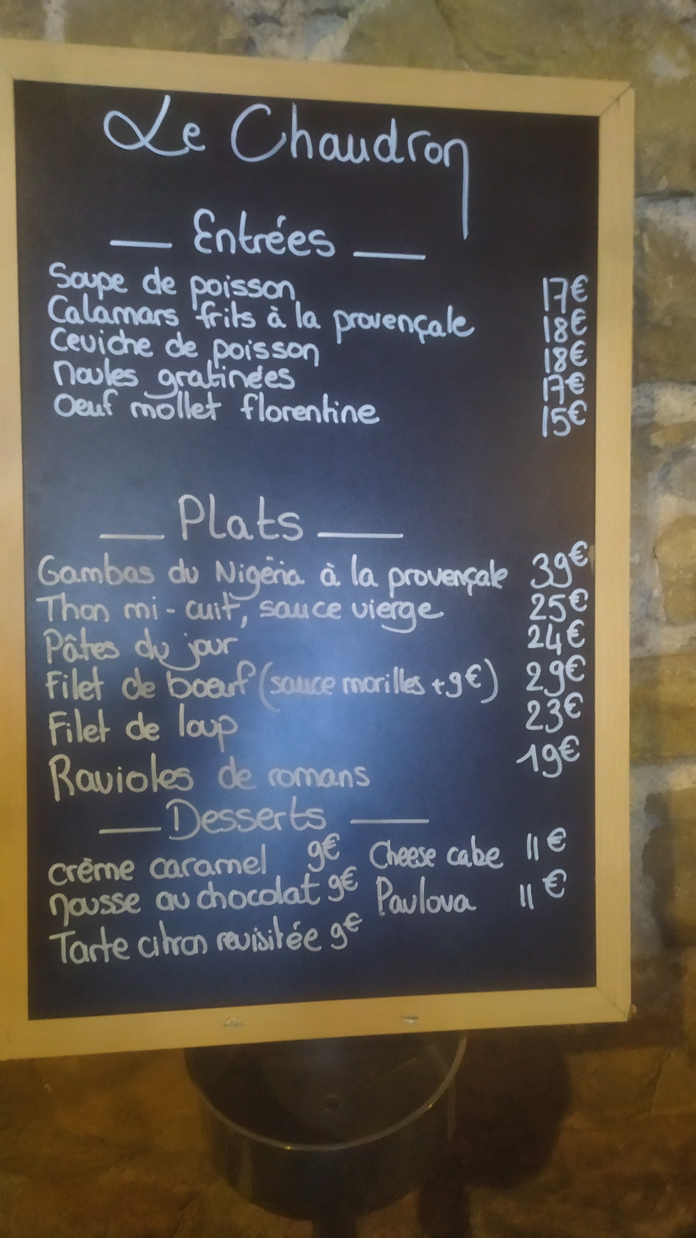 Déjeuner entre amis au Chaudron un dimanche. Nous avons été très bien reçus et servis promptement de l’apéritif jusqu’au café. La carte est simple et efficace et contient plusieurs spécialités provençales. Mention spéciale pour la mousse à la châteigne qui a fait l'unanimité du groupe tant par son goût fin et exquis que par sa texture légère et aérée. Un 5 étoiles amplement mérité ; le Chaudron est un restaurant chaleureux où l’on y mange très bien. Il ne faut pas passer à côté.