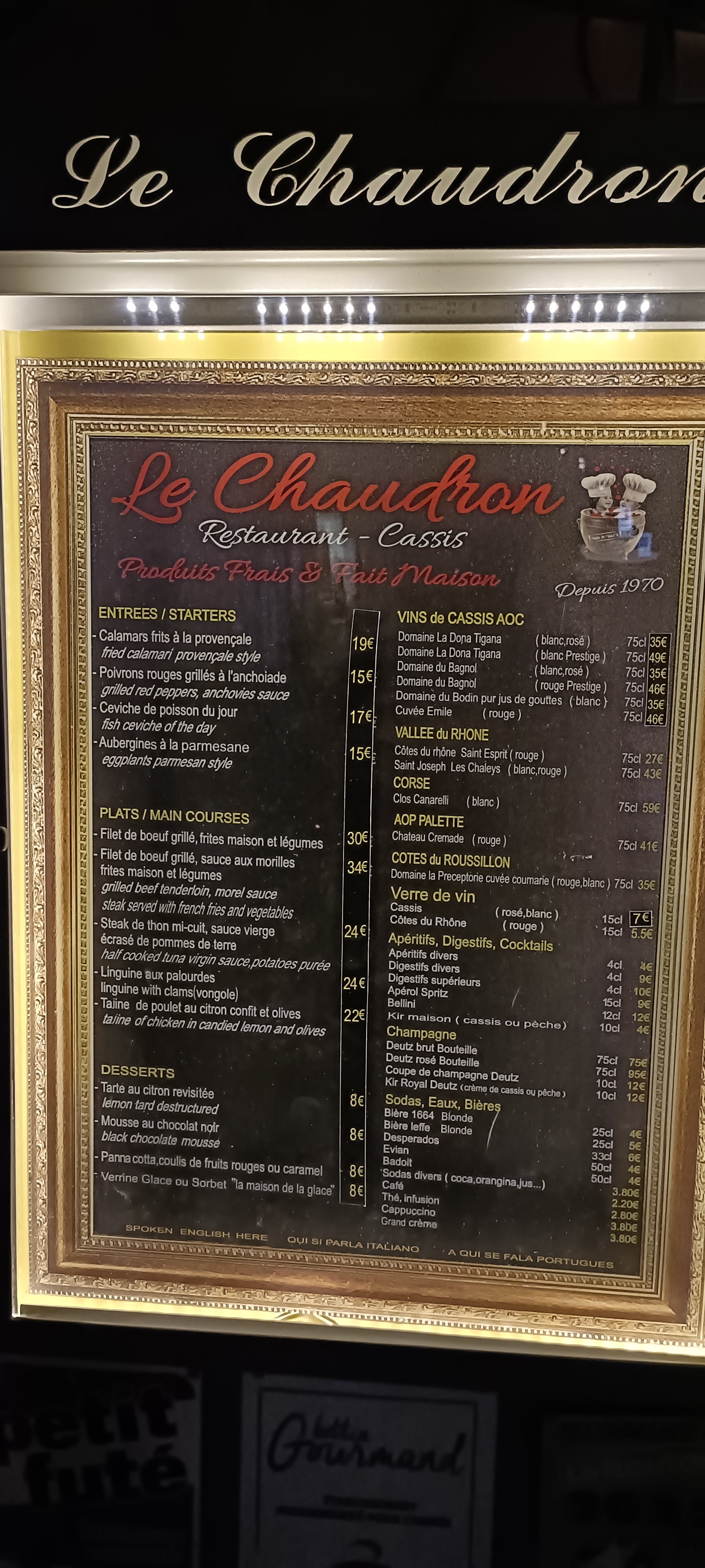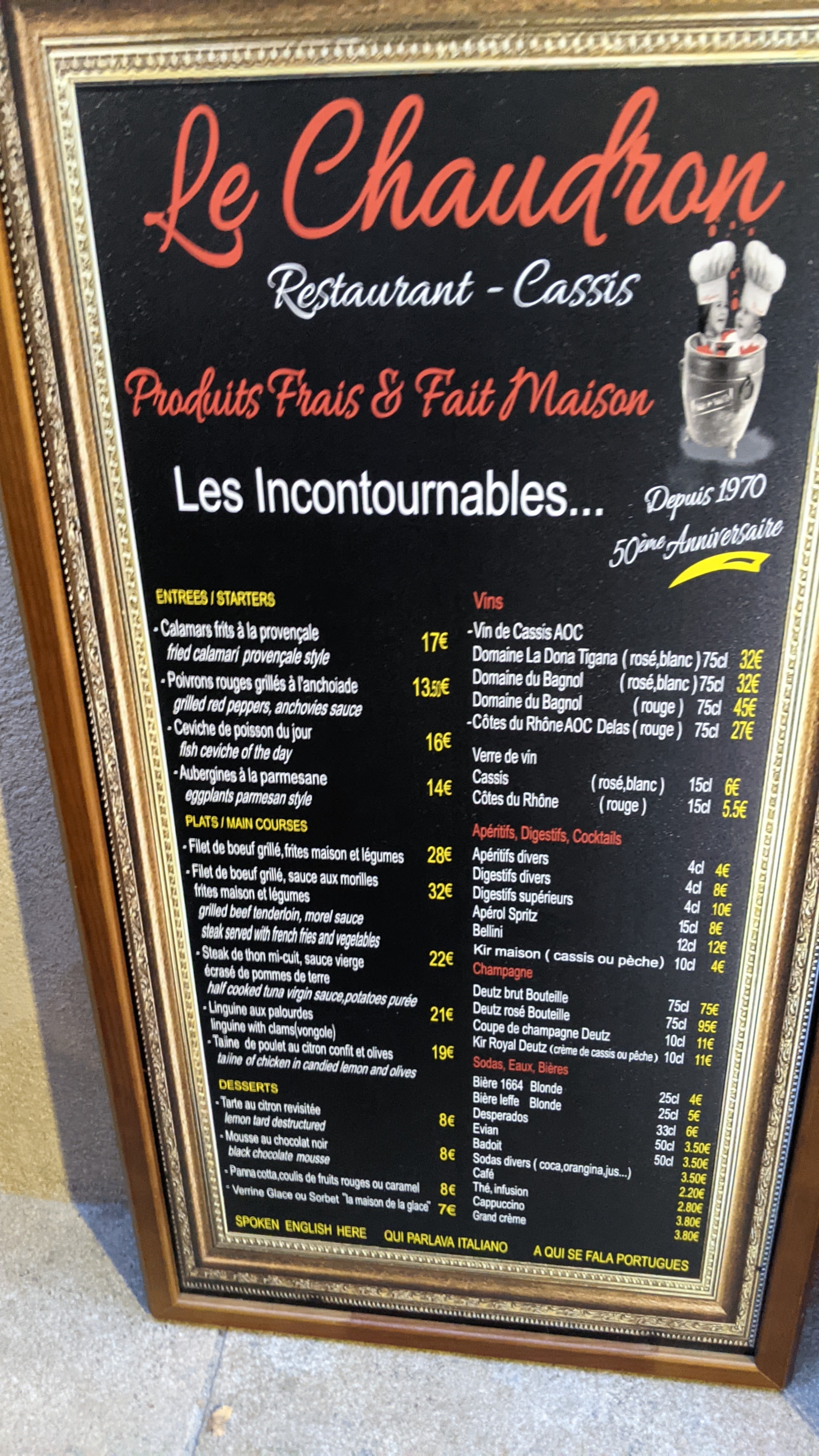 Nous sommes allés au Chaudron hier soir en réservation de dernière minute et nous avons été accueilli chaleureusement par Bernard ! La proximité avec les cuisines est très appréciable. C’est un restaurant intimiste où une ambiance bon enfant y règne. Mention spéciale à Momo pour ses très bons plats. On ne peut pas faire mieux pour commencer un séjour à Cassis :) Nous reviendrons pour entendre les anecdotes du gérant et goûter aux beignets de courgettes Les lyonnais !