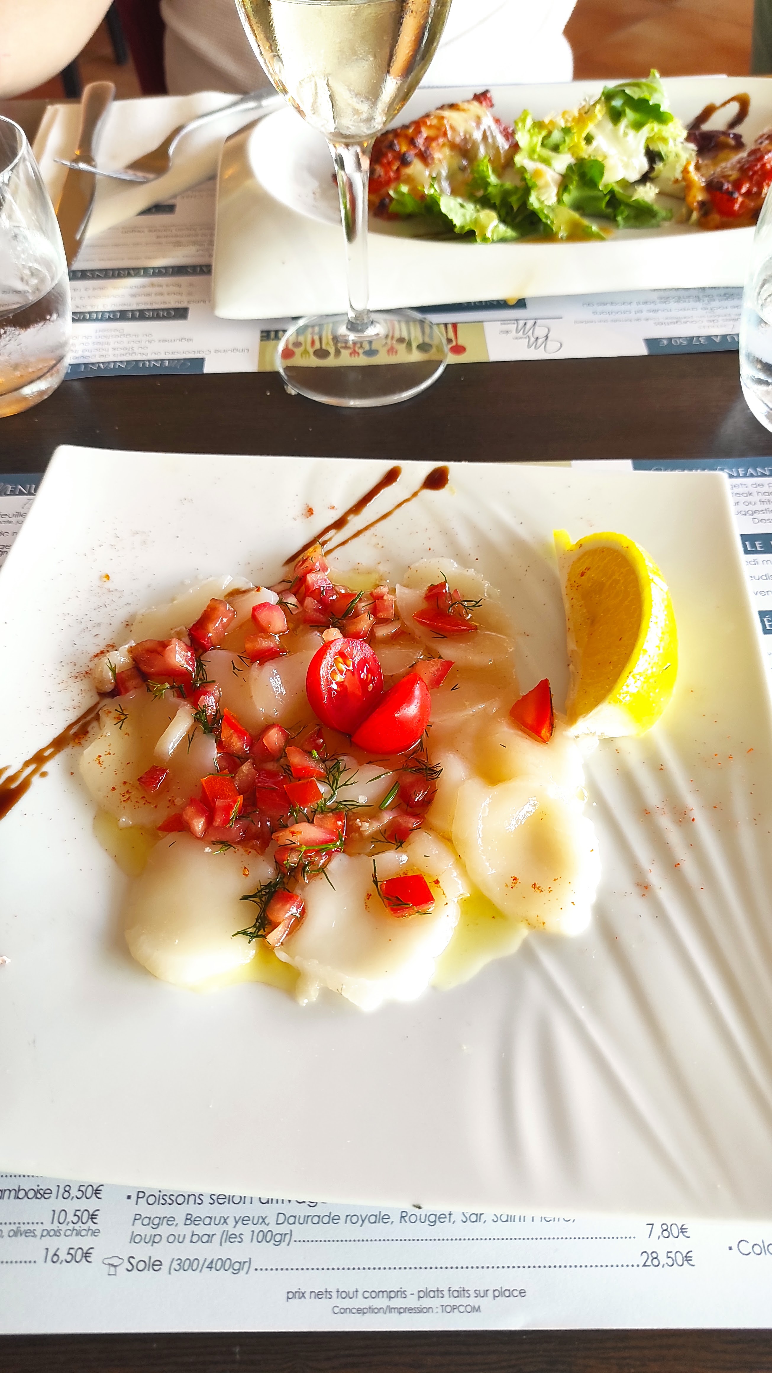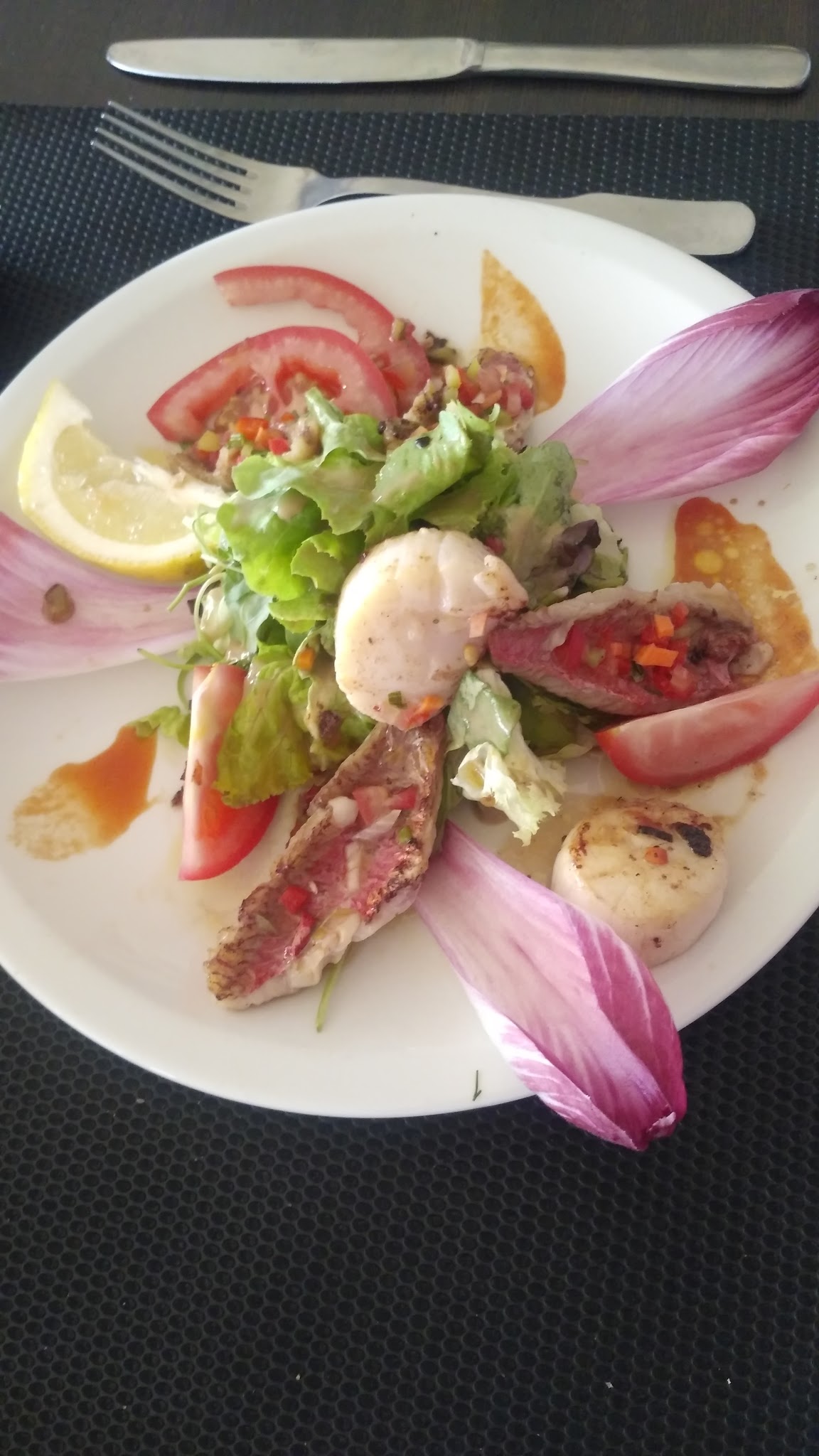 Le restaurant dispose d'une vue magnifique ! Nous avons bénéficié de l'arrivage poisson du jour : saint Jacques en entrée et Dorade grise en plat qui se sont glissés dans le menu.. Un vrai régal !