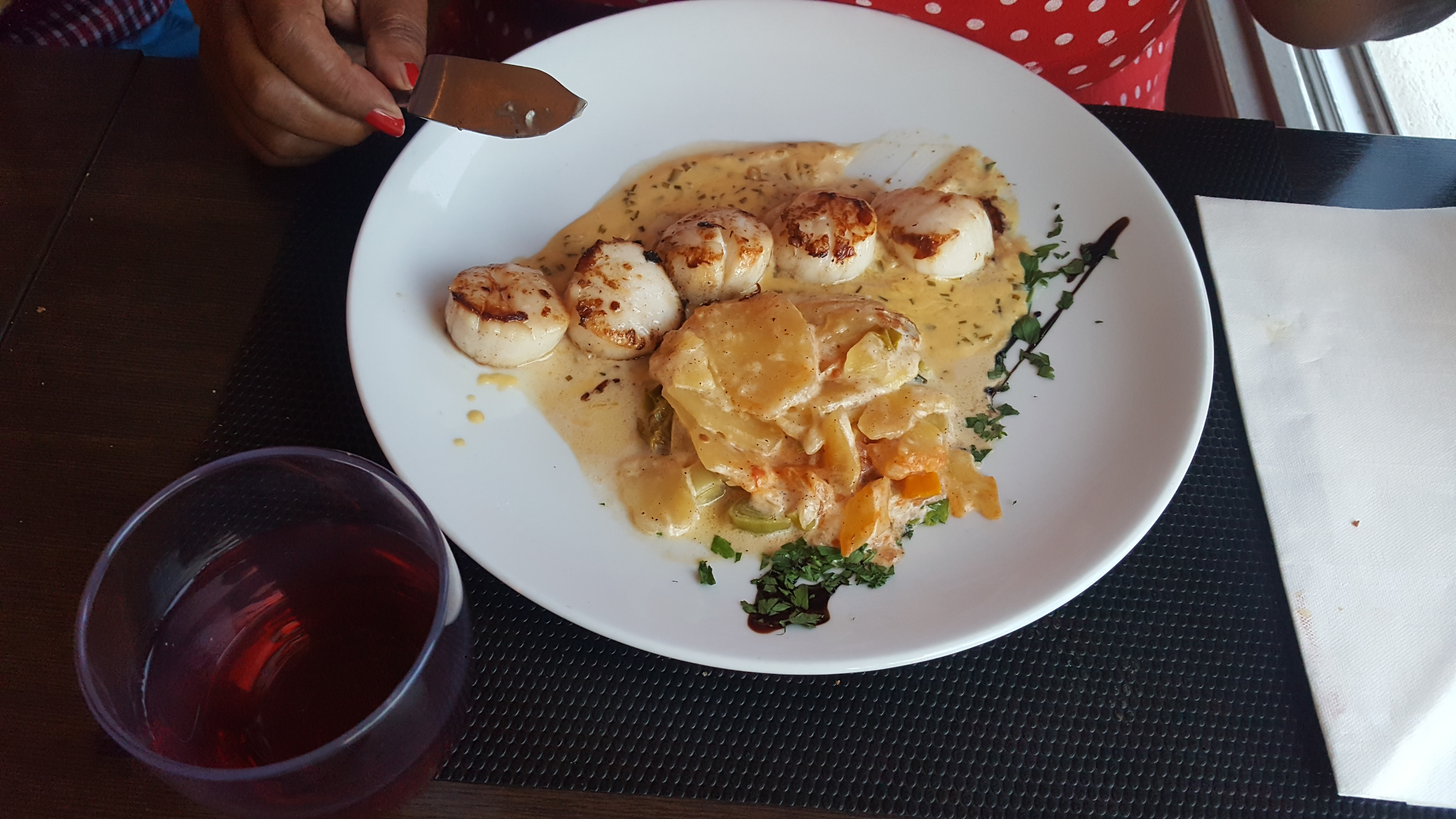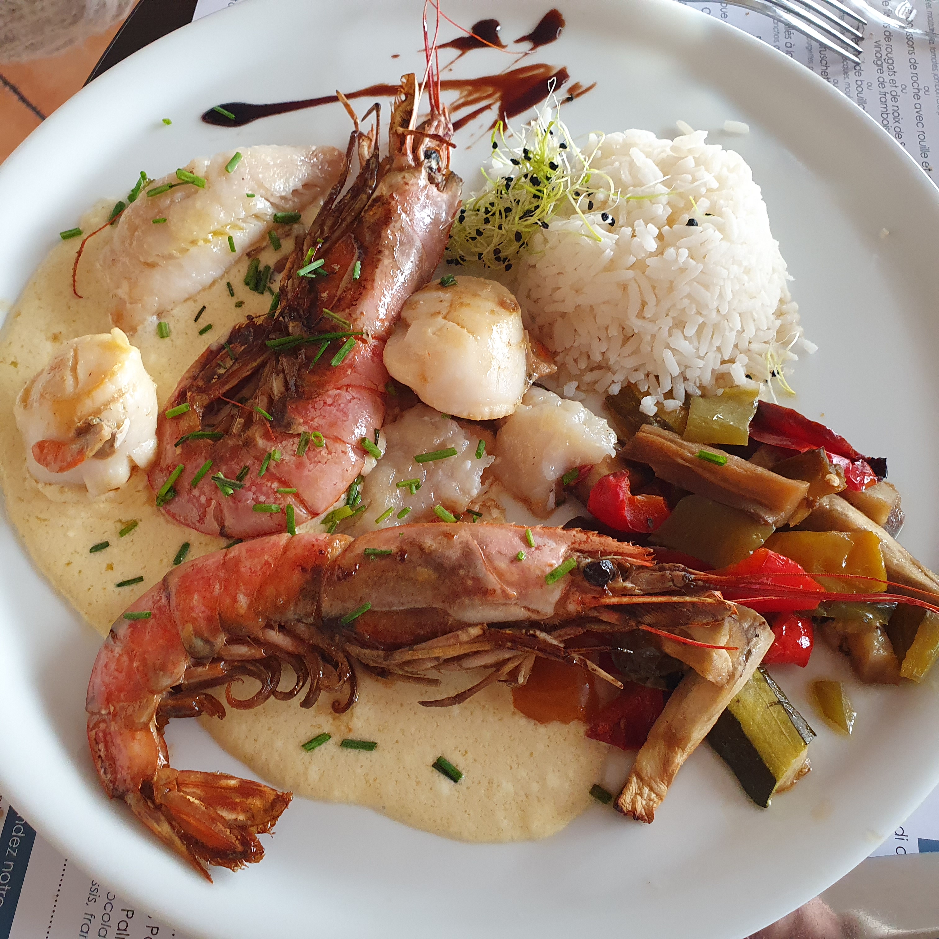 Mix grill de la mer…. Que dire, le plat est tout juste une entrée 2 petits bouts de poissons 2 st Jacques qui se perdent dans l assiette et 2 gambas. Quantité insuffisante. Au vue des tarifs pratiques c est décevant.