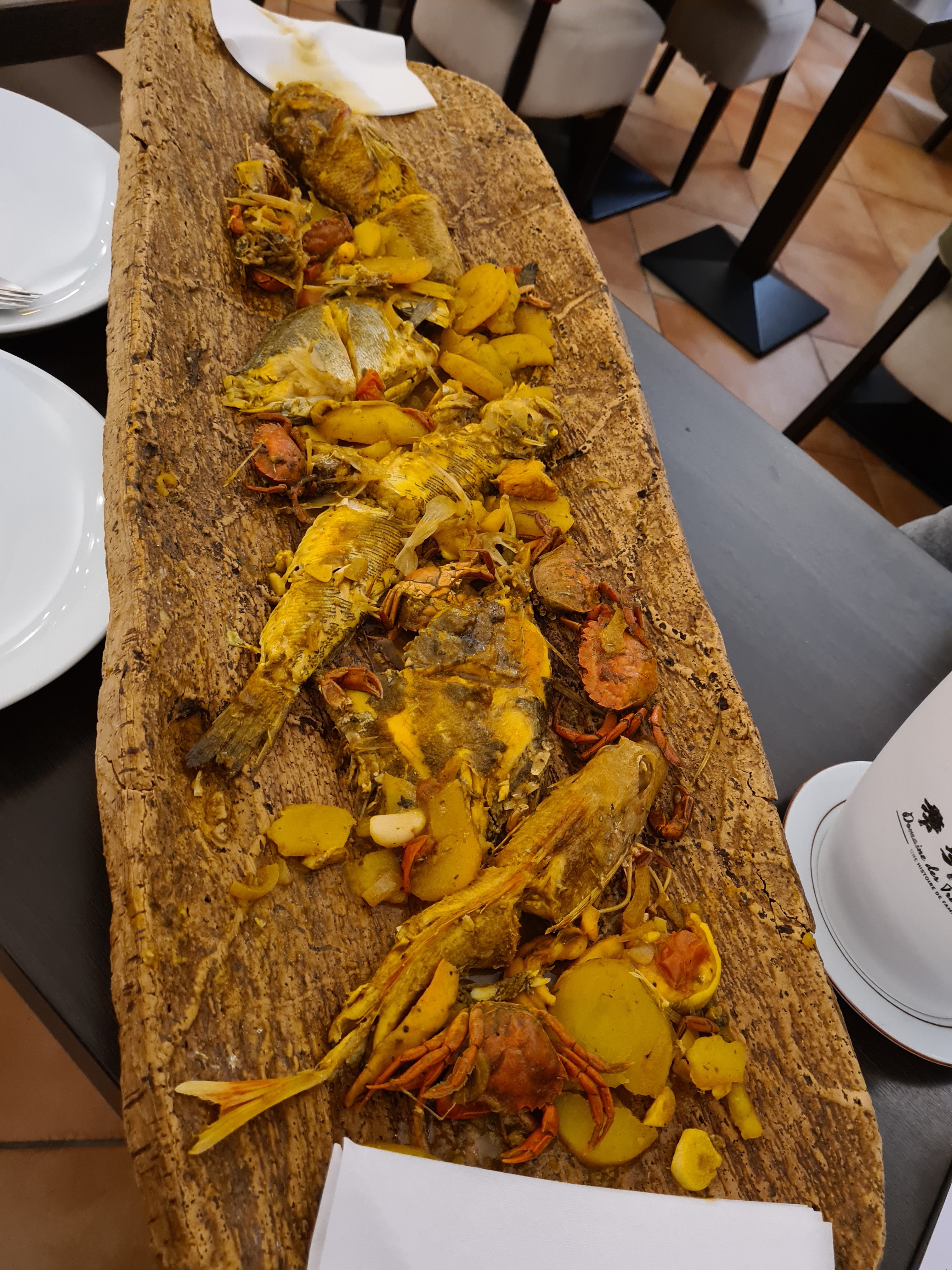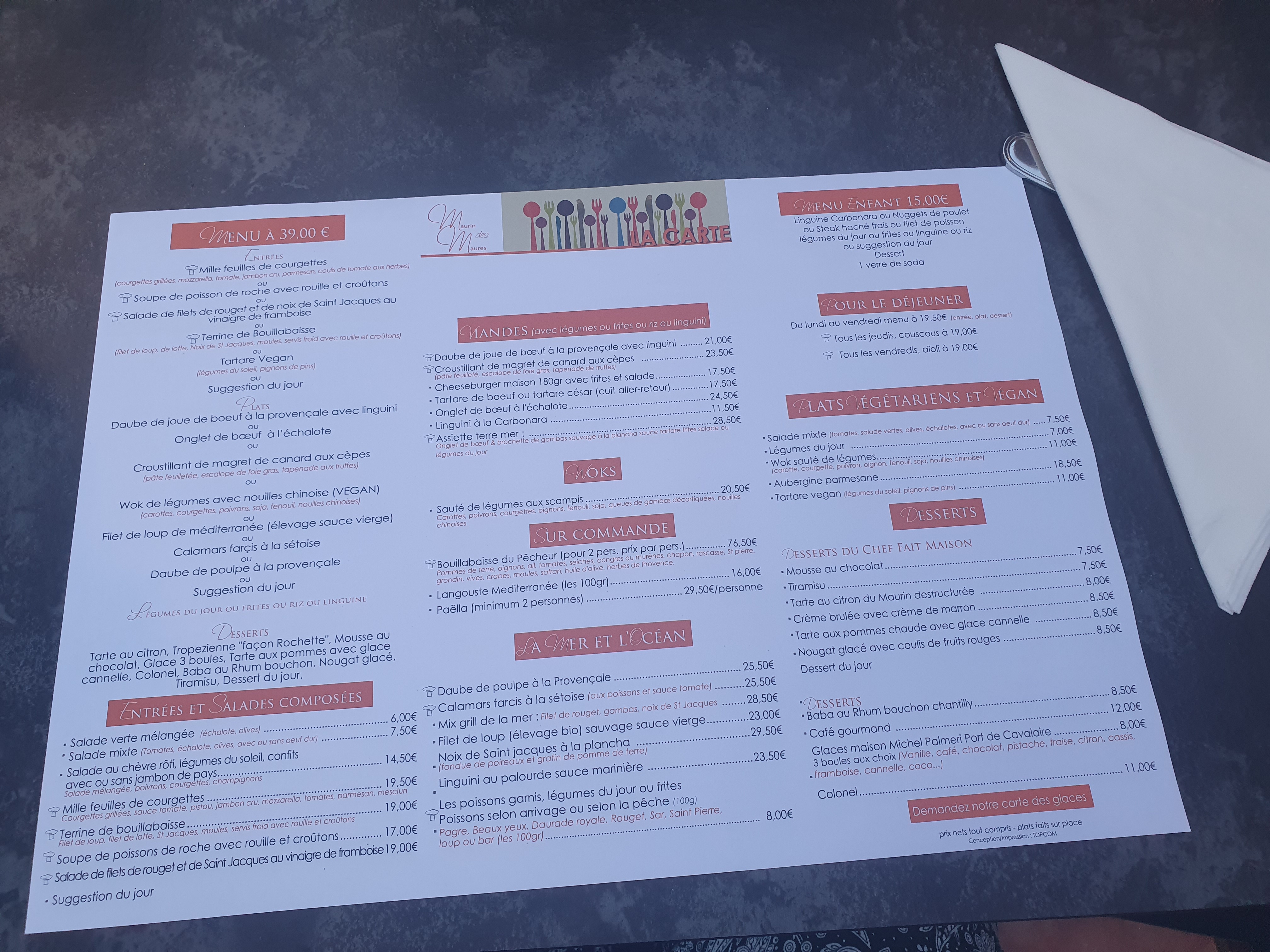 Nous avons commandé 2 soupes de poisson à emporter. Elles étaient bonnes mais sincèrement sans plus. Par contre, mon mari en allant les chercher n'a pas fait attention au prix. Nous avons payé 33€ pour 2 portions, alors que sur le site du restaurant Maurins des Maures le prix est affiché à 13.50 la portion soit 6€ de plus pour les 2 portions !!!!