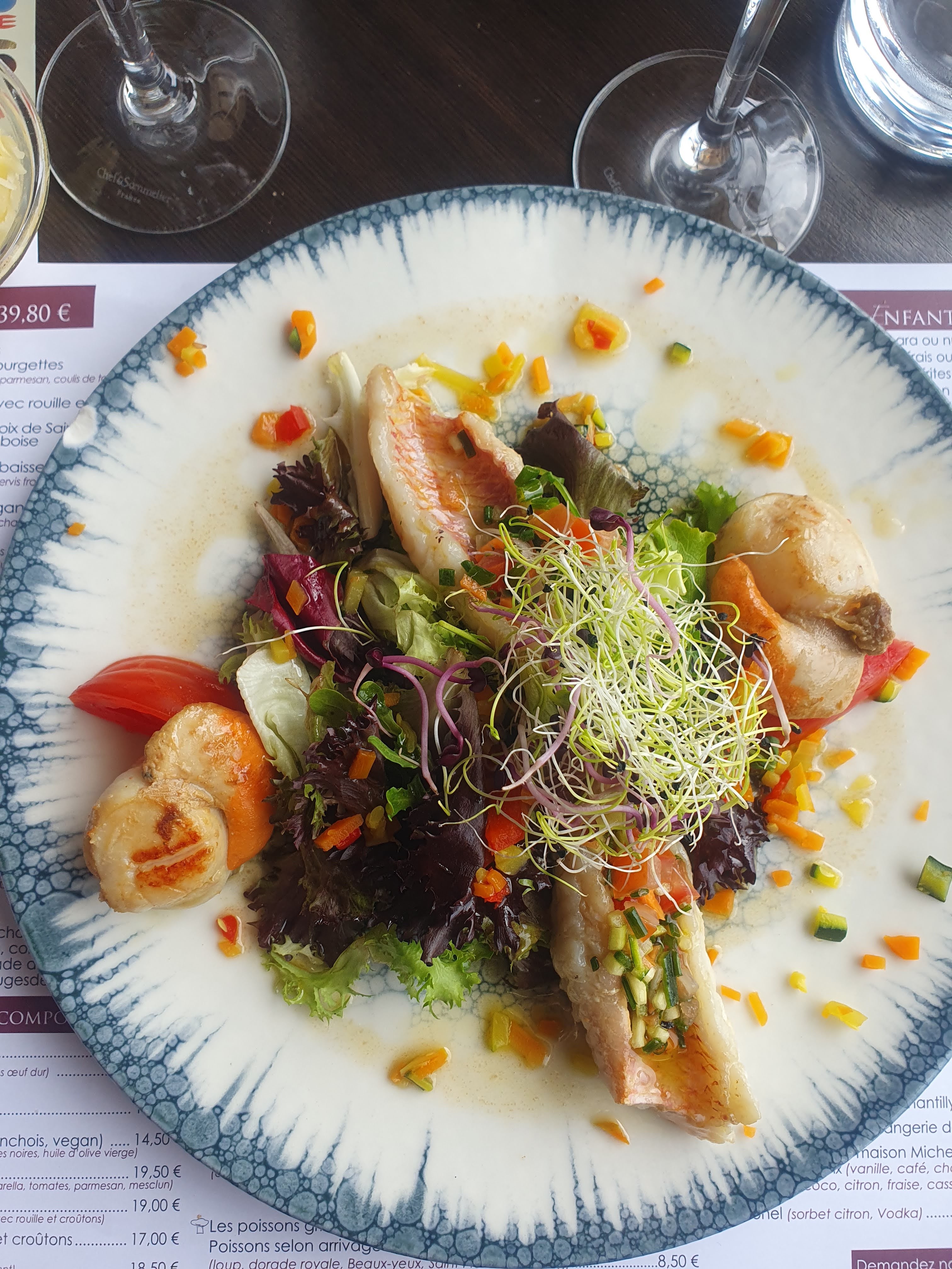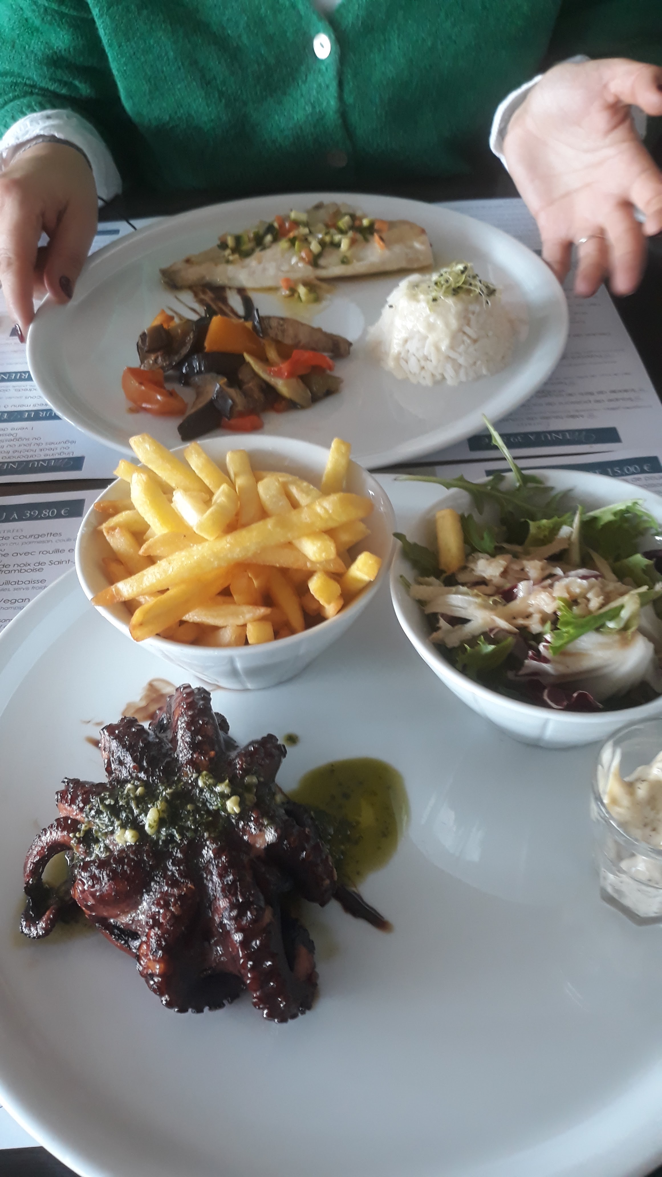 Je suggère fortement à prendre le Menu à 39,50€ Voici ce que j'ai choisi: Entrée: salade de filets de rouget et de noix de saints Jacques au vinaigre de framboise Plats : poulpe à la plancha Desserts : crème brulée avec crème de marrons Vin: rosé Service et cuisine délicieuse Faites vous plaisir
